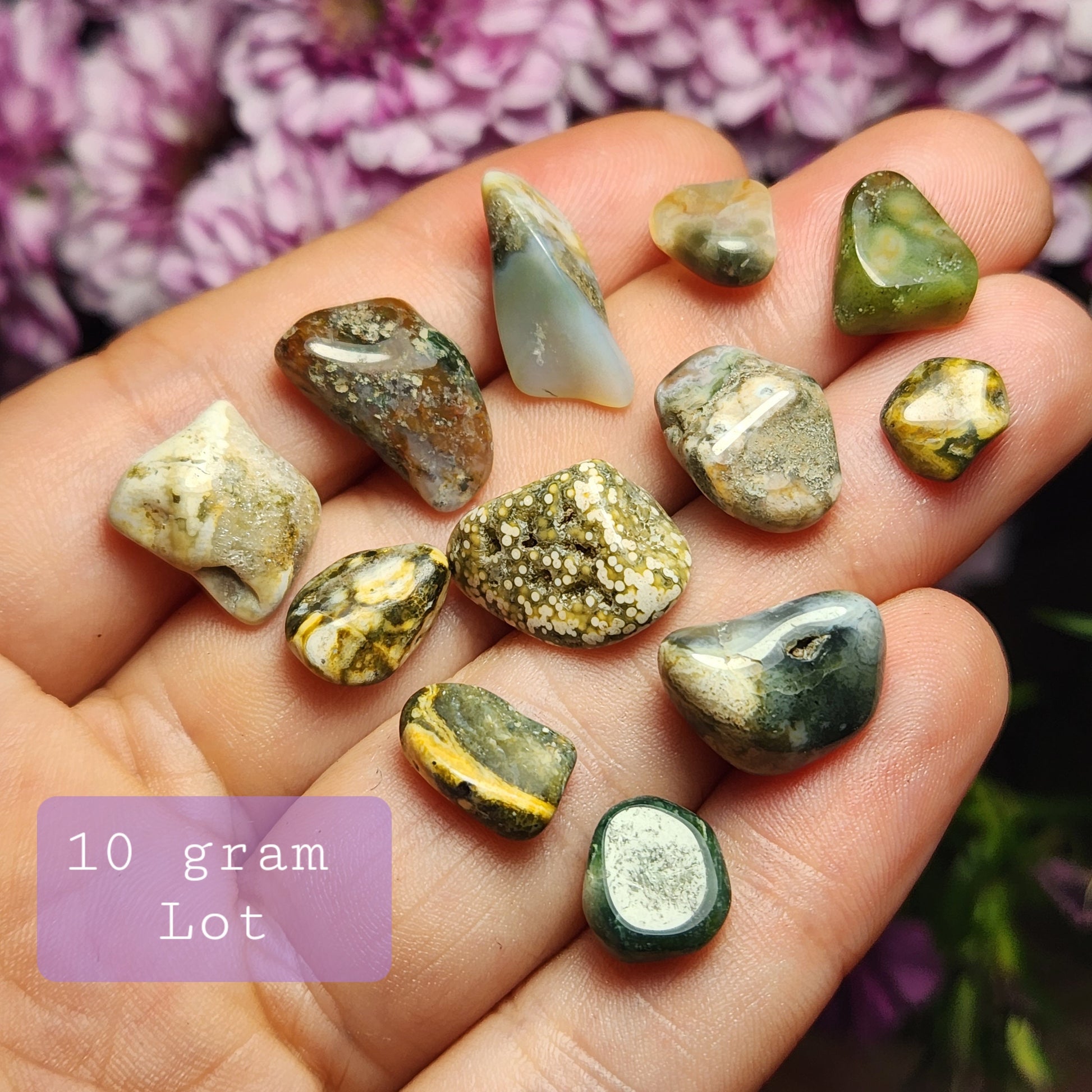 Ocean Jasper are pieces of fossilized coral, you can even see the little circles where the coral used to be! These tumbled Ocean Jasper stones come in a variety of shapes and colors. The orbicular patterns covering each one is completely unique and creates mesmerizing patterns! We will lovingly create a 10 gram lot, each containing 10+ individual stones that measure approximately between 5mm and 20mm.