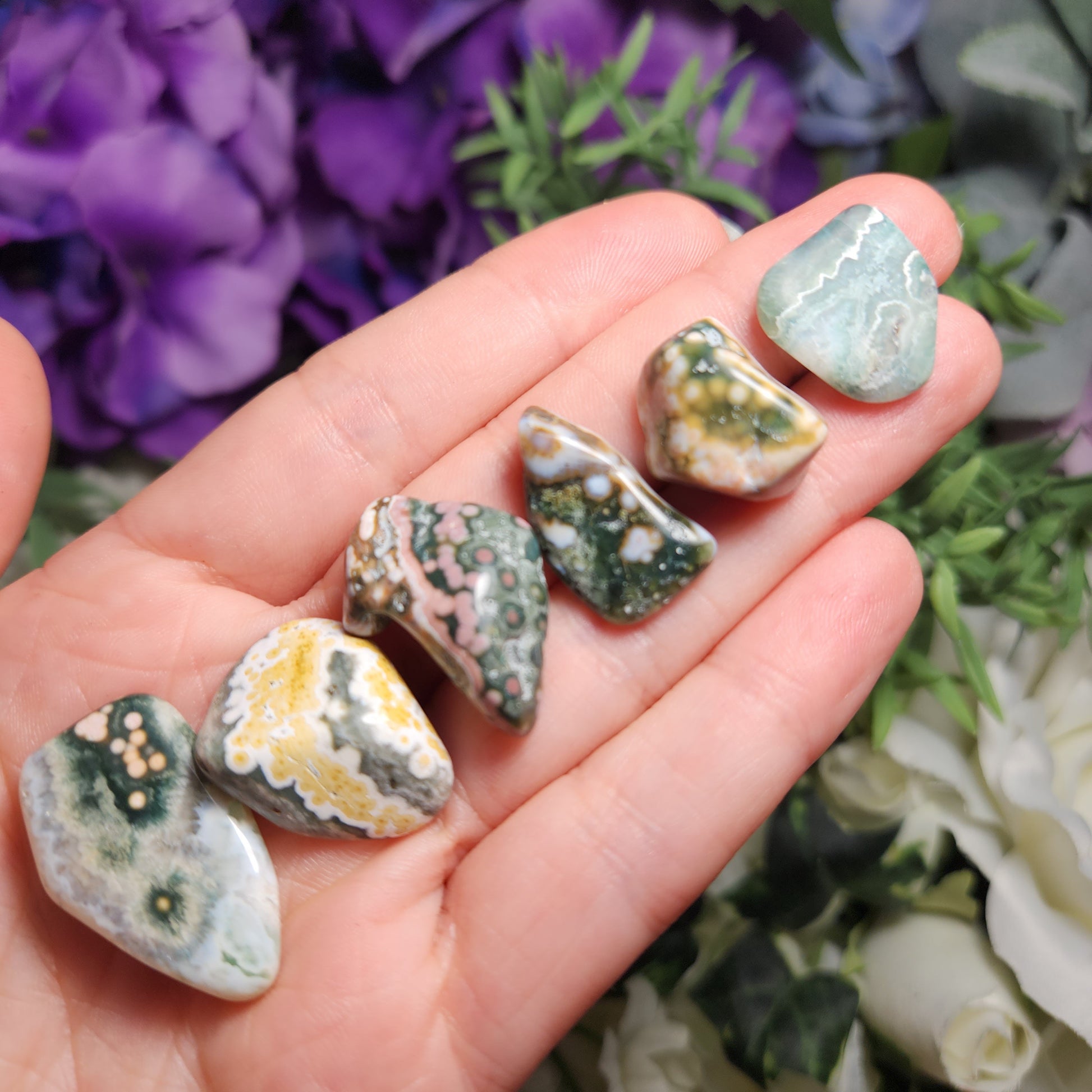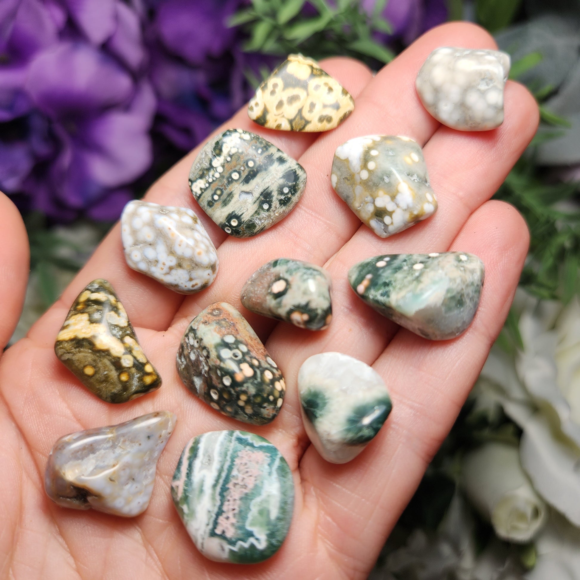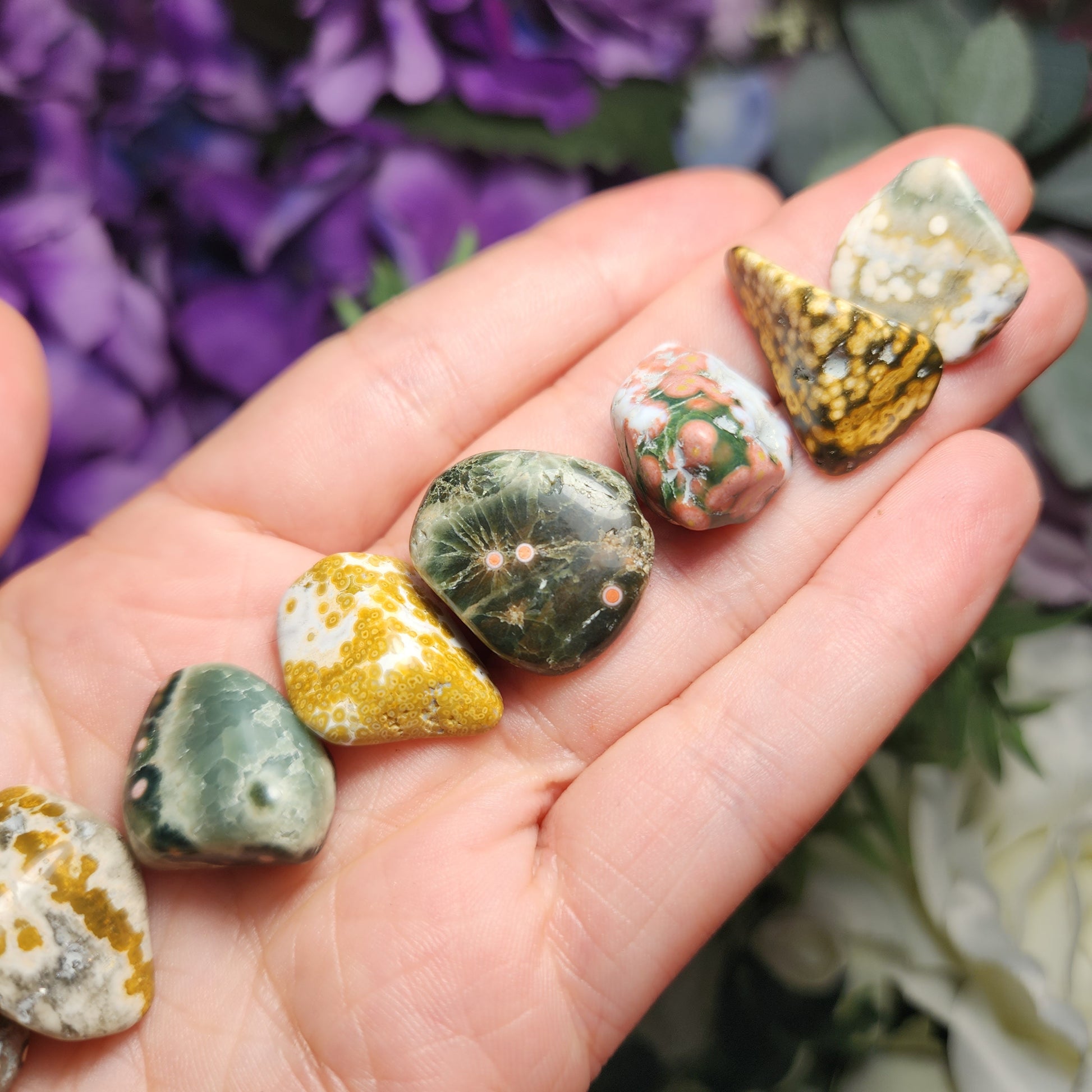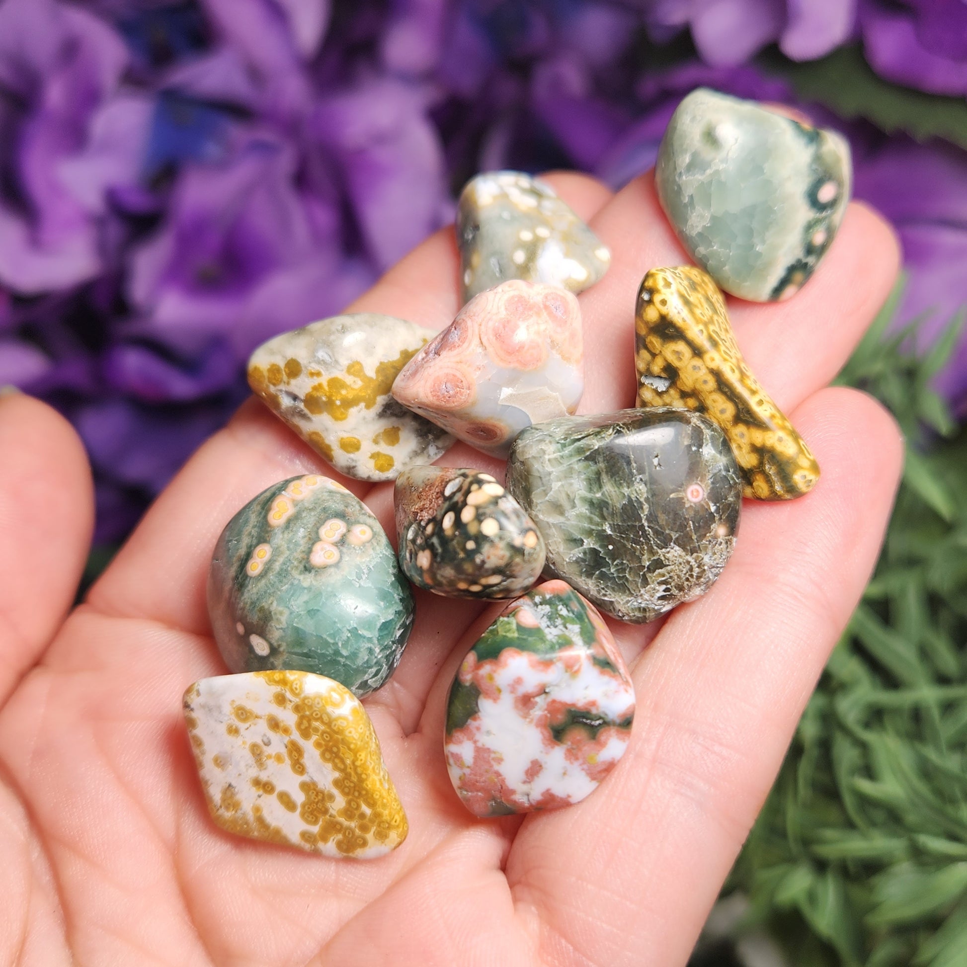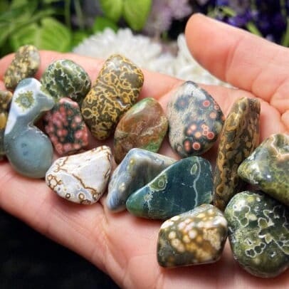 Ocean Jasper are pieces of fossilized coral, you can even see the little circles where the coral used to be! These tumbled Ocean Jasper stones come in a variety of shapes, colors, and patterns. Each piece can be expected to have its own unique look.