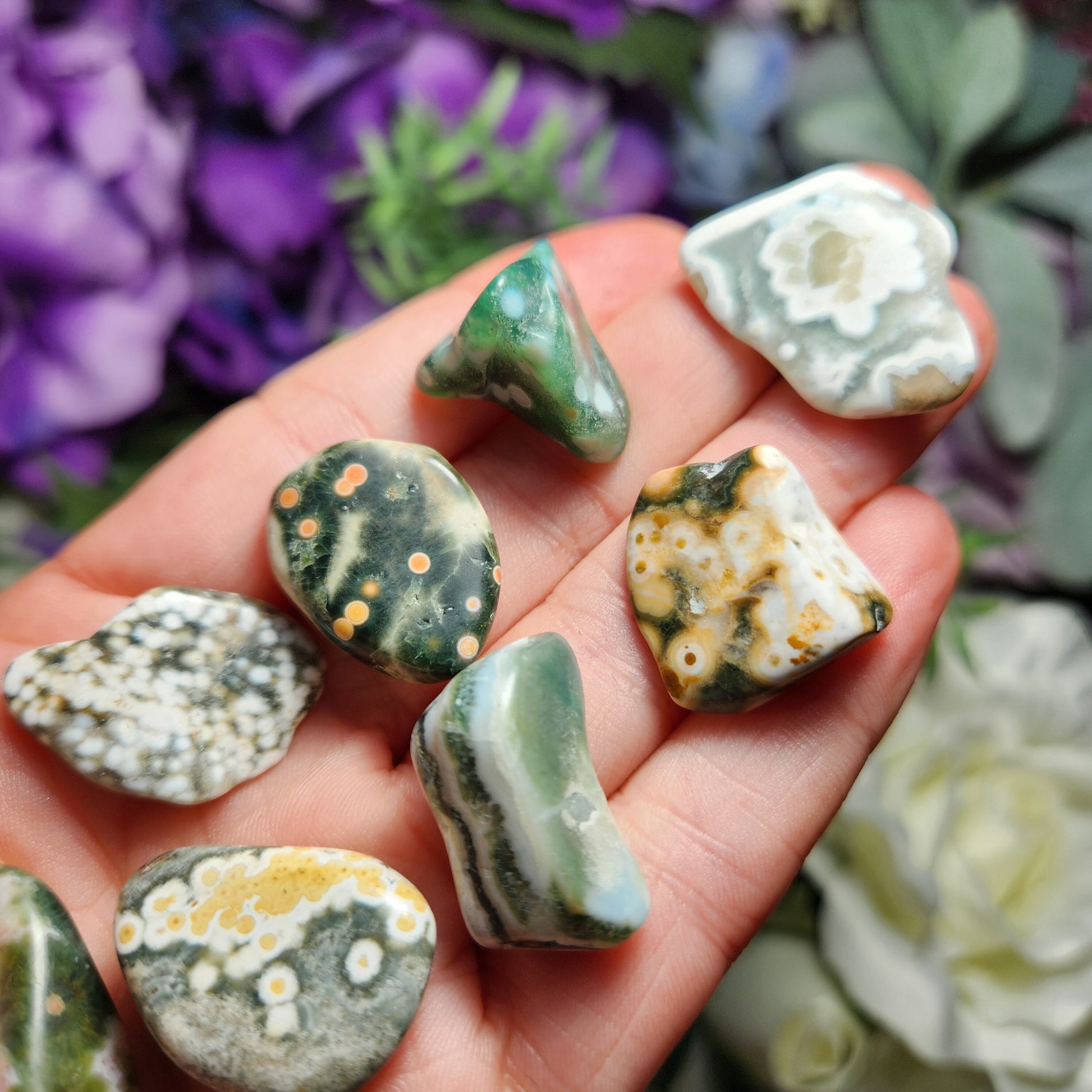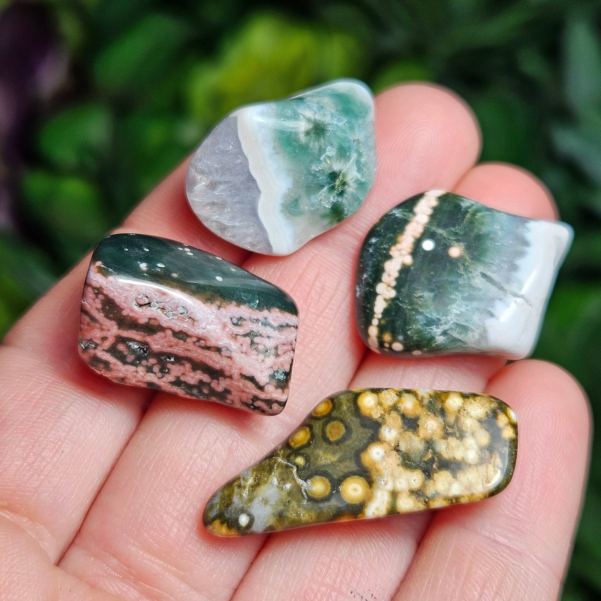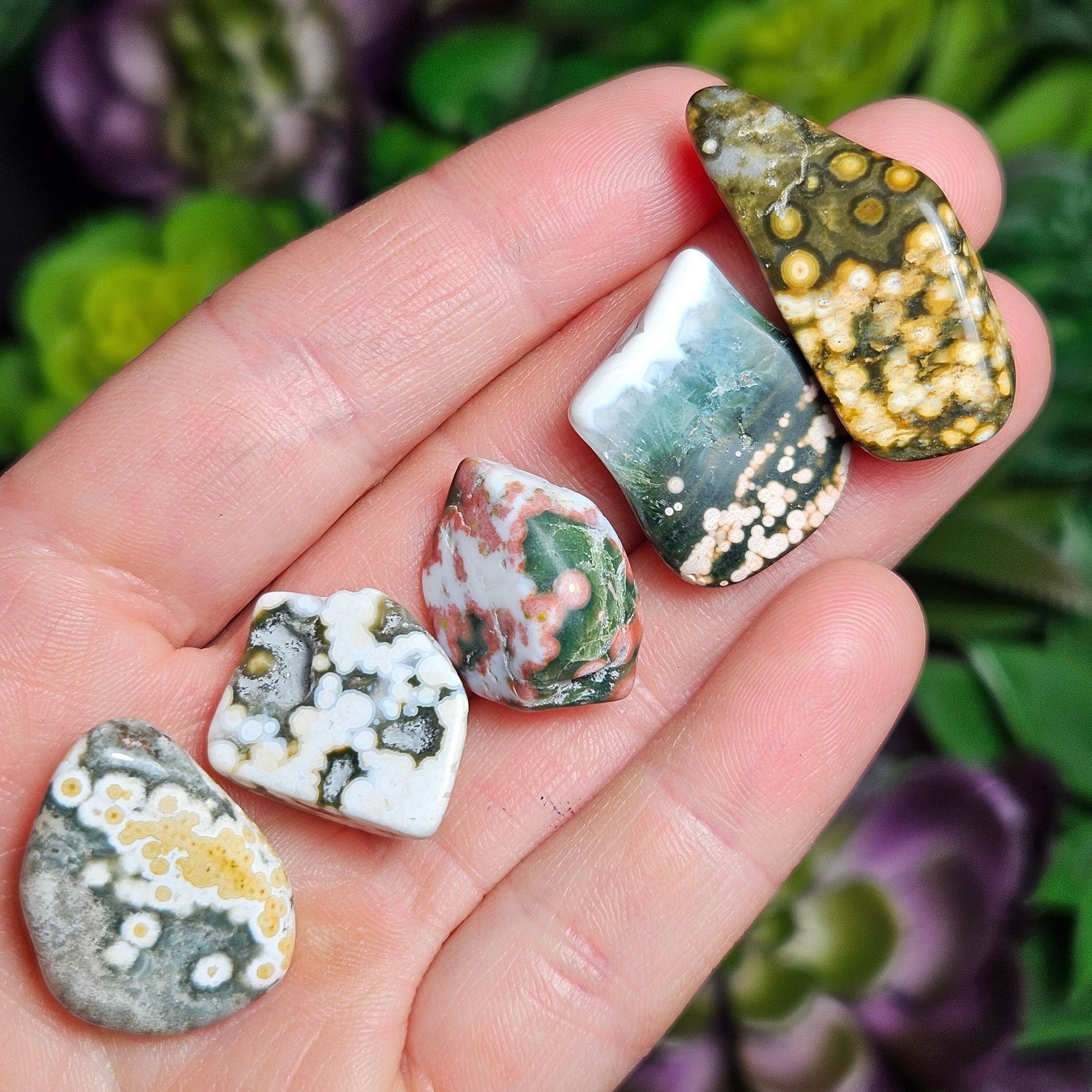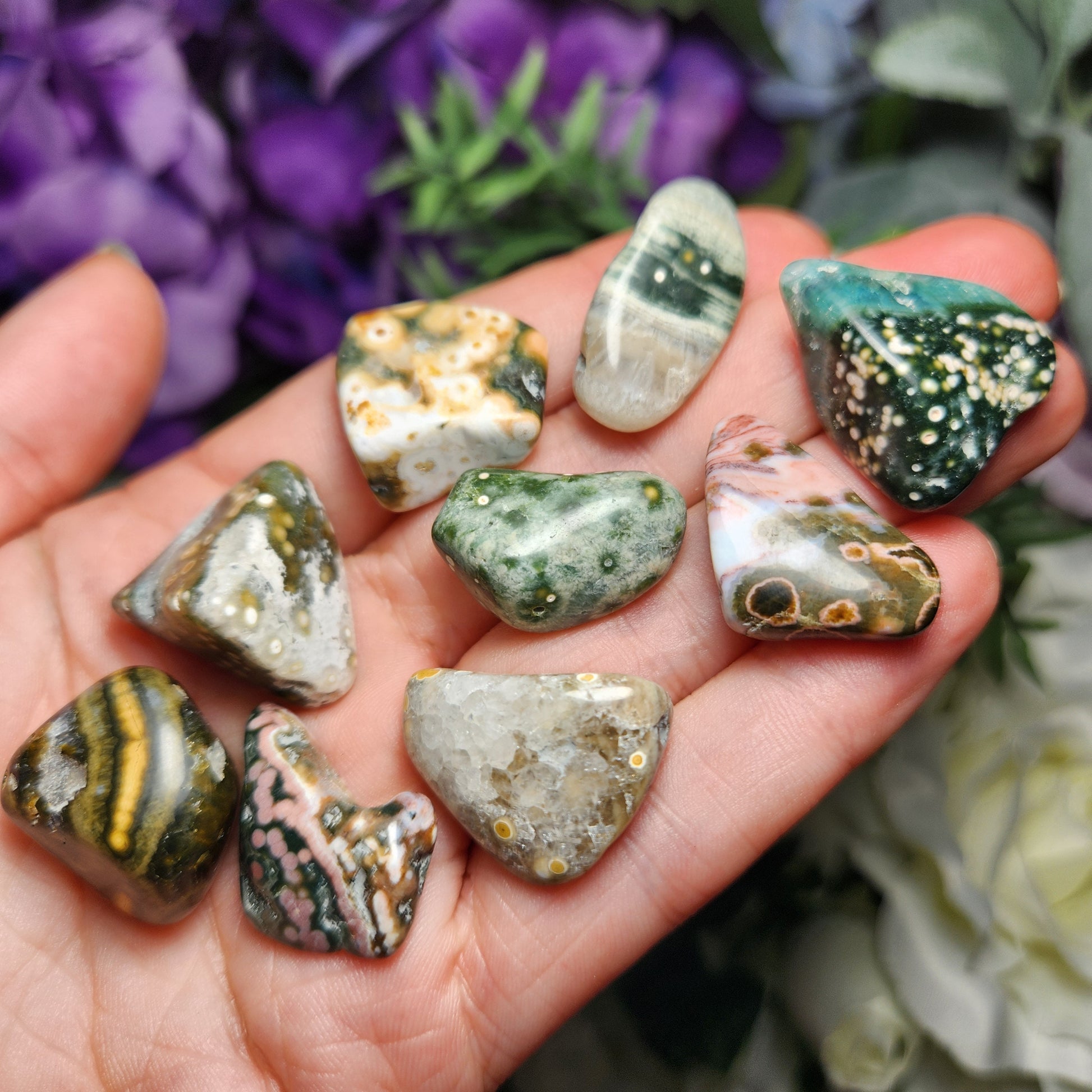 Ocean Jasper are pieces of fossilized coral, you can even see the little circles where the coral used to be! These tumbled Ocean Jasper stones come in a variety of shapes, colors, and patterns. Each piece can be expected to have its own unique look.