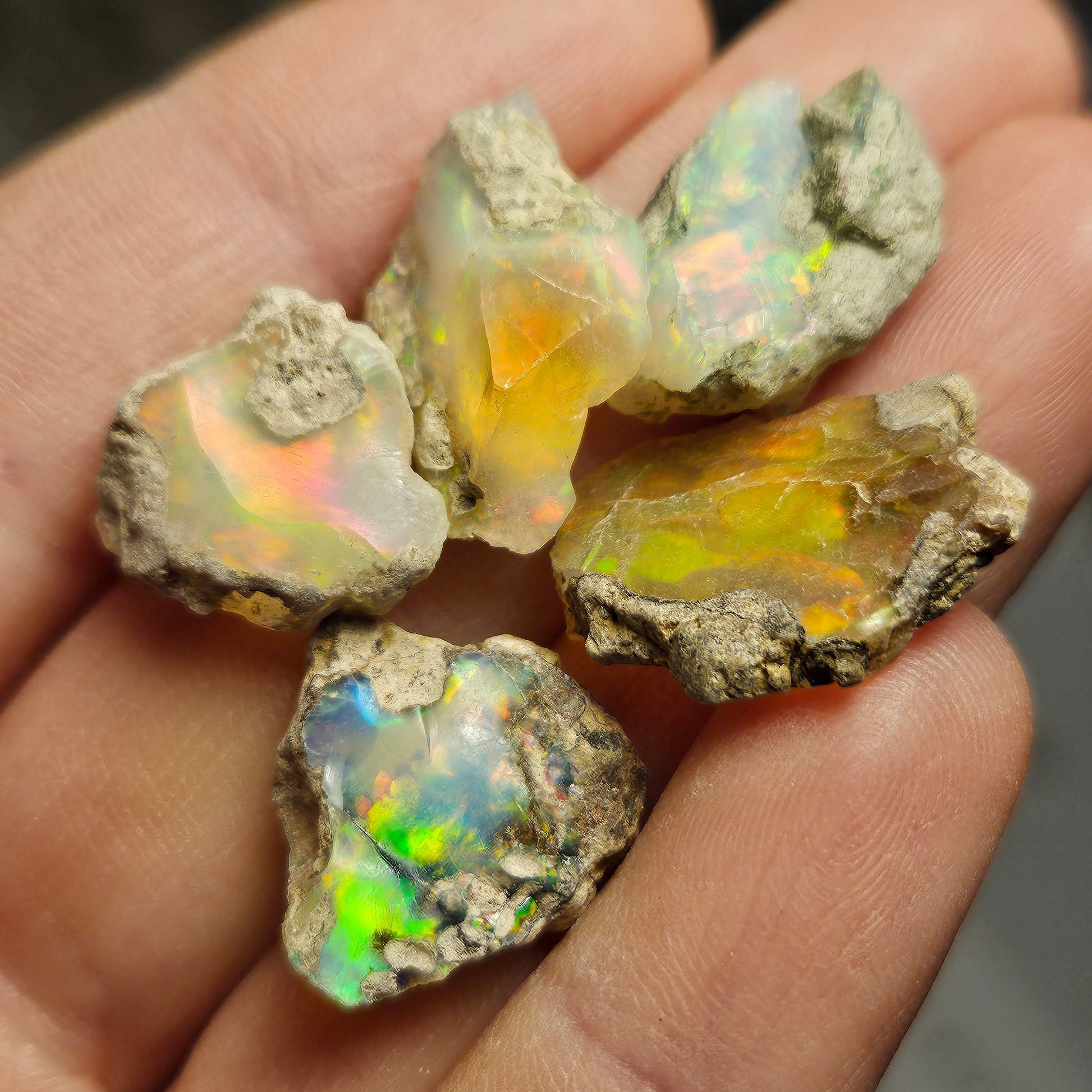Each of these shimmering raw Opal specimens have been individually selected for their flash and color. They range in a rainbow of colors and freeform shapes. These Opals have some rough areas where the nodules were embedded in the ground and residual clay residue, which is normal for Opals of this variety.