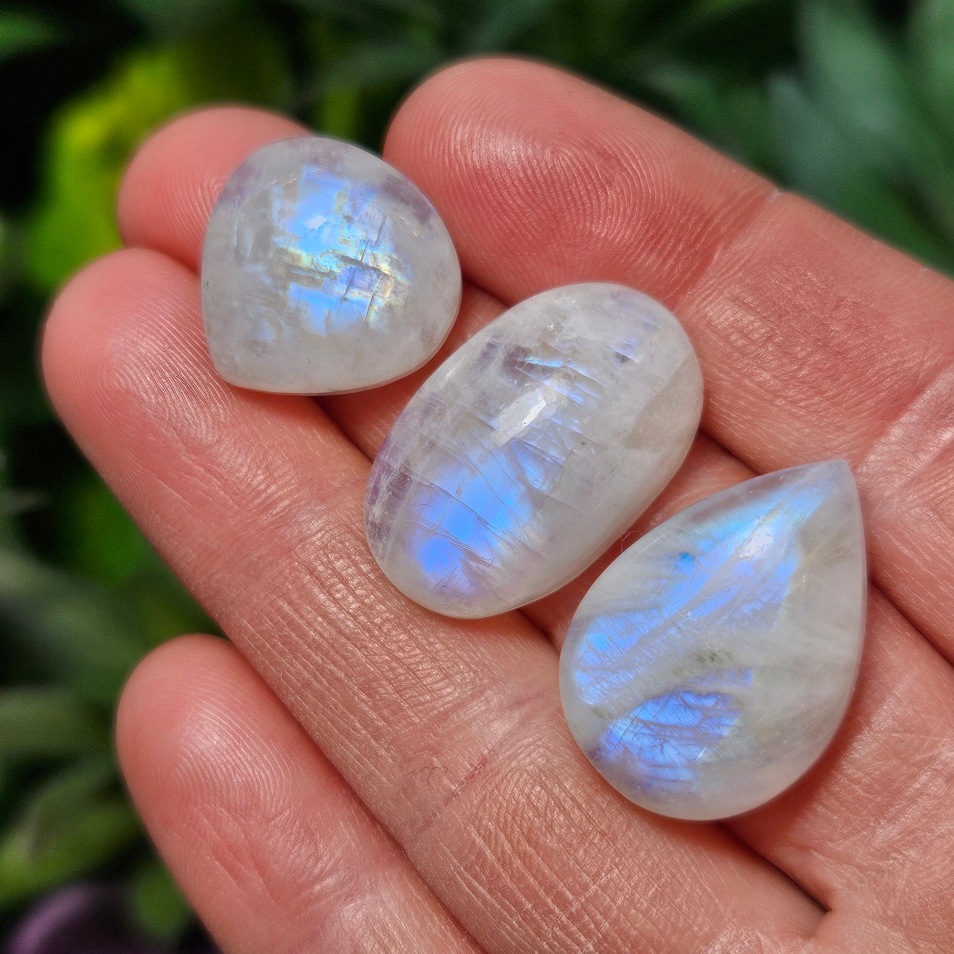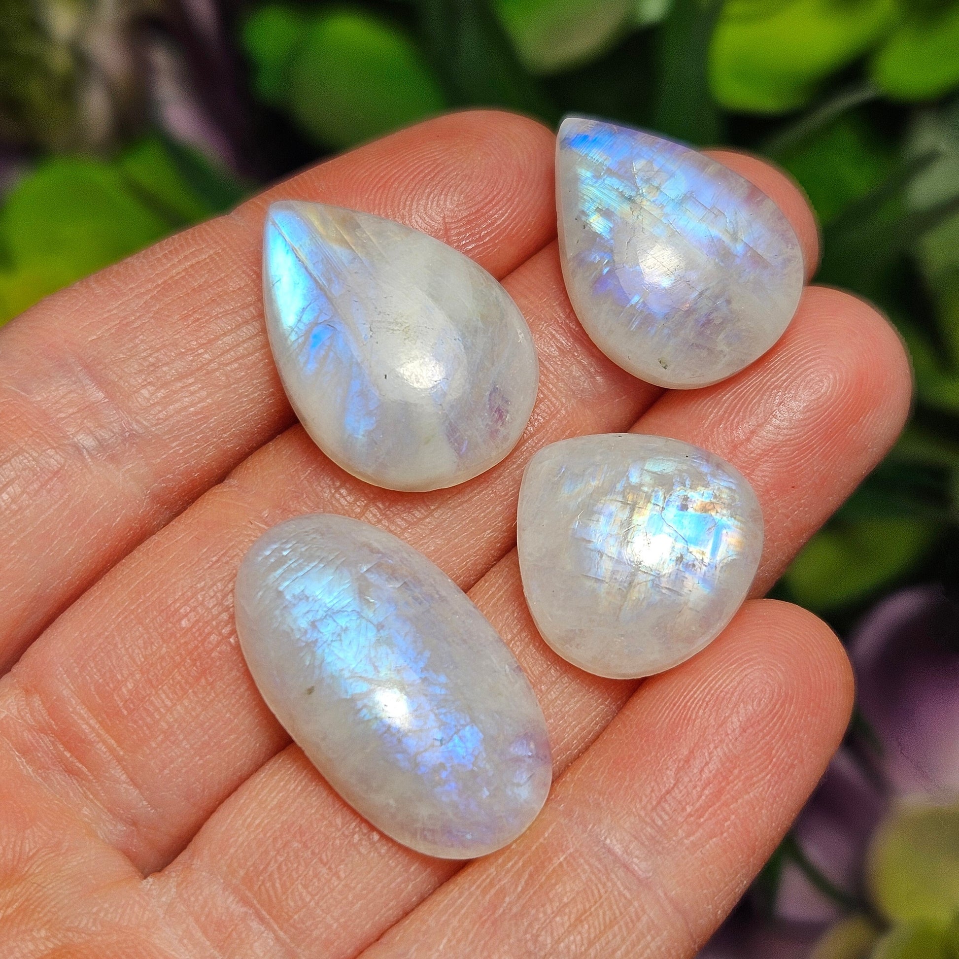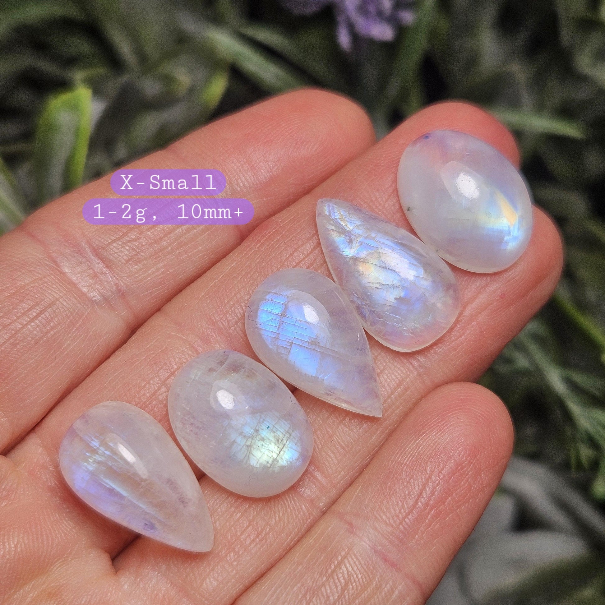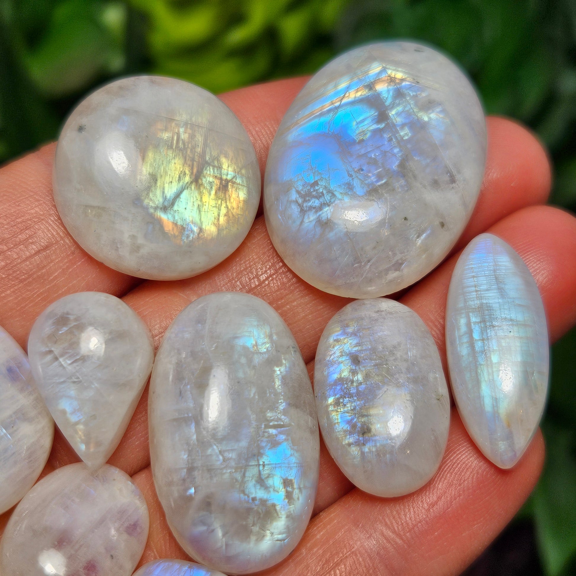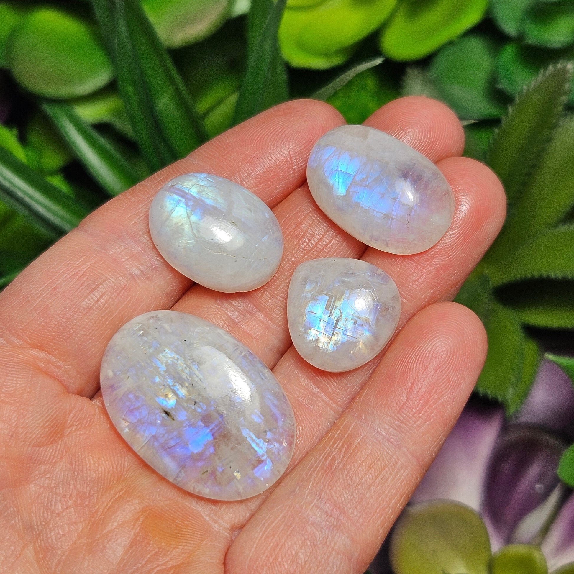 These high-quality Rainbow Moonstone crystals have a milky translucence that glows when backlit. These stones have been hand-carved into cabochons in a variety of shapes and polished to a high sheen. They reveal brilliant flashes of color when held at an angle. Each specimen will have its own unique characteristics and a glowy chatoyance, classic to quality Rainbow Moonstone!