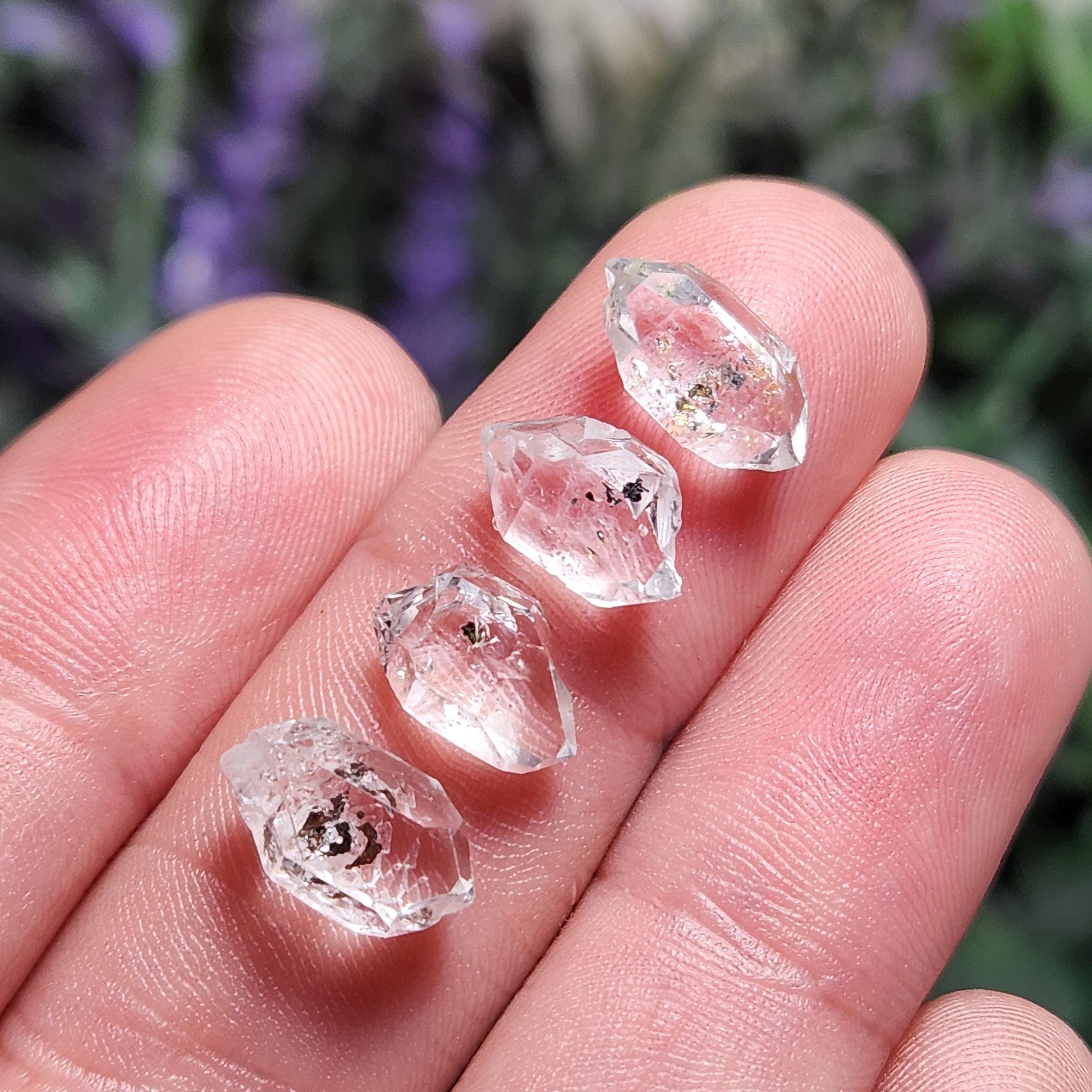 These high-quality Quartz crystals exhibit inclusions of black carbon as well as UV reactive petroleum. Each gemstone showcases natural single or doubly terminated faces or self-healed facets. Each has its own unique look, and glows with a colorful, saturated brilliance when under a black light - a rare quality in the mineral kingdom!