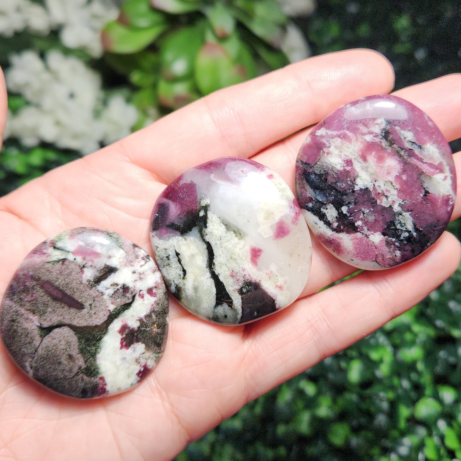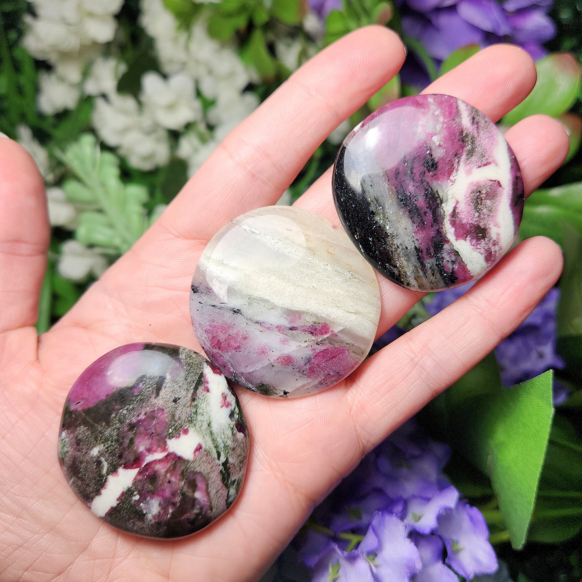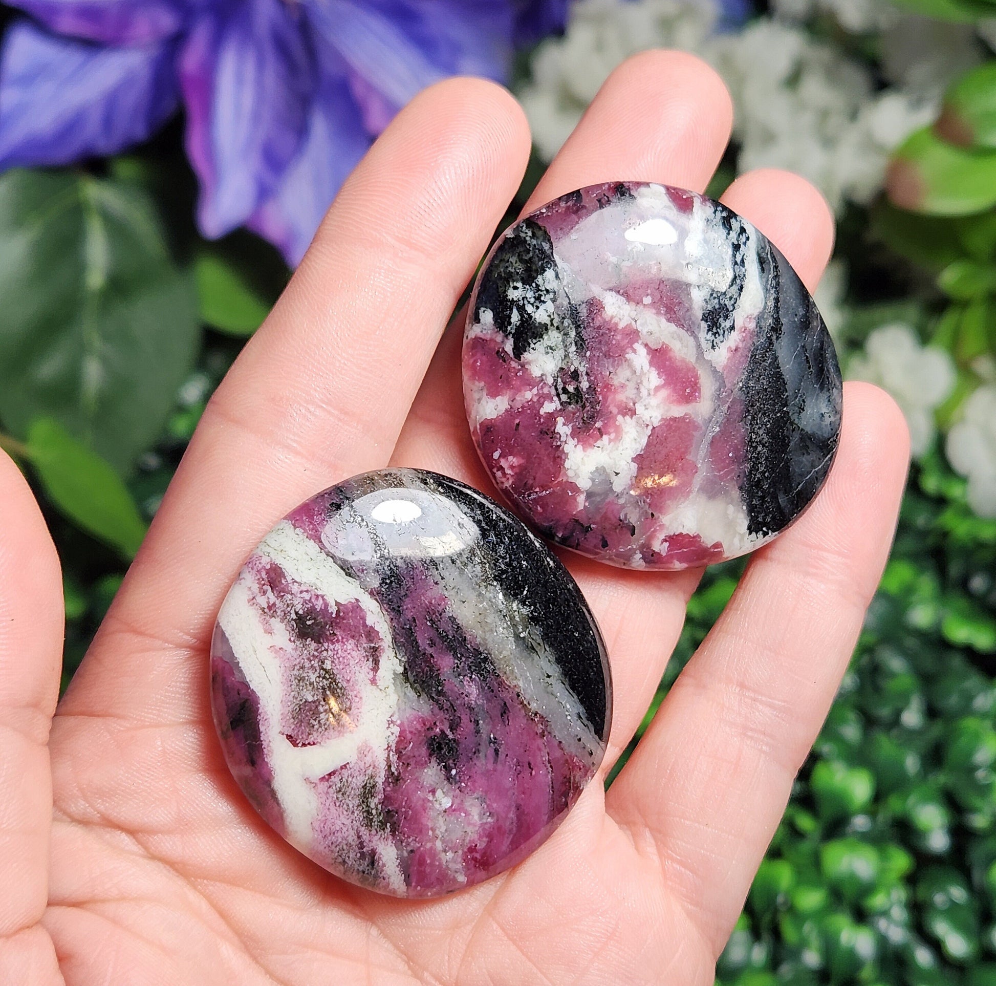 These Eudialyte crystals from Sweden exhibit dark mauve to crimson red, mottled with possible black, dark green, and white colors. They have been carved into flattened round to oval shapes and given a smooth polish. Each specimen measures approximately 1.5 inches.