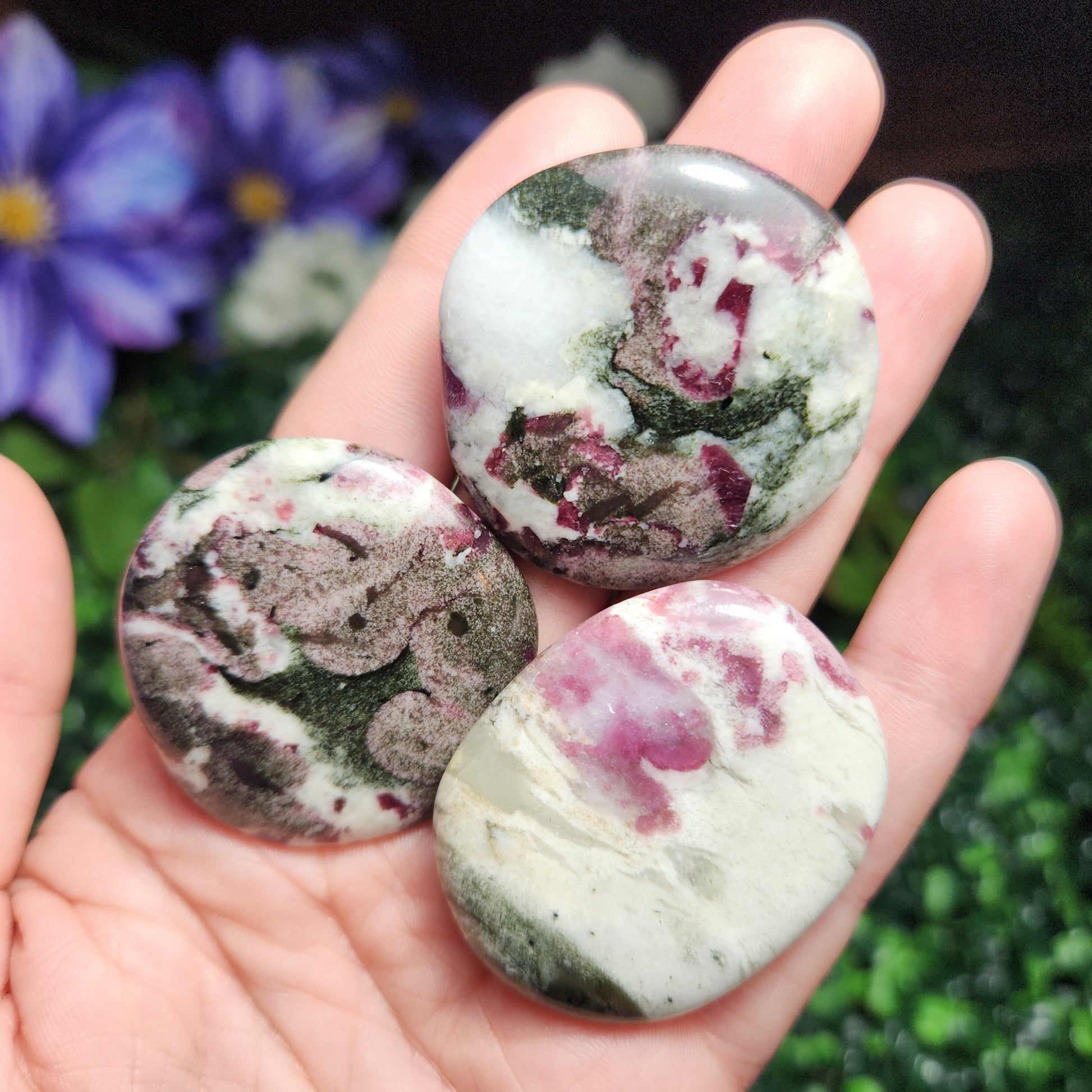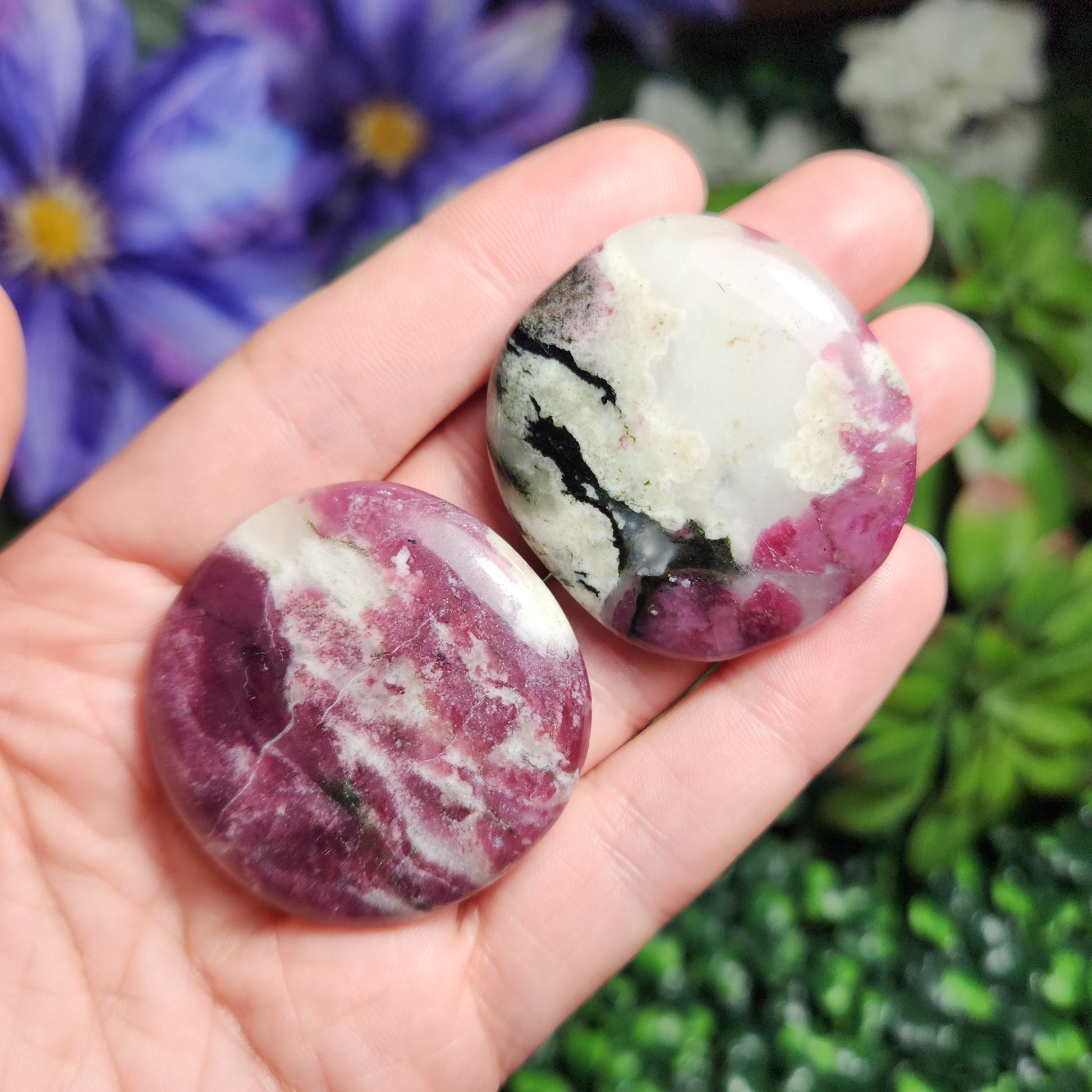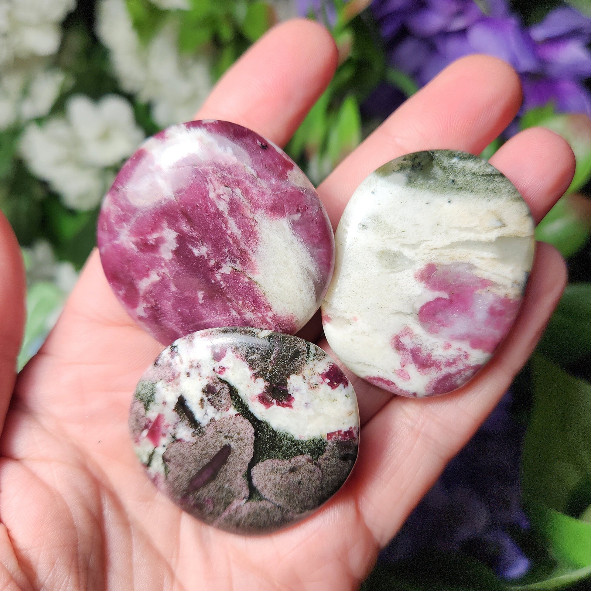 These Eudialyte crystals from Sweden exhibit dark mauve to crimson red, mottled with possible black, dark green, and white colors. They have been carved into flattened round to oval shapes and given a smooth polish. Each specimen measures approximately 1.5 inches.