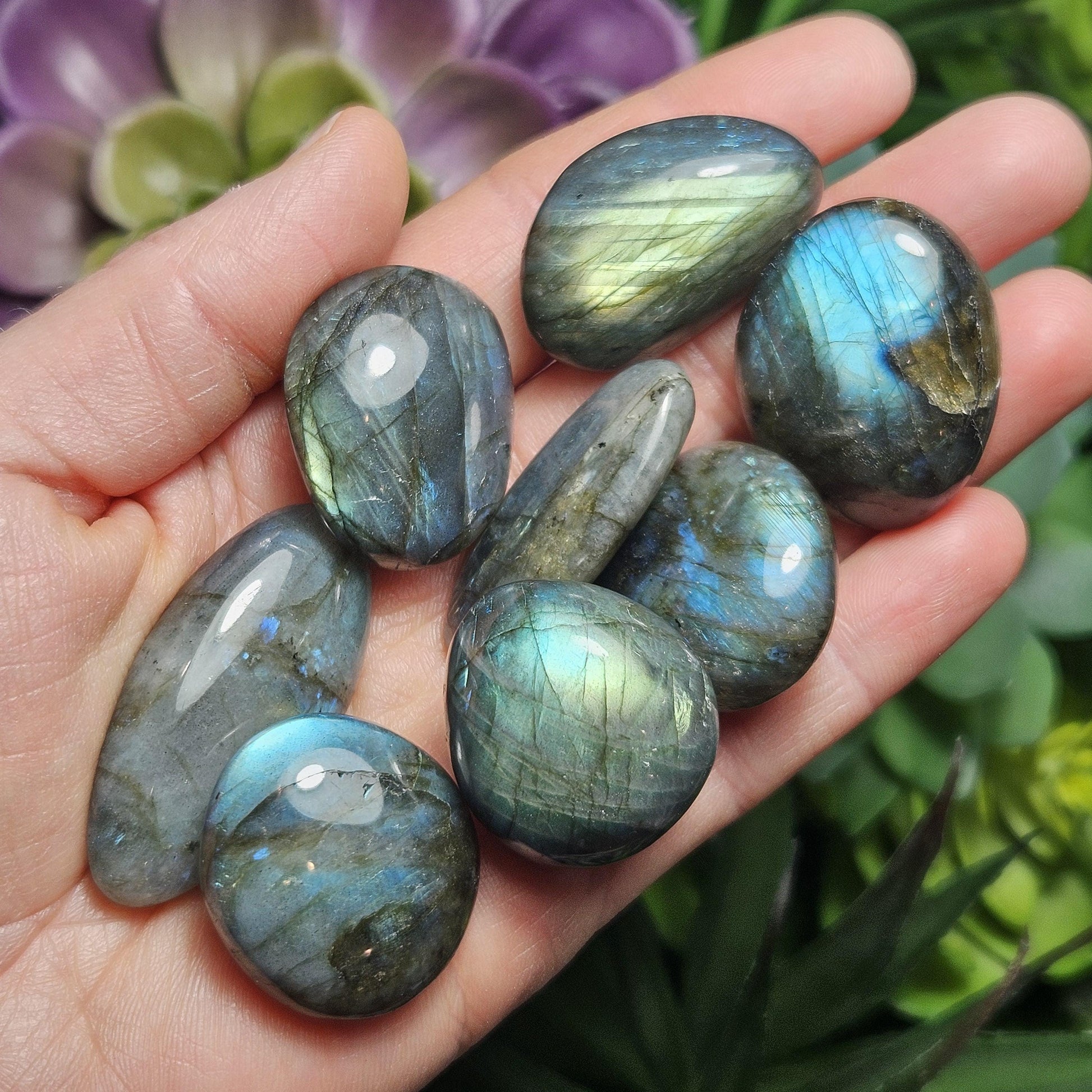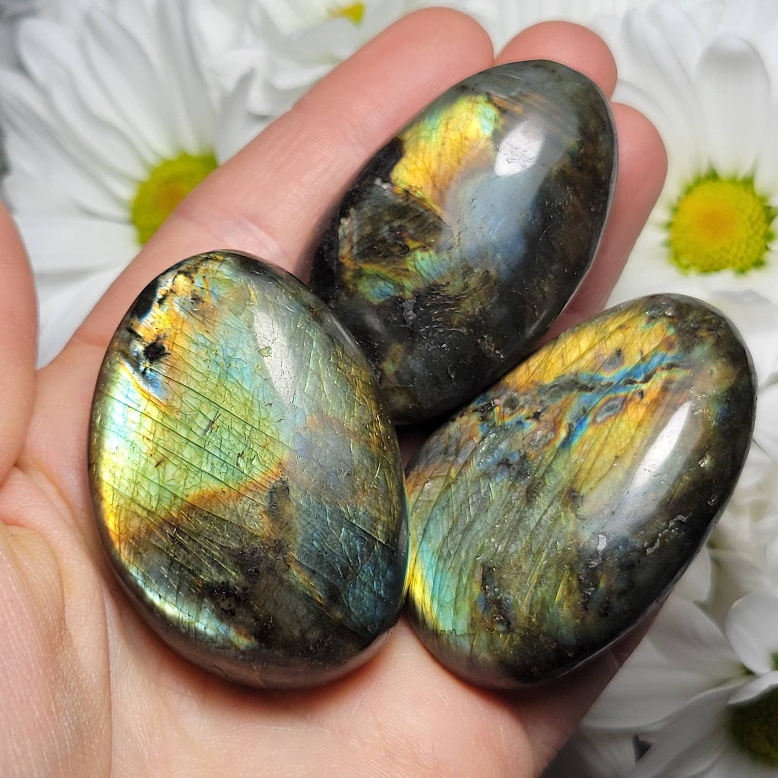These all natural Labradorite crystals from Madagascar are some of the highest quality available. They have a beautiful flash of color and a shining polish. These are freeform polished stones with substantial weight and thickness.