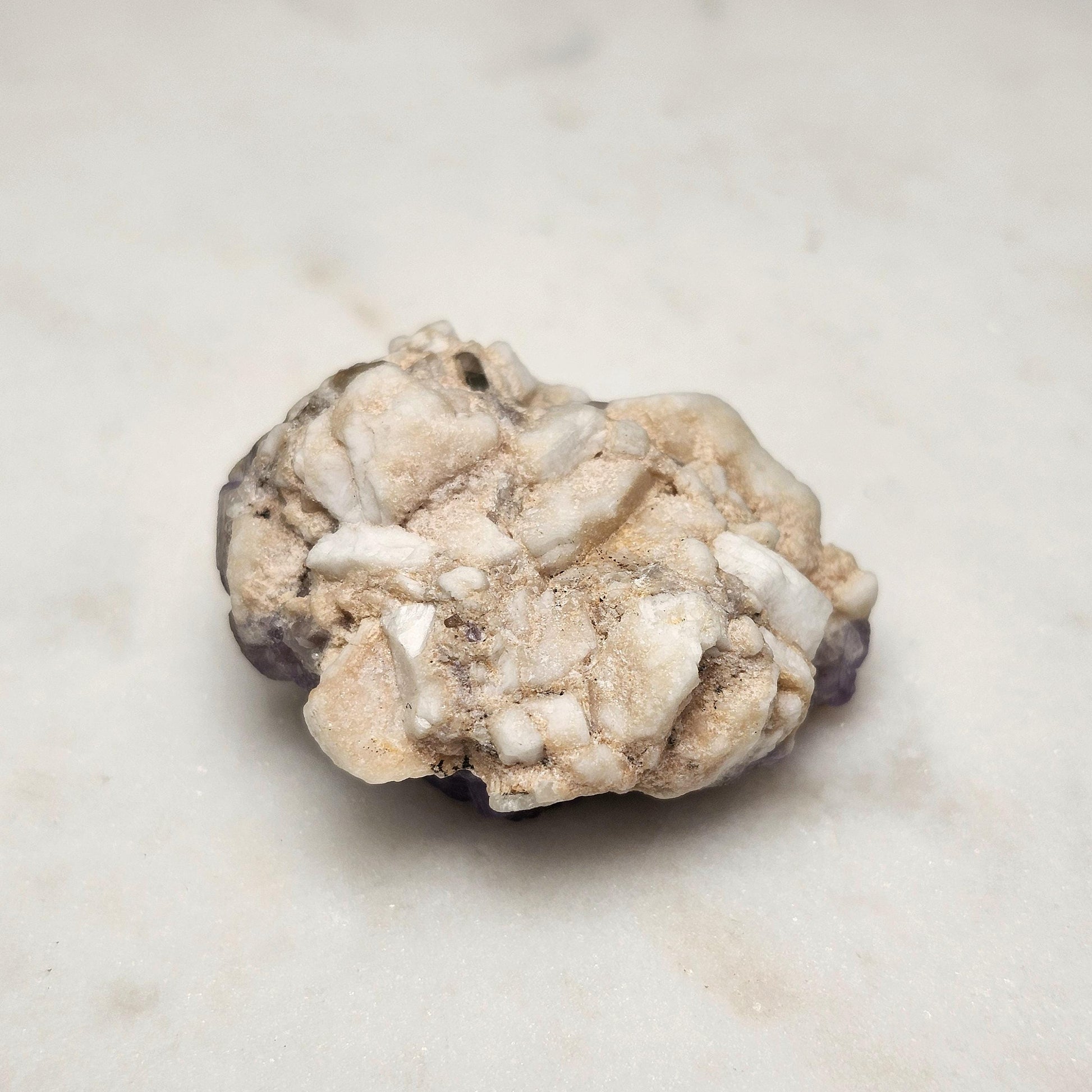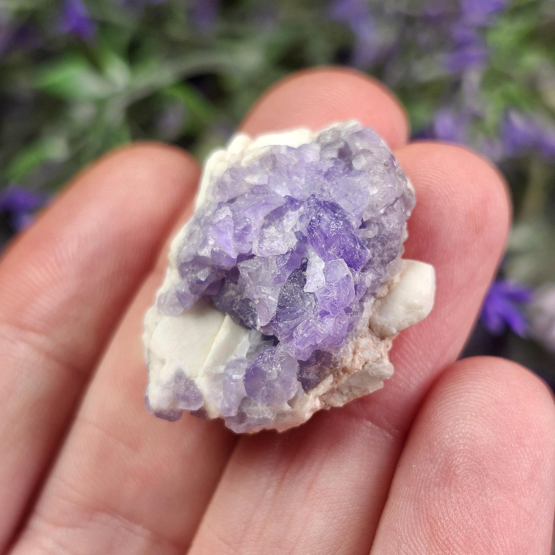 This raw Apatite crystal cluster is for the connoisseur collector, with characteristics that put it in a high tier of quality. With a lustrous shine, this specimen has an array of natural terminations with lilac coloring embedded on a white matrix. This specimen measures 27mm by 20mm by 10mm and weighs 8.6 grams.