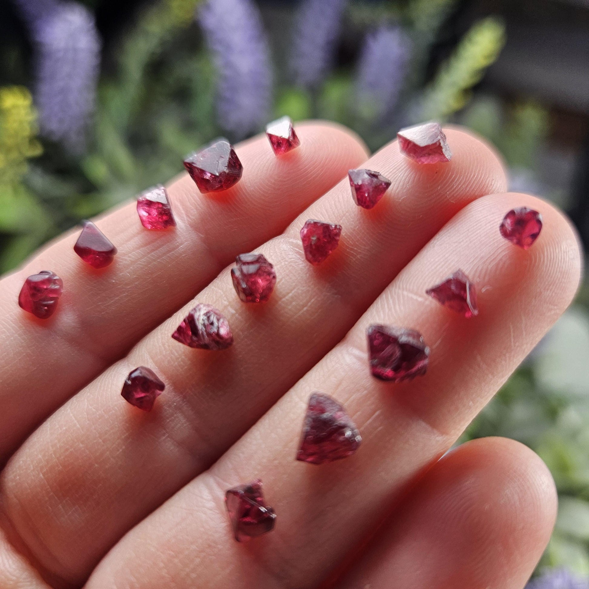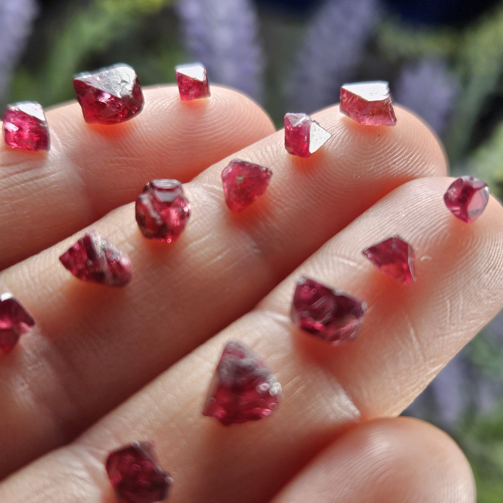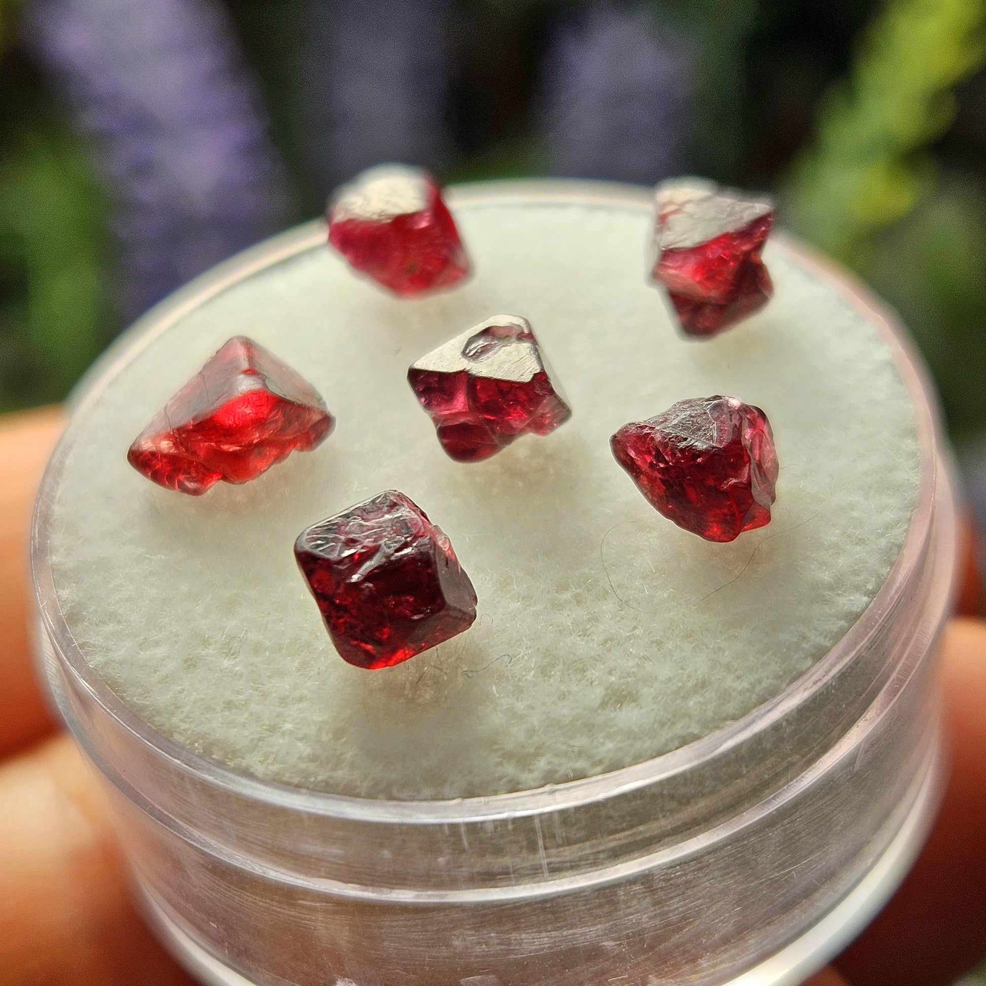 These Burmese Spinel crystals are raw and range in color from deep burgundy to blood red. Each high-grade specimen has areas of terminated natural facets. 13These petite crystals are offered as single specimens and sold by carat weight. Each crystal will arrive in a gem jar for safe handling.