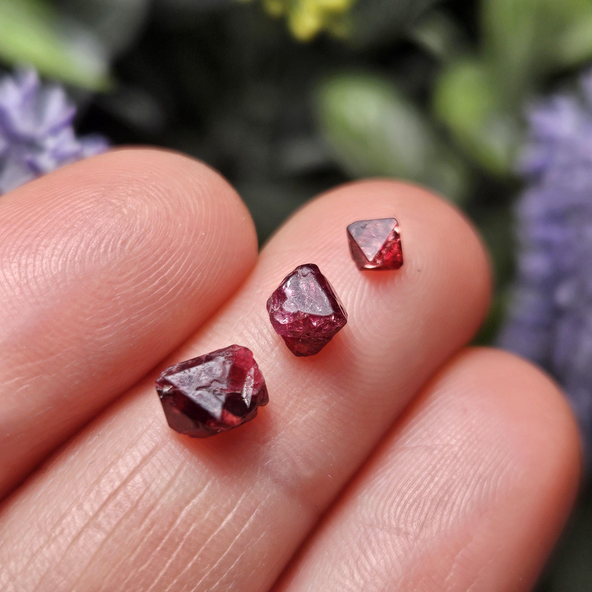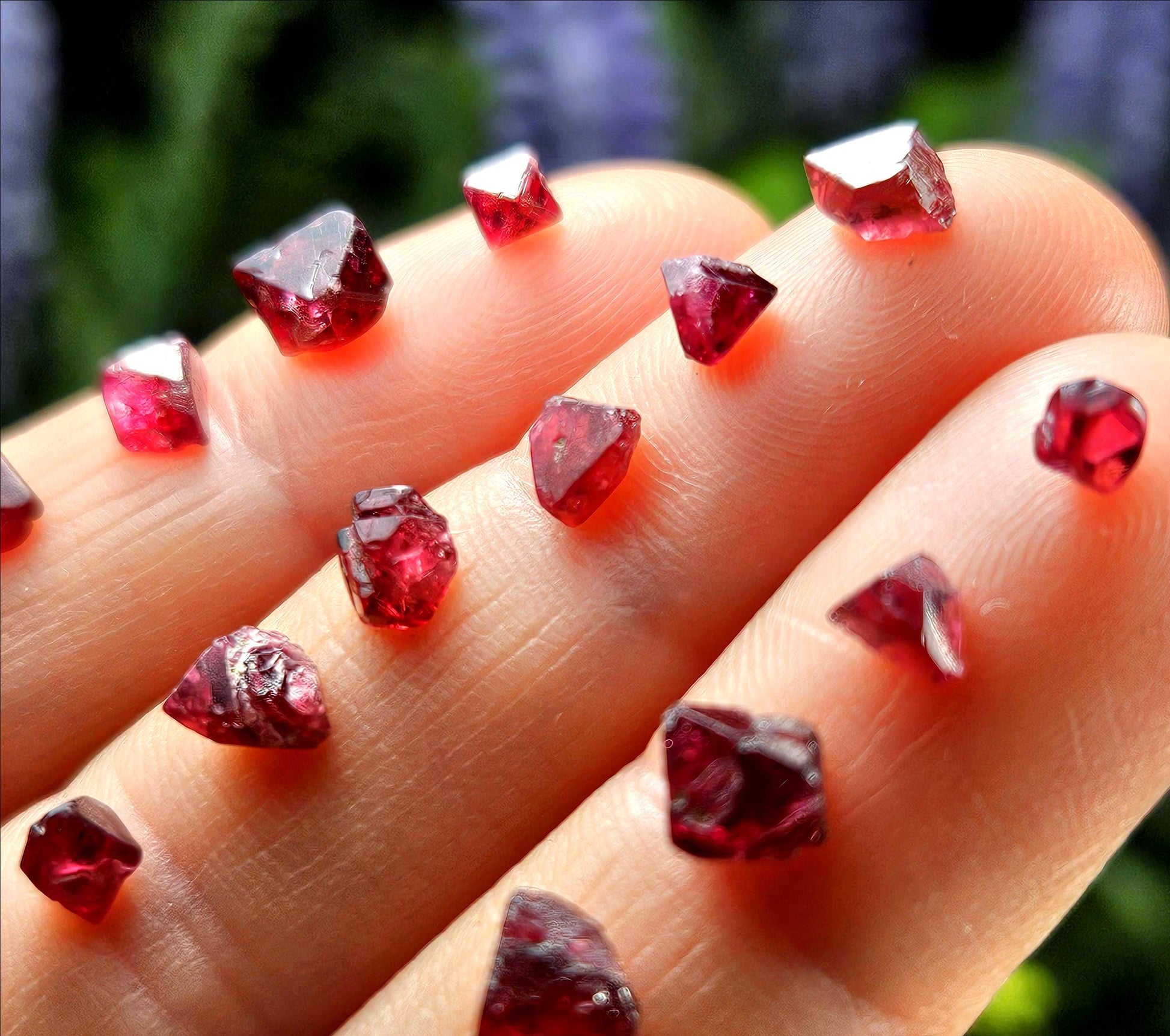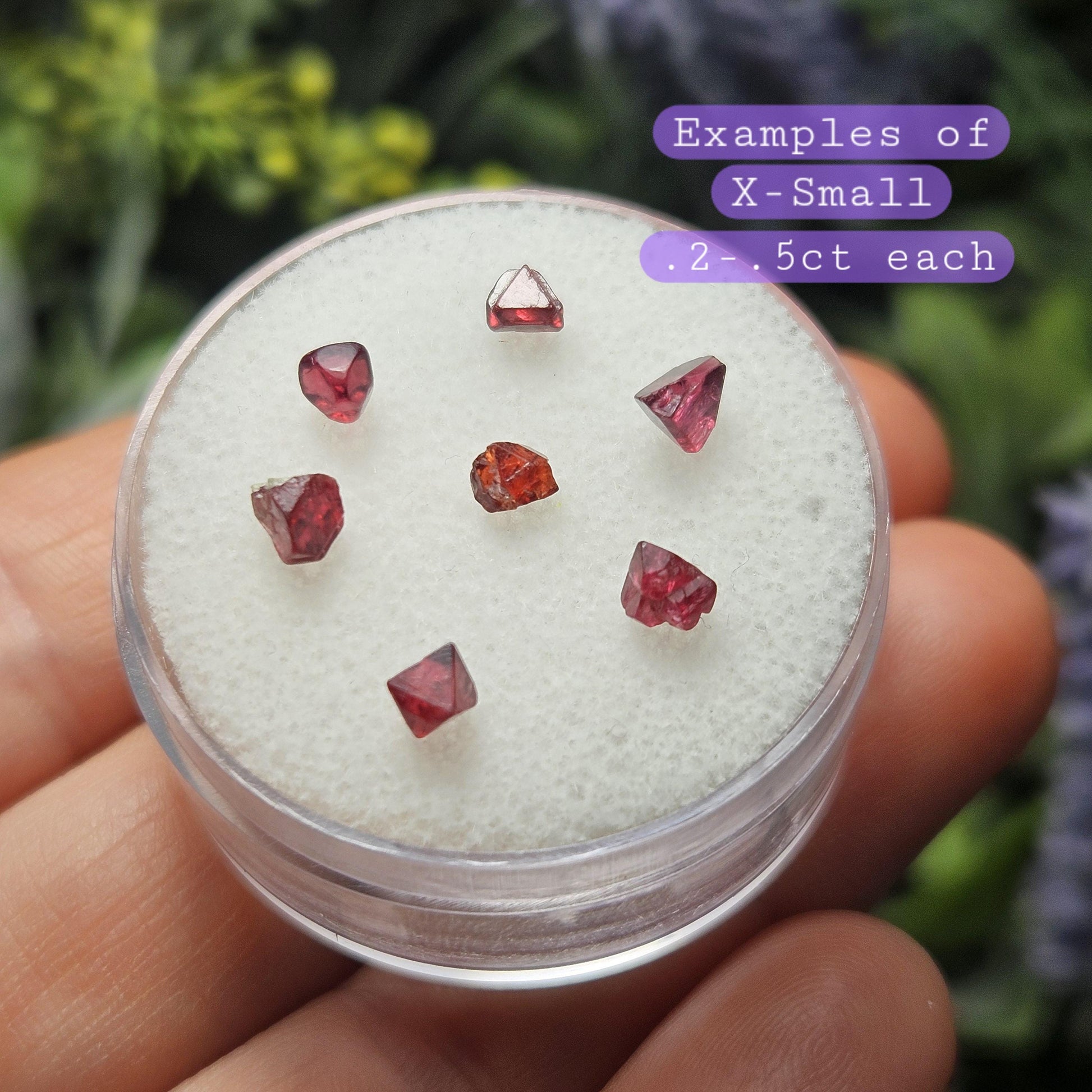 These Burmese Spinel crystals are raw and range in color from deep burgundy to blood red. Each high-grade specimen has areas of terminated natural facets. 13These petite crystals are offered as single specimens and sold by carat weight. Each crystal will arrive in a gem jar for safe handling.
