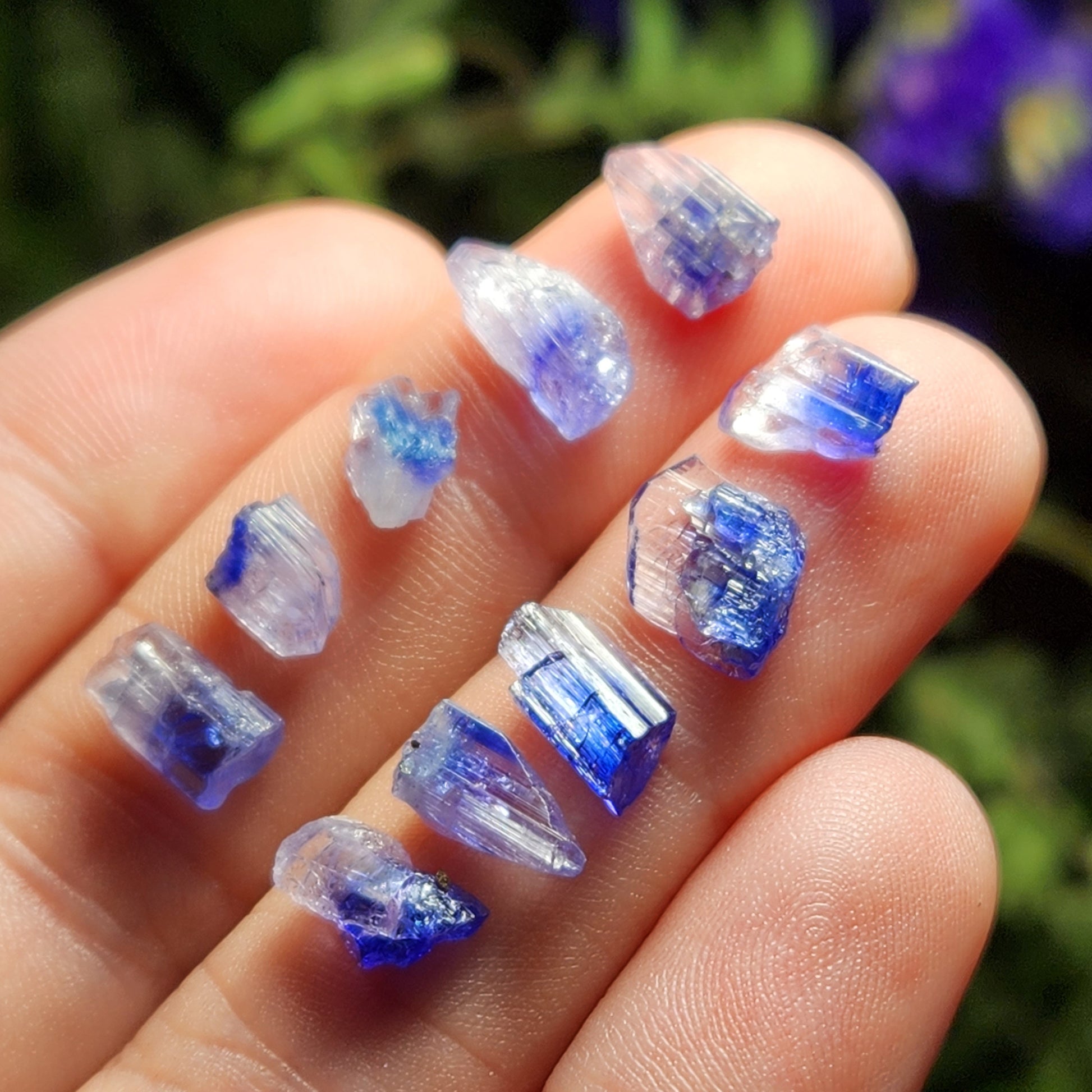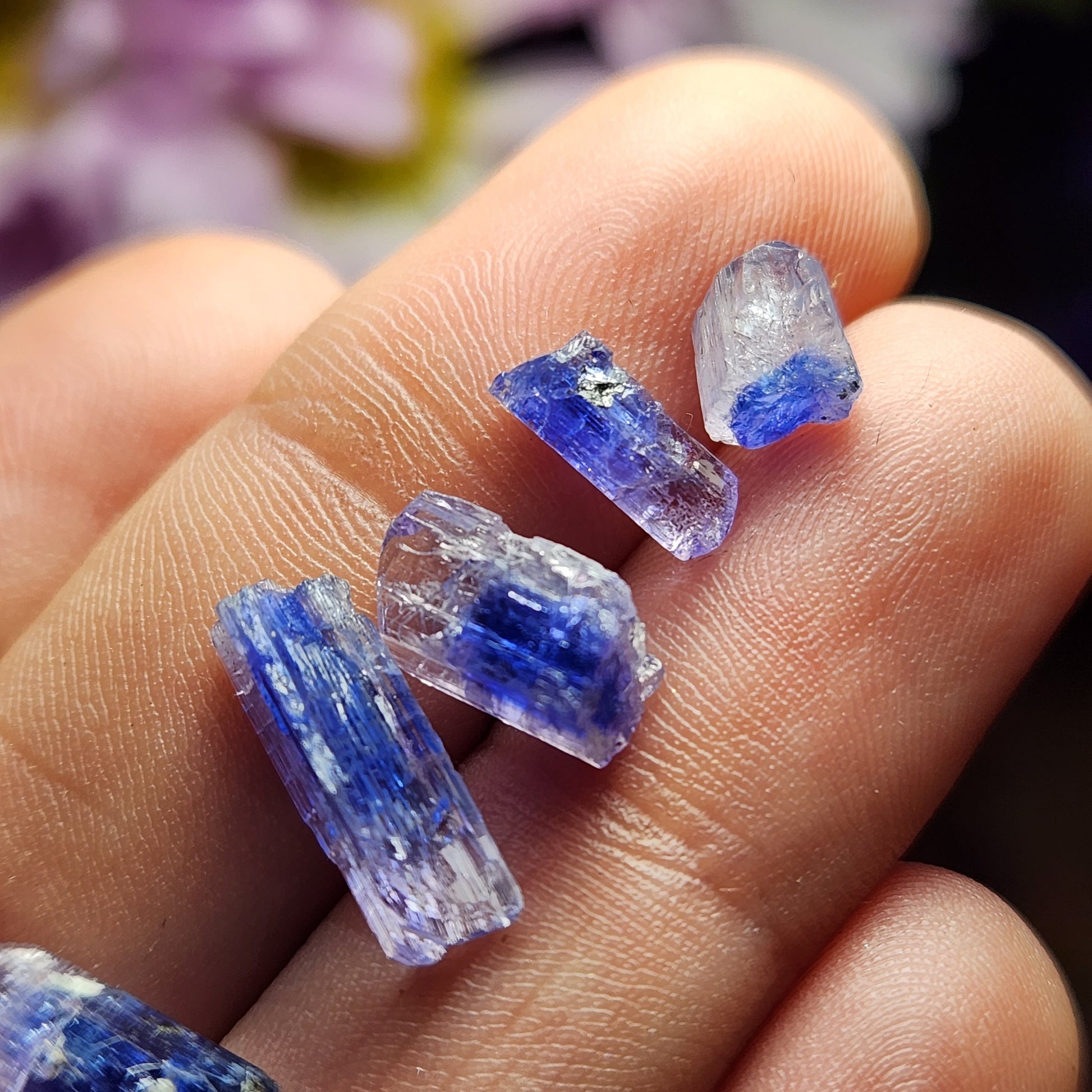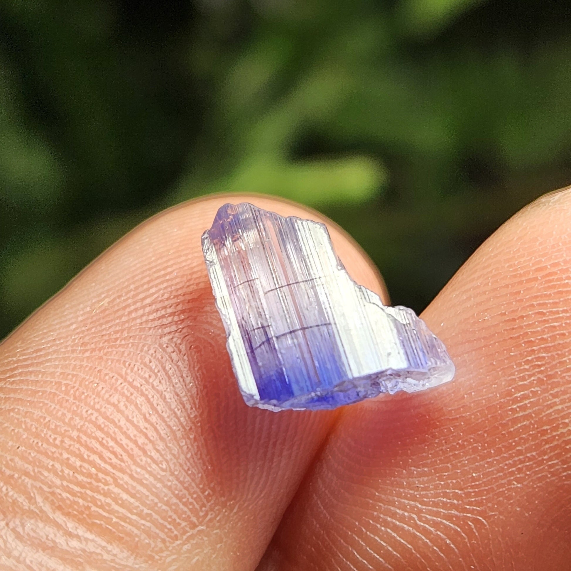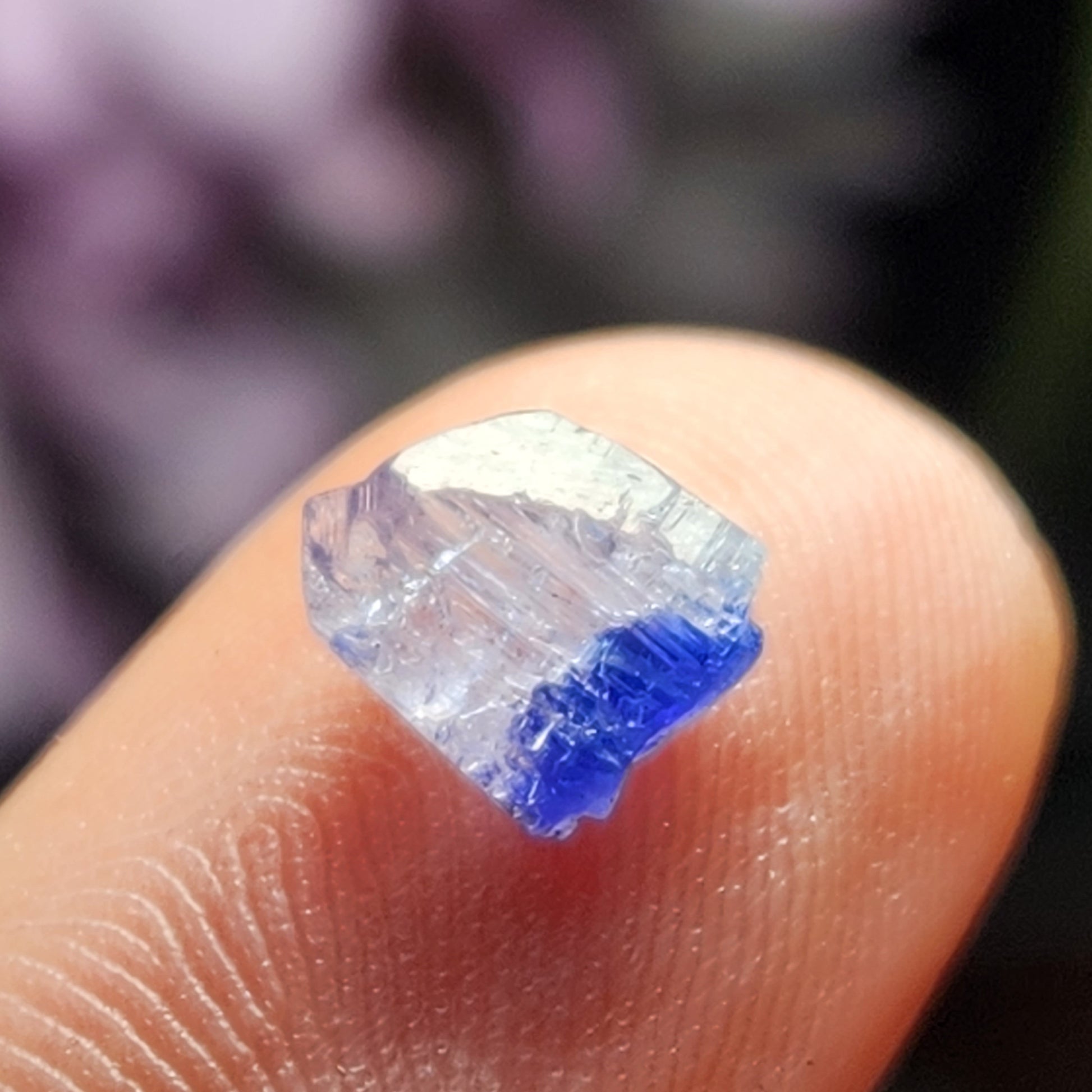 These vibrant bi-colored Tanzanite crystals exhibit shining striations with distinct indigo hues countered with transparent to light lilac coloring. This pristine quality is not easy to find in bi-color crystals, and these are a very few from a large batch of Tanzanite recently curated exclusively for Infinite Spiral Gems.