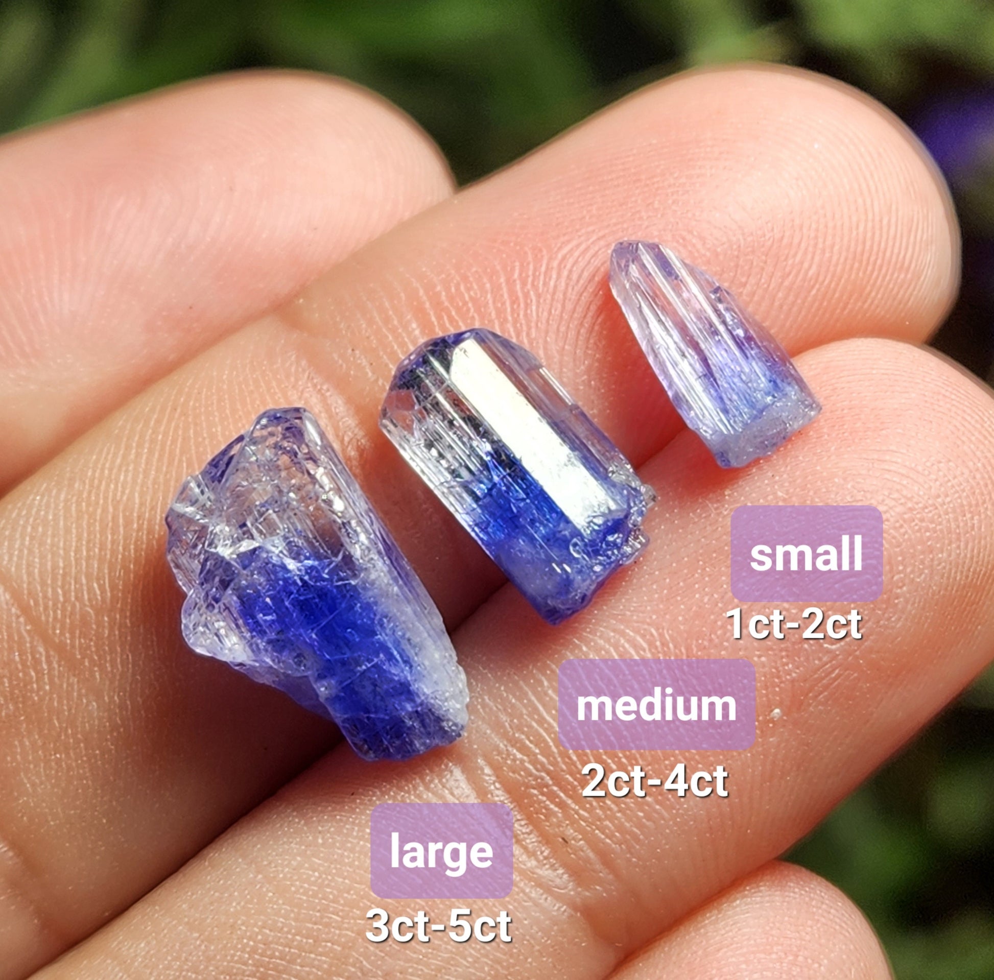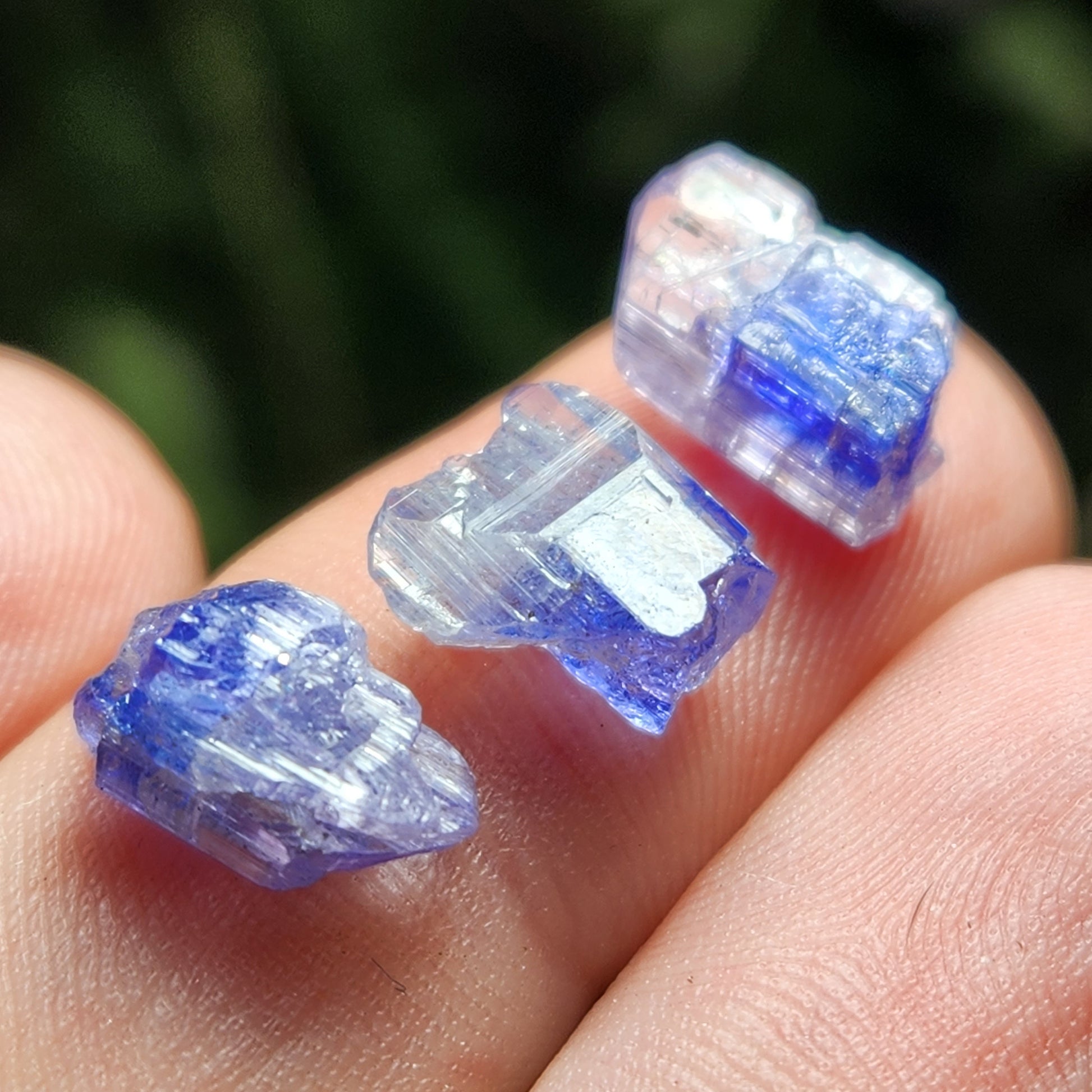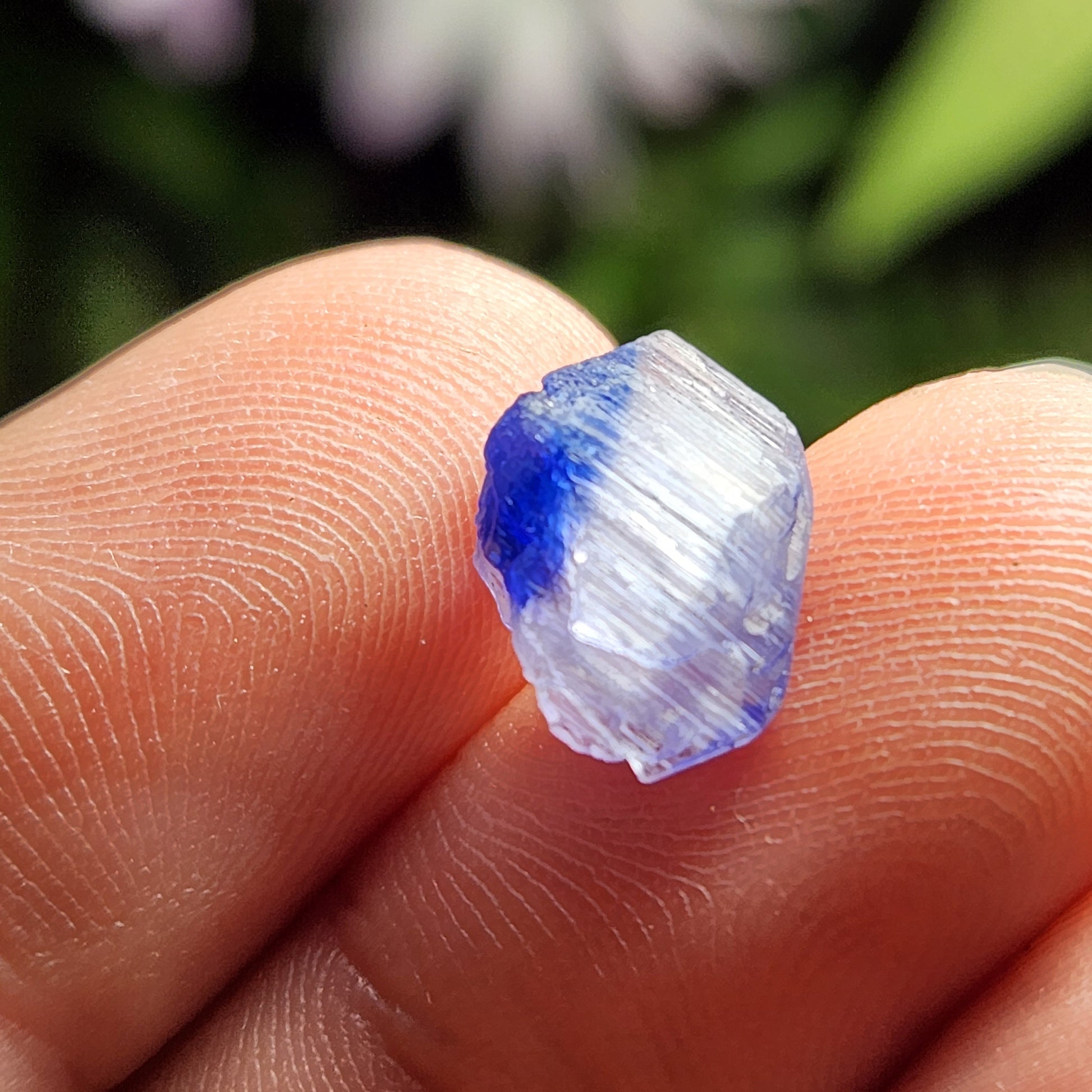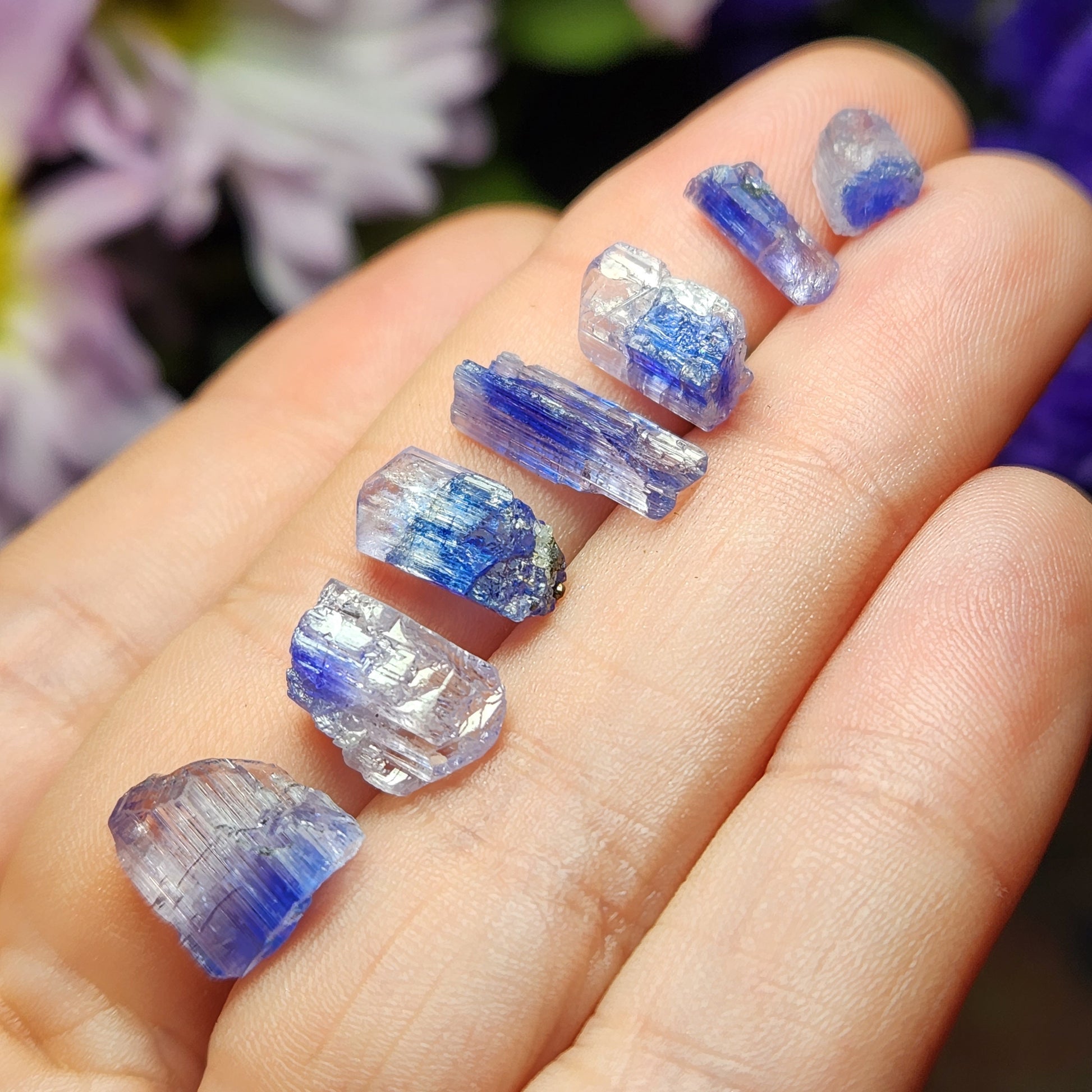These vibrant bi-colored Tanzanite crystals exhibit shining striations with distinct indigo hues countered with transparent to light lilac coloring. This pristine quality is not easy to find in bi-color crystals, and these are a very few from a large batch of Tanzanite recently curated exclusively for Infinite Spiral Gems.
