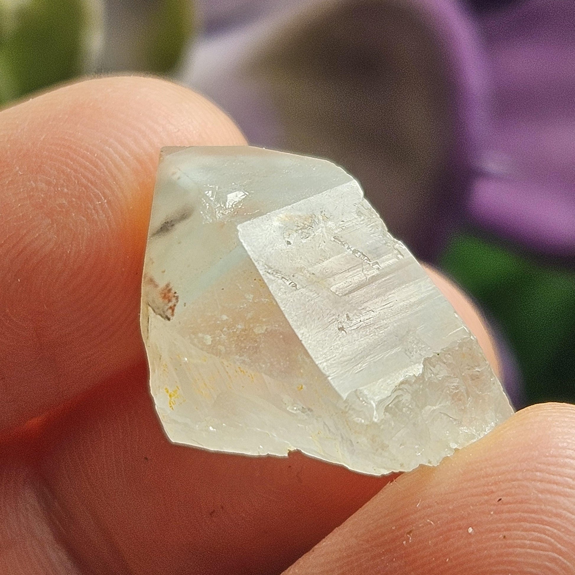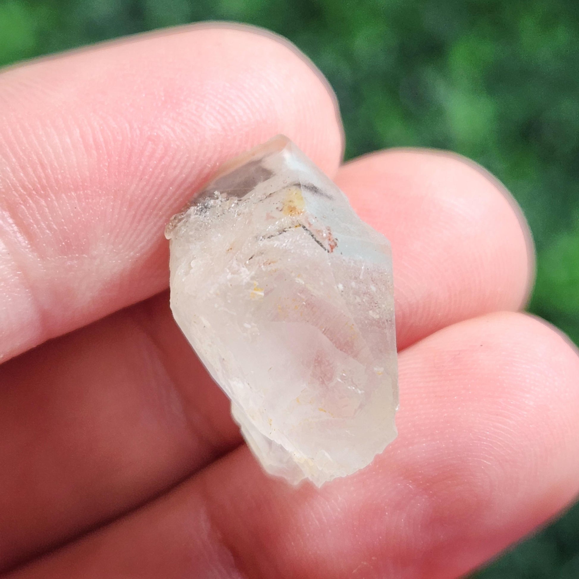 This naturally terminated Quartz crystal has a cloudy translucence with a frosty finish, exhibiting a faint phantom of included Ajoite. It has shining facets and contains Ajoite paired with red-tinged Hematite. This specimen measures 21mm by 13mm and weighs 4 grams.