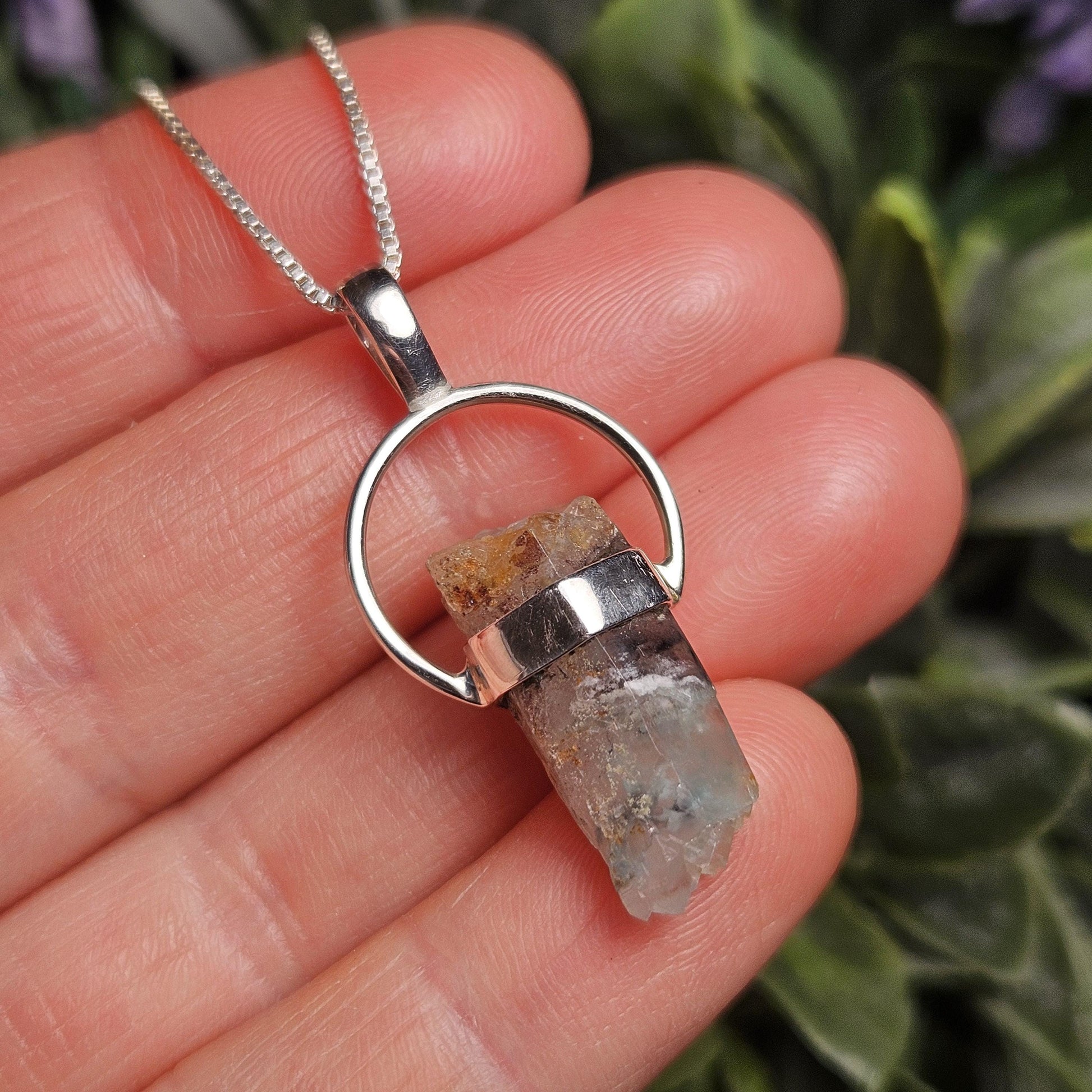 This raw Quartz crystal includes blue Ajoite within its cloudy translucence and has a range of multi terminated faces. The crystal has been handpicked and processed into an intentional piece of jewelry using .925 sterling silver. This pendant measures approximately 34mm by 16mm. The silver chain used in the photos is to help envision how this pendant will look while adorned but is not included in the listing.