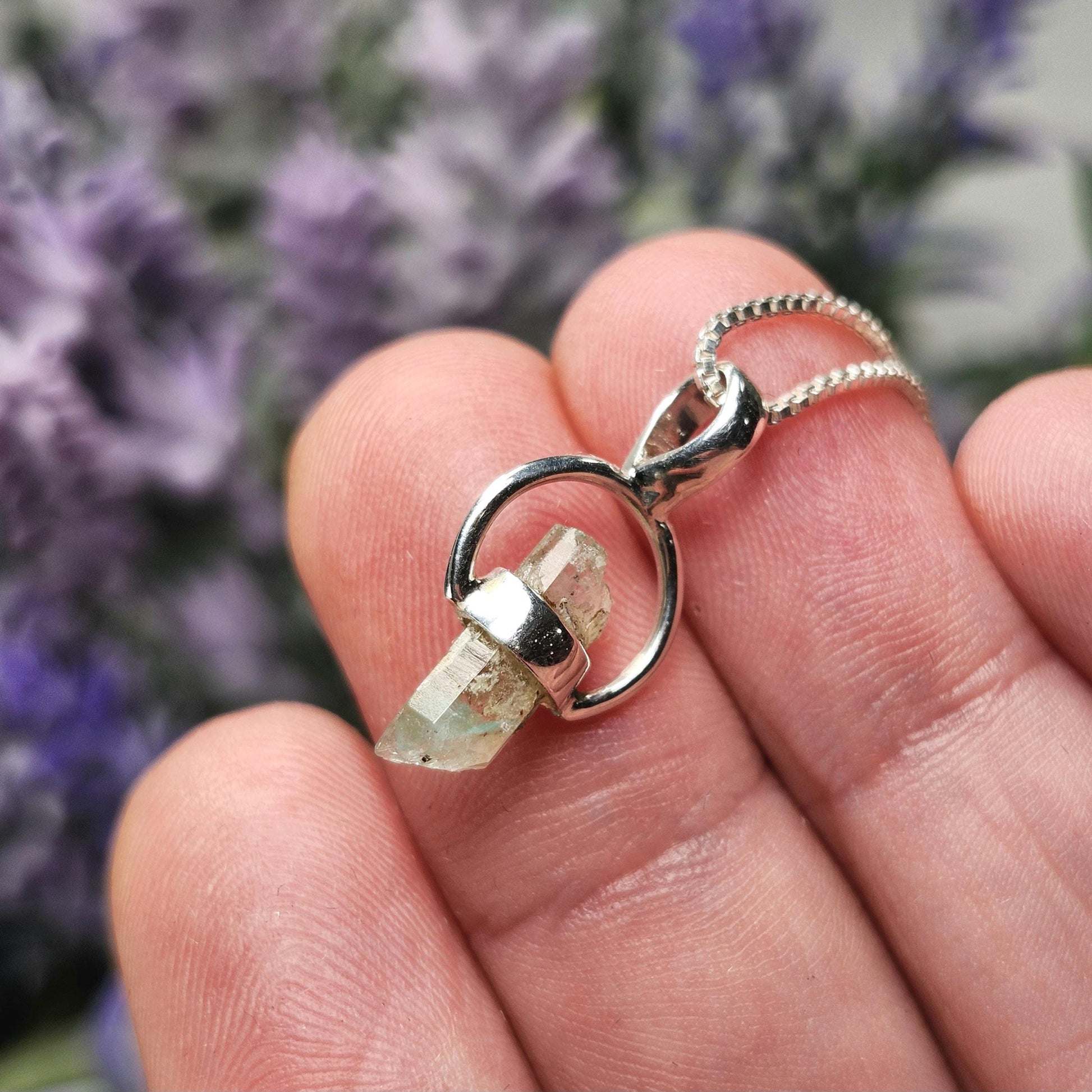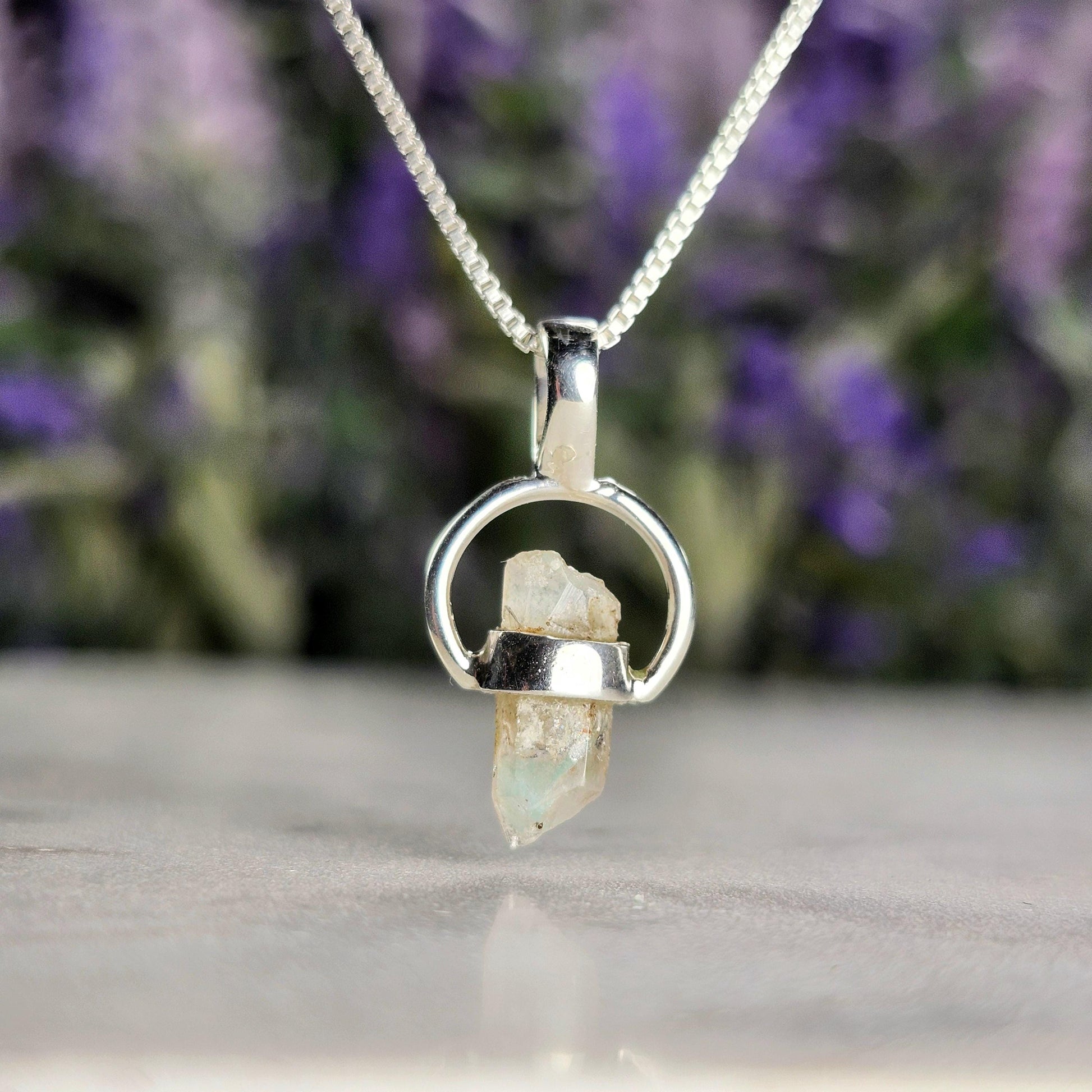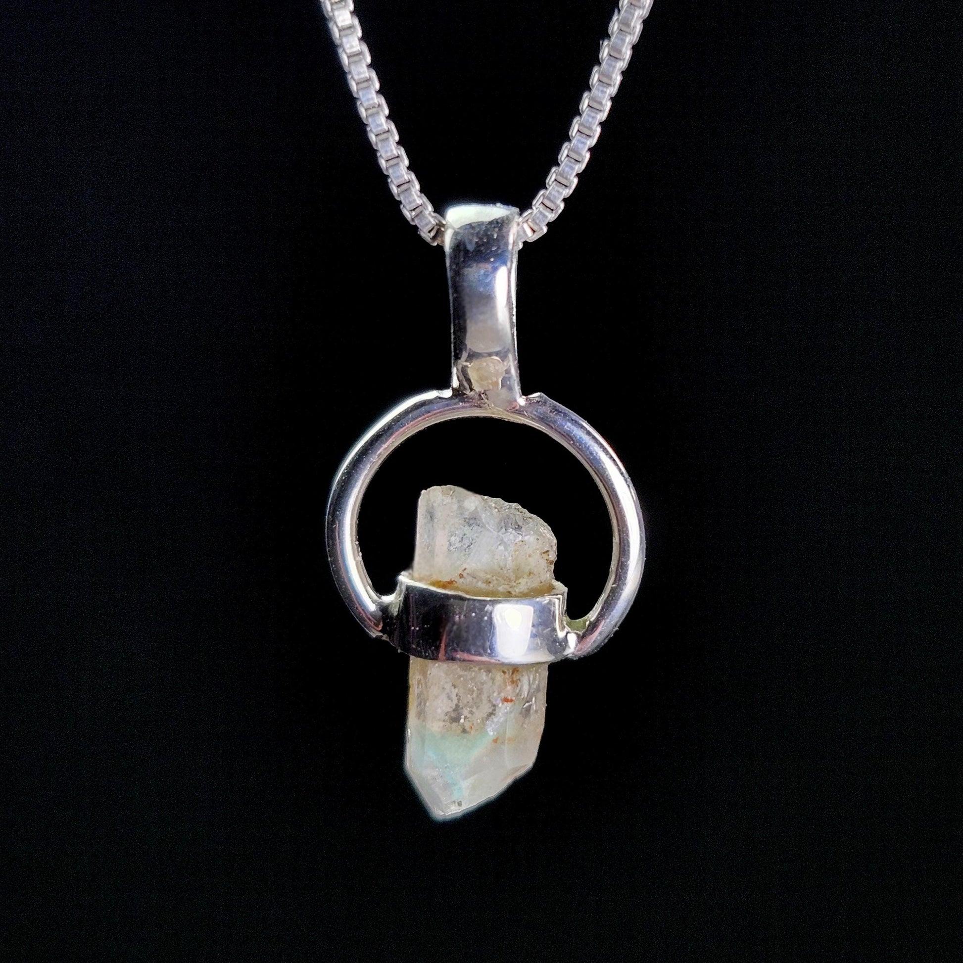 Mined from the Messina Mine in South Africa, this raw Quartz crystal includes blue Ajoite within its translucence. This crystal has been handpicked and processed into an intentional piece of jewelry using .925 Sterling Silver. This pendant measures approximately 20mm by 11mm. The silver chain used in the photos is to help envision how this pendant will look while adorned but is not included in the listing.