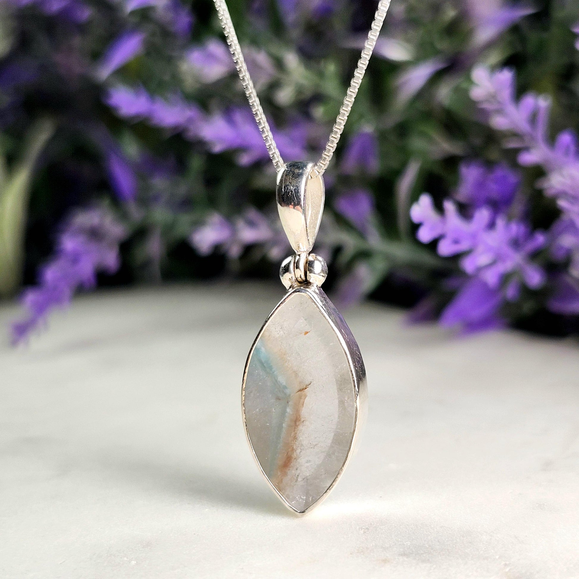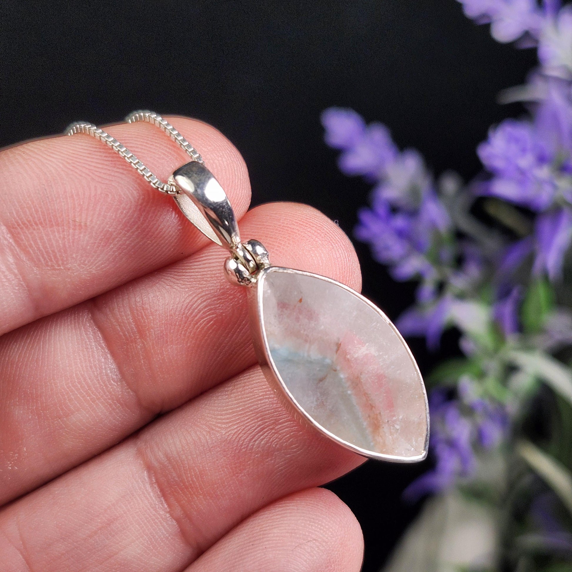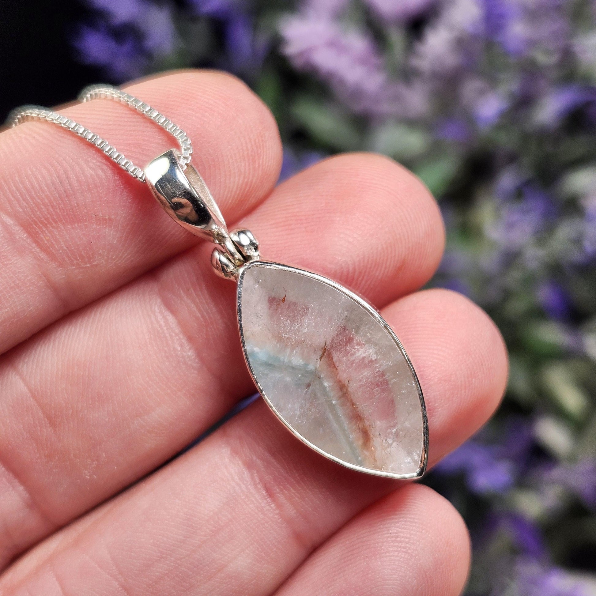 This teal-colored Paraíba Amazonite creates a phantom within its polished clear Quartz host crystal. This crystal has been handpicked and processed into an intentional piece of jewelry using .925 Sterling Silver. This pendant measures approximately 34mm by 12mm. The silver chain used in the photos is to help envision how this pendant will look while adorned but is not included in the listing.