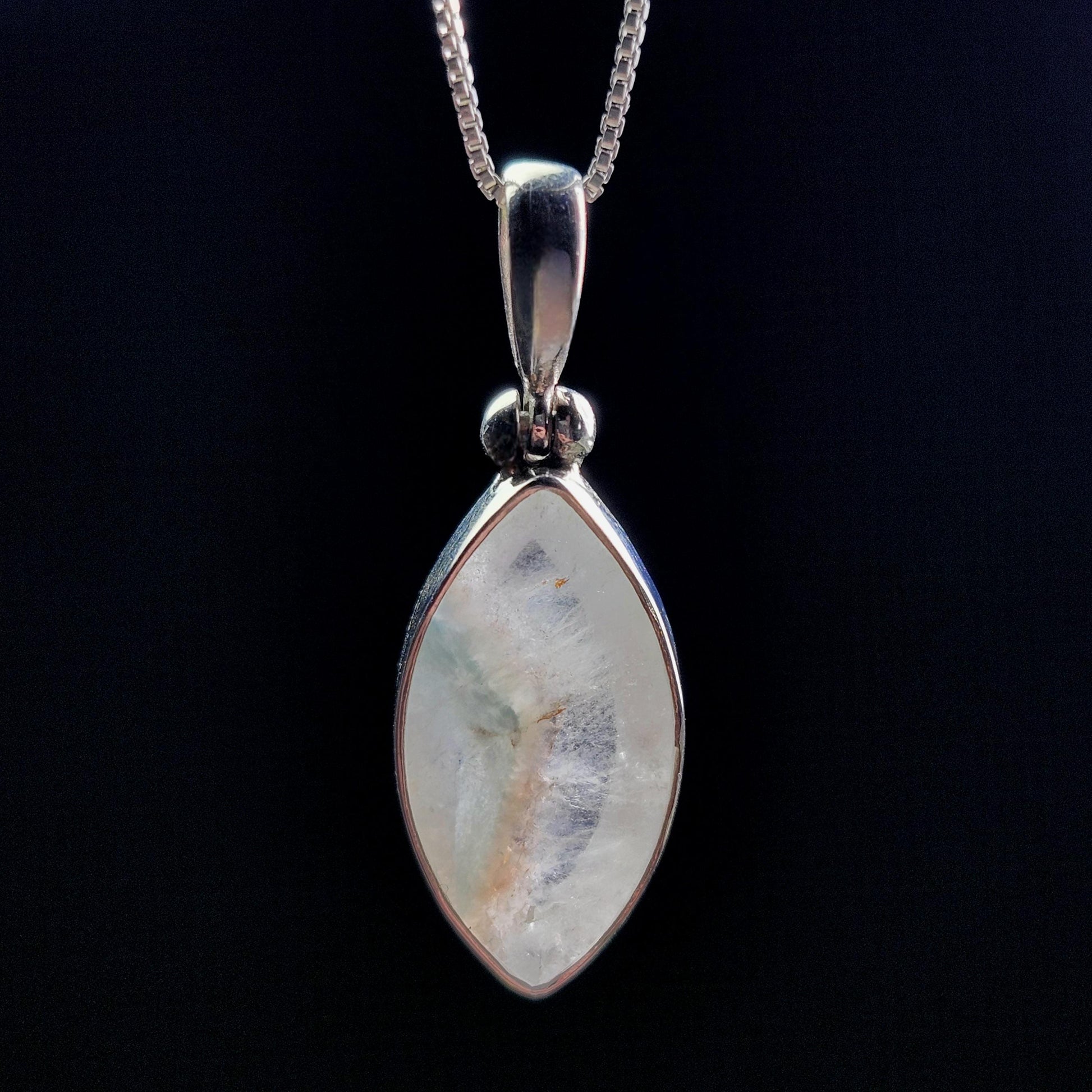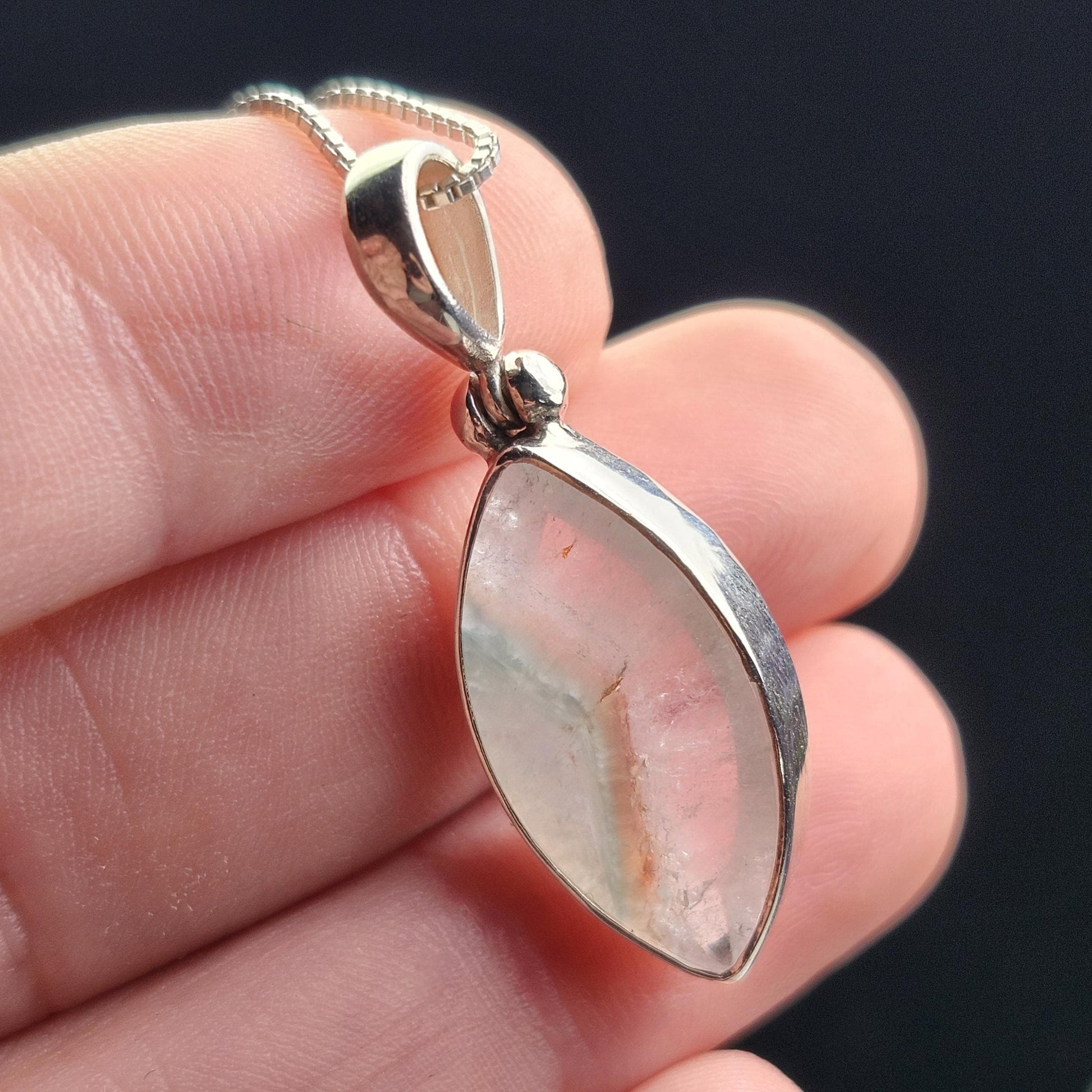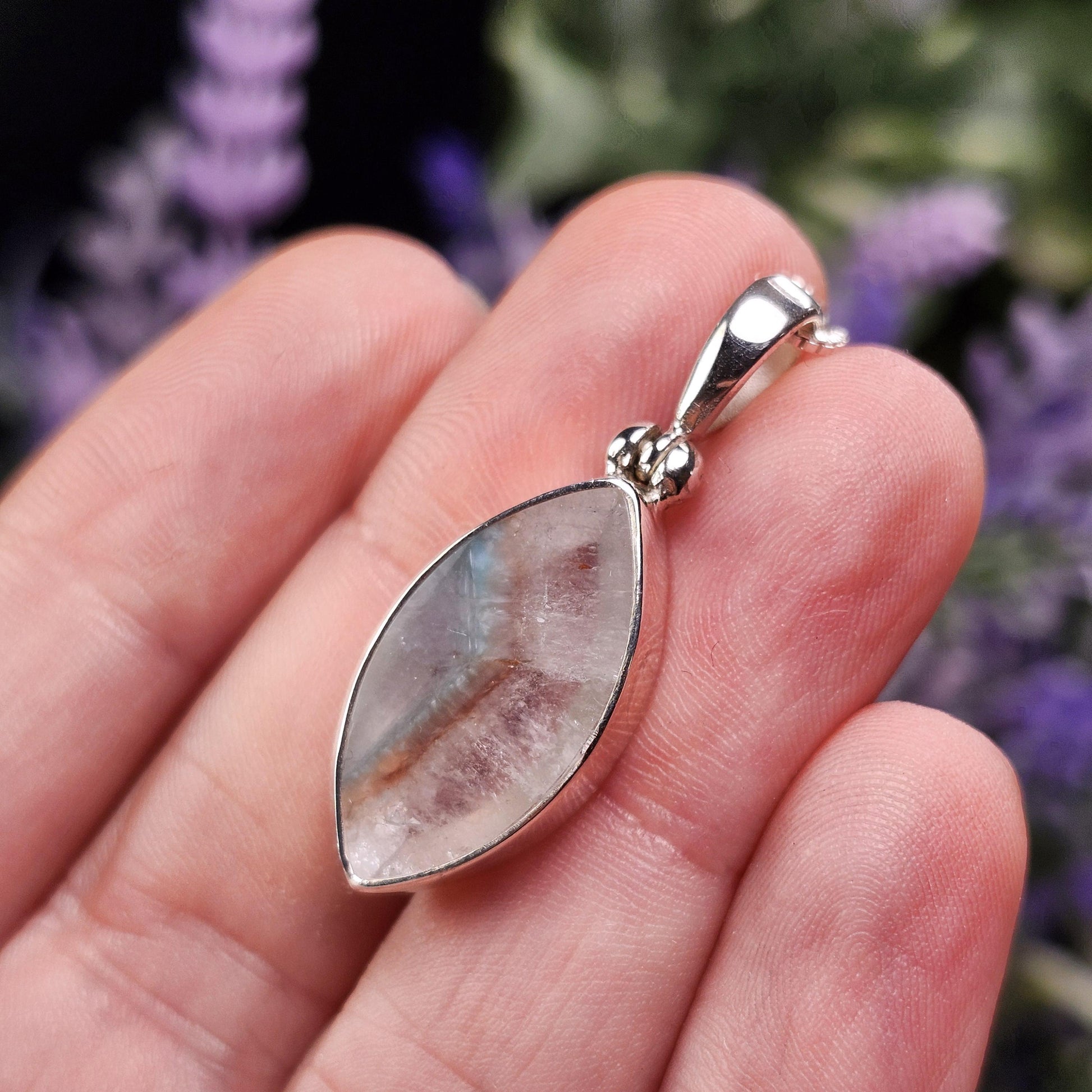 This teal-colored Paraíba Amazonite creates a phantom within its polished clear Quartz host crystal. This crystal has been handpicked and processed into an intentional piece of jewelry using .925 Sterling Silver. This pendant measures approximately 34mm by 12mm. The silver chain used in the photos is to help envision how this pendant will look while adorned but is not included in the listing.