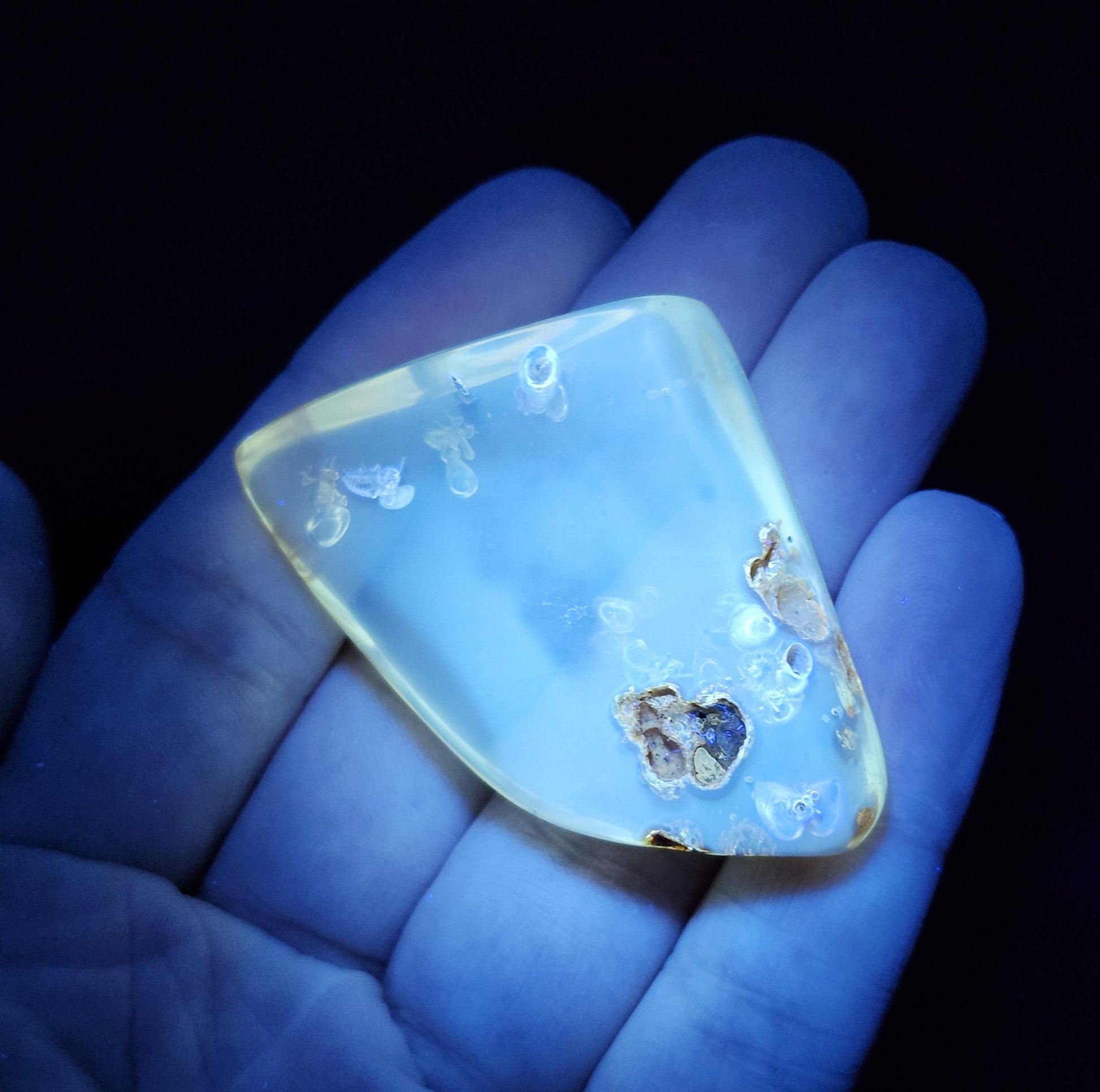 This polished Amber specimen has a glowing translucence, showcasing the preserved insect inclusions and static enhydro bubble within its depths. This stone glows with a colorful, saturated brilliance when under a black light - a rare quality in the mineral kingdom! This specimen measures approximately 42mm by 34mm by 10mm and weighs 10.5 grams.