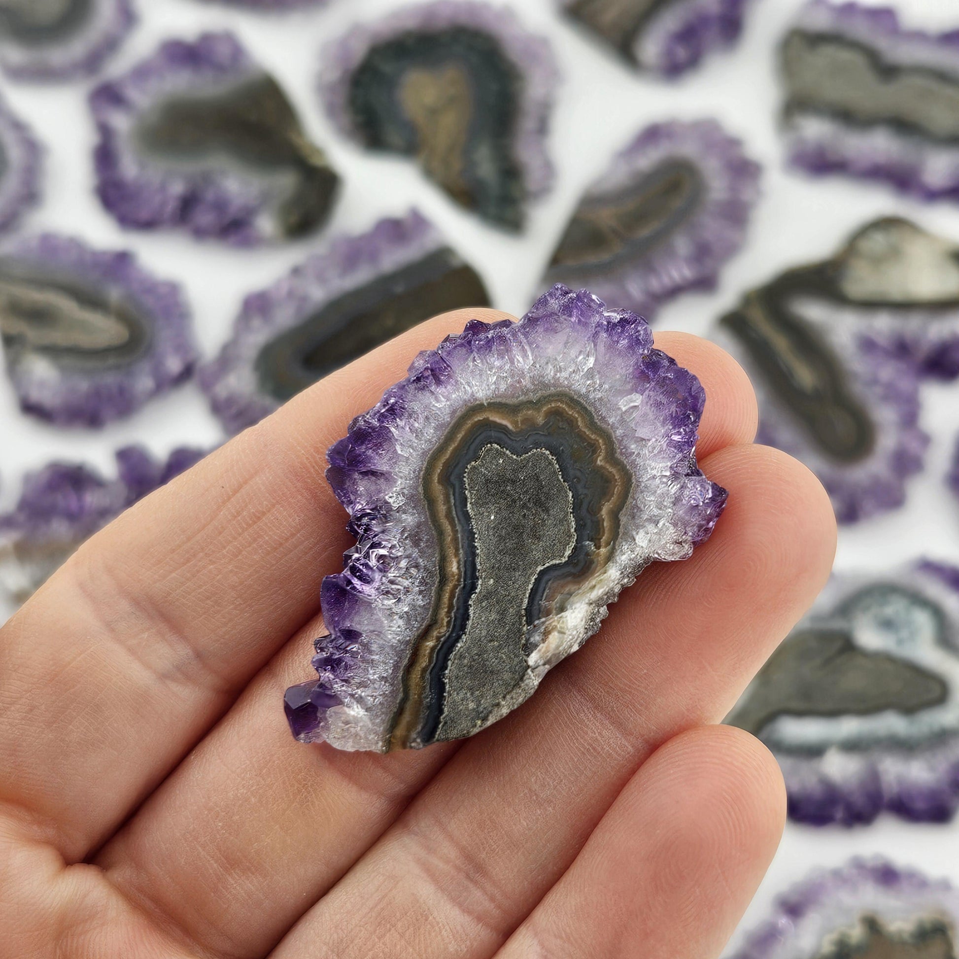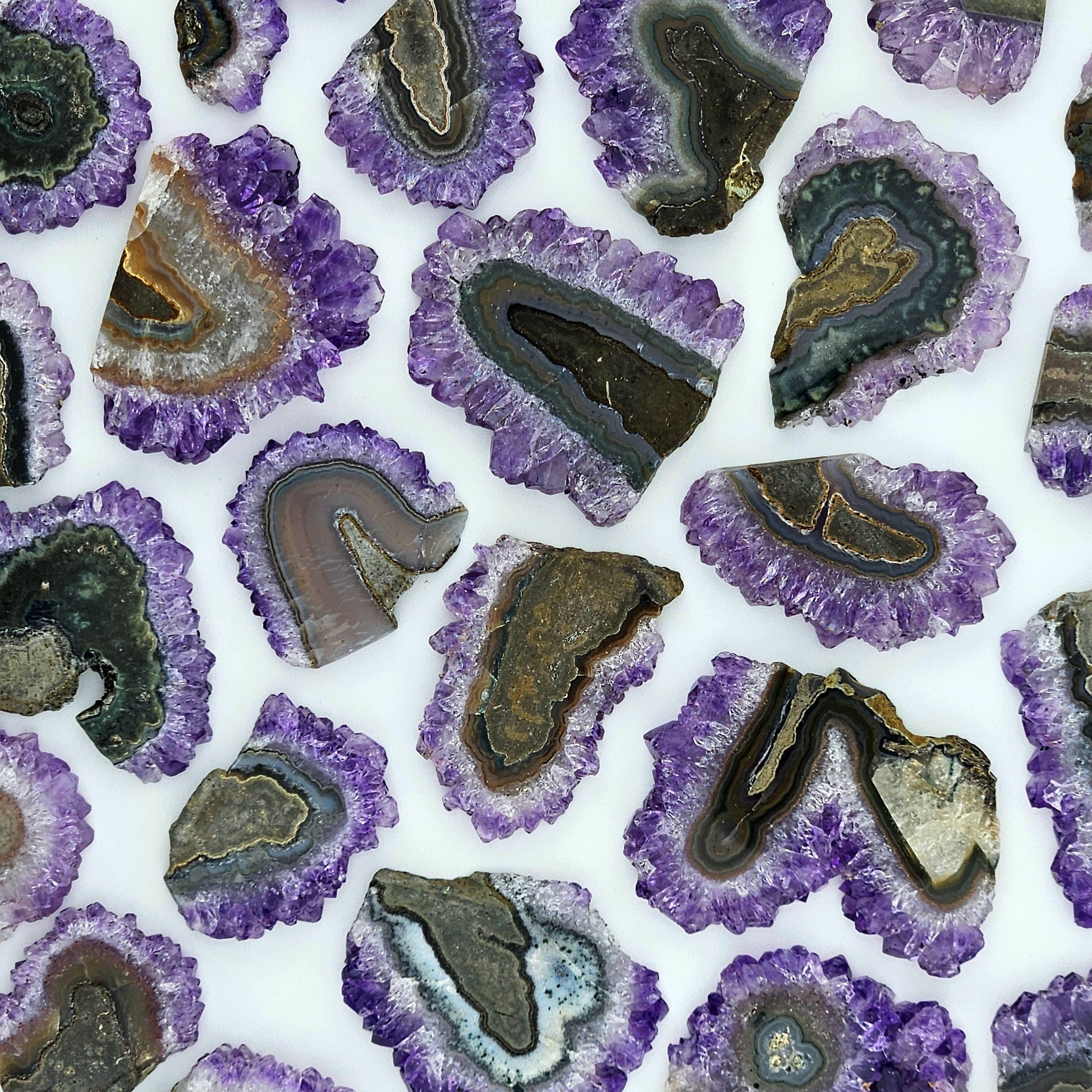 These Uruguay Amethyst stalactite slices each have a range of purple hues with raw crystallization on their edges and polished faces. These slices are partial slices and each one is unique, with a darker core surrounded by Amethyst micro crystallization. These slices are great for jewelry making or as a display specimen as well.