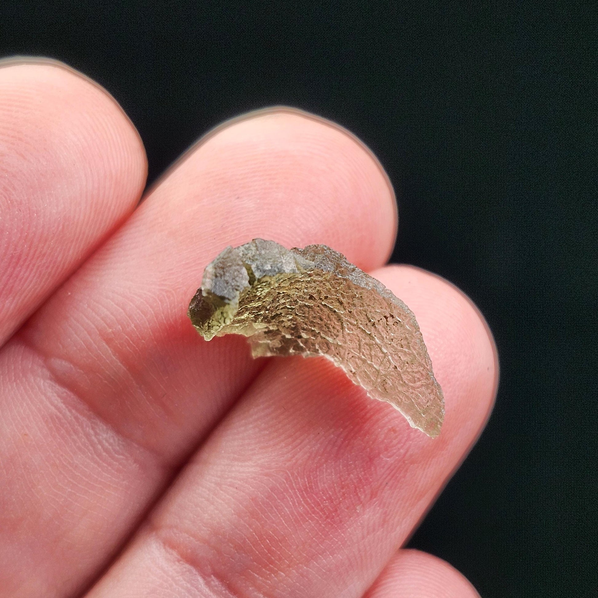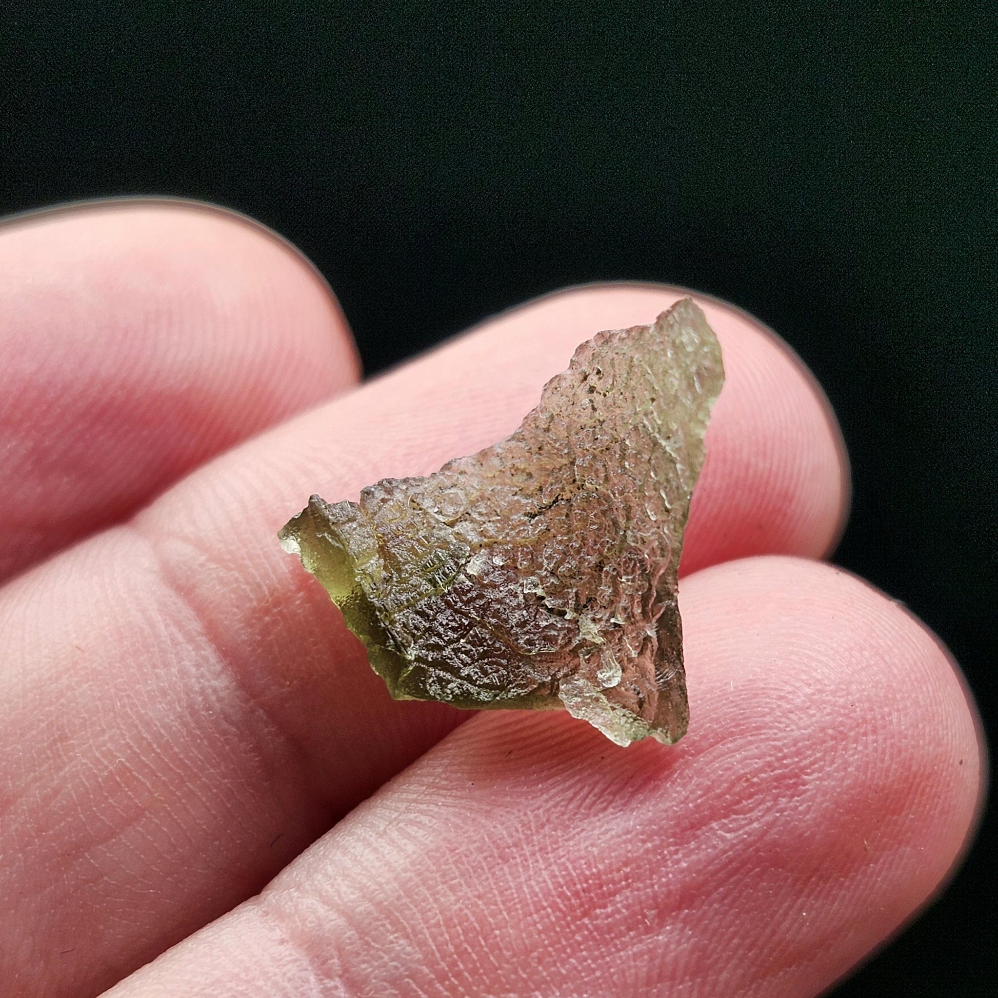 This Moldavite tektite has a classic green coloring with a glowing translucence. Angel Chimes are a special type of stone named after the angelic sound they make. By gently tapping these special crystals against glass, metal, or another crystal, you can hear them sing! This specimen measures approximately 16mm by 12mm by 7mm and weighs .47 grams.