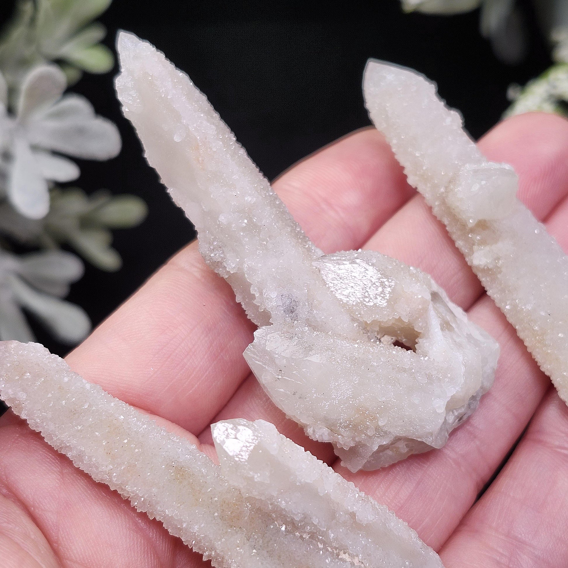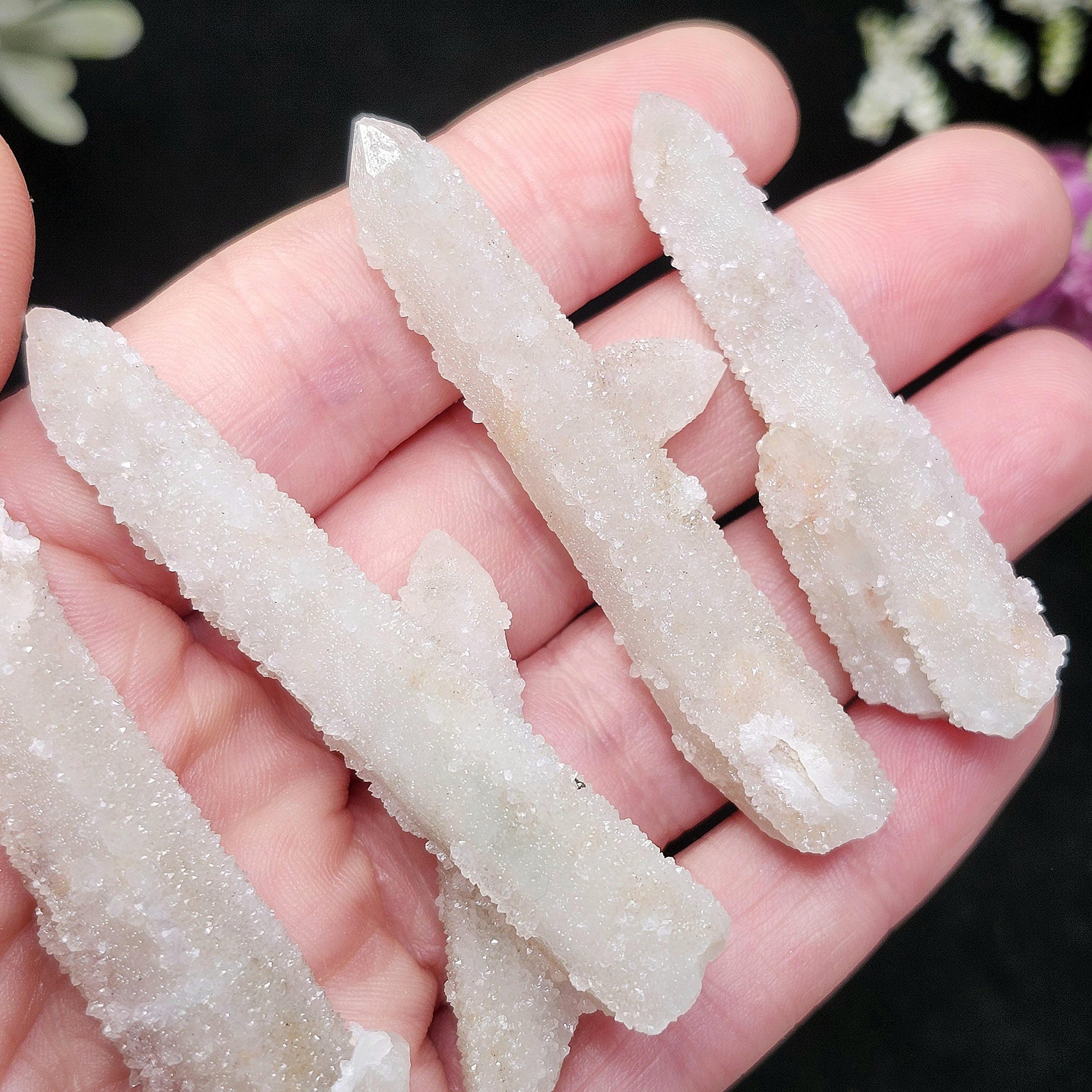 These sparkling raw Cactus Quartz wands from the Mpumalanga Province of eastern South Africa exhibit microcrystalline Druzy growth on their surface. Each specimen is completely unique and may feature natural termination, lustrous etchings, or intersecting crystal growths. Angel chime crystals are a special type of stone named after the chiming sound they make. By gently tapping these special crystals against glass, metal, or another crystal, you can hear them sing!
