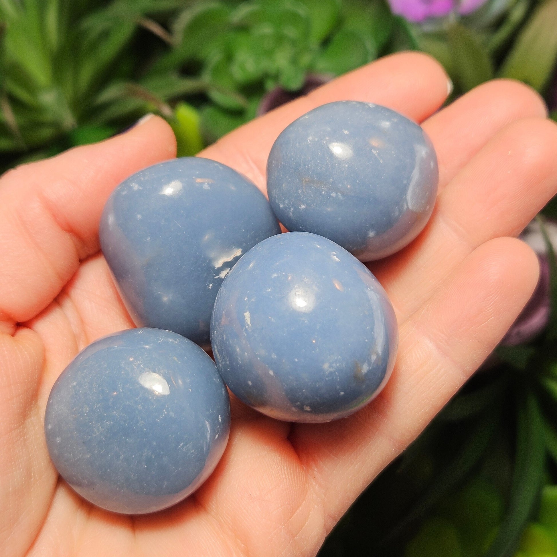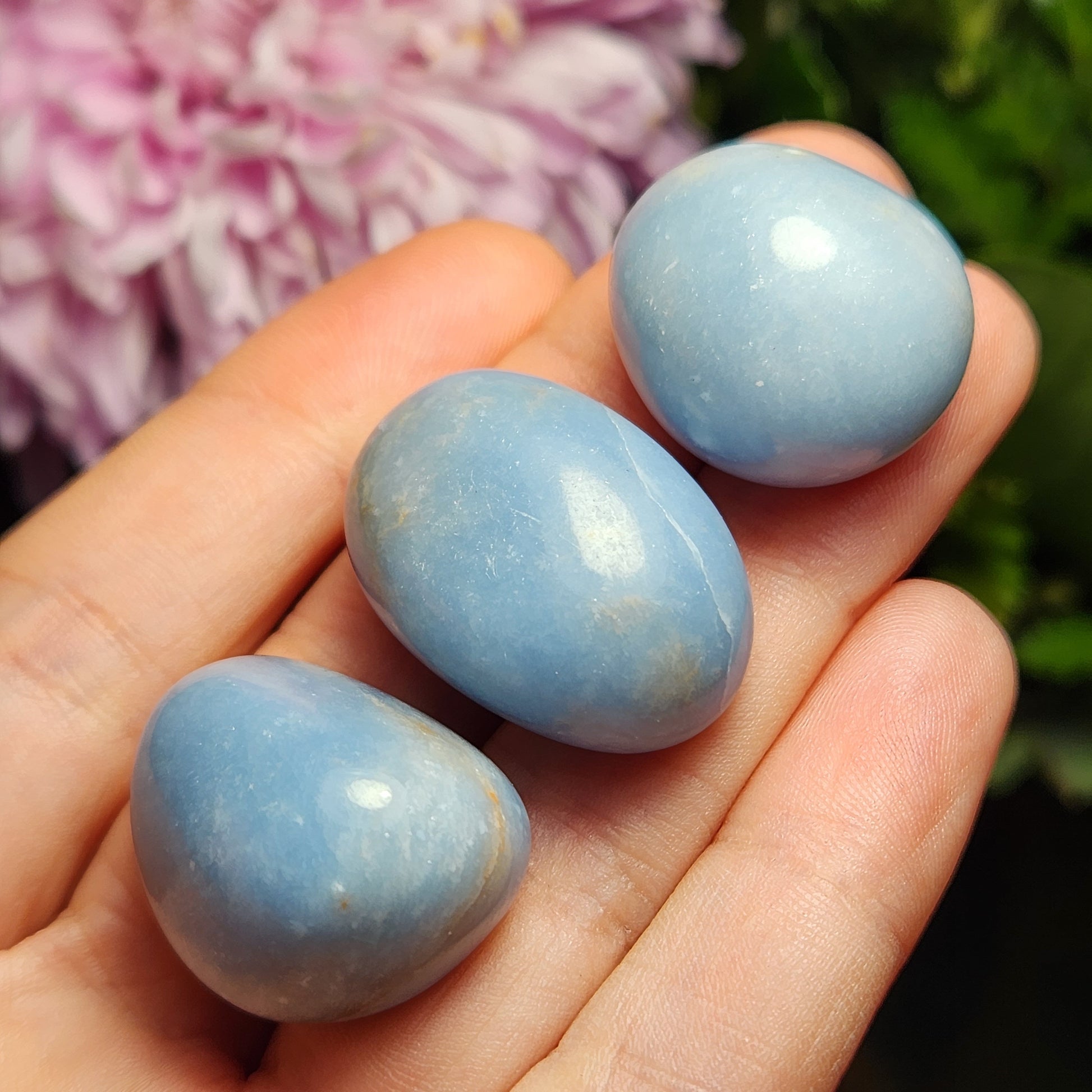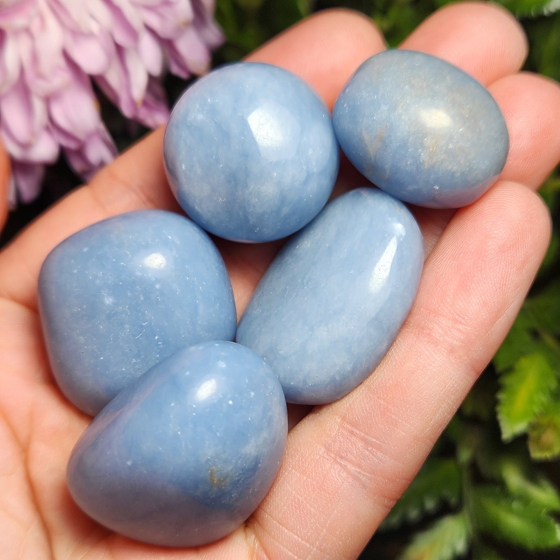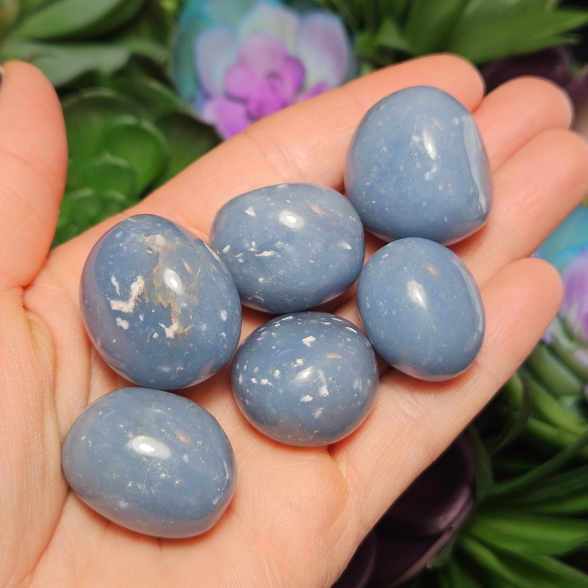 These Angelite crystals have been tumbled to a high polish and exhibit a soothing, cornflower blue color.