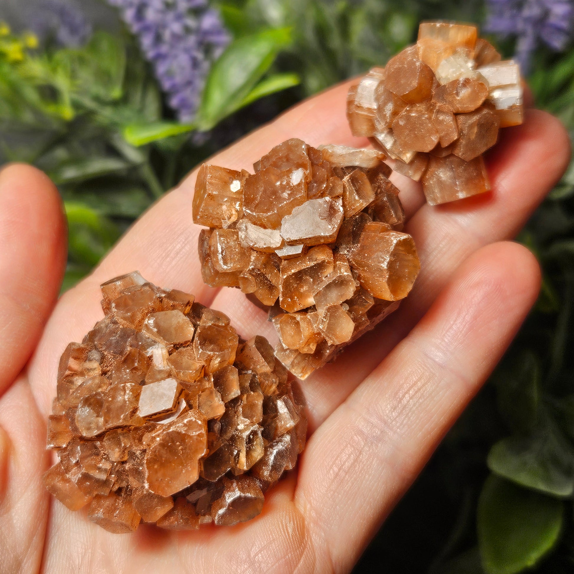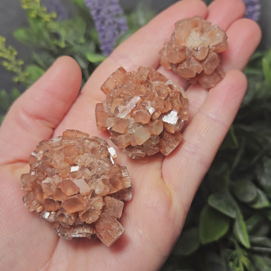 These Aragonite clusters have a rusty brown color and a slight translucence. Each cluster has a unique shape created by bursts of radial terminated crystals.