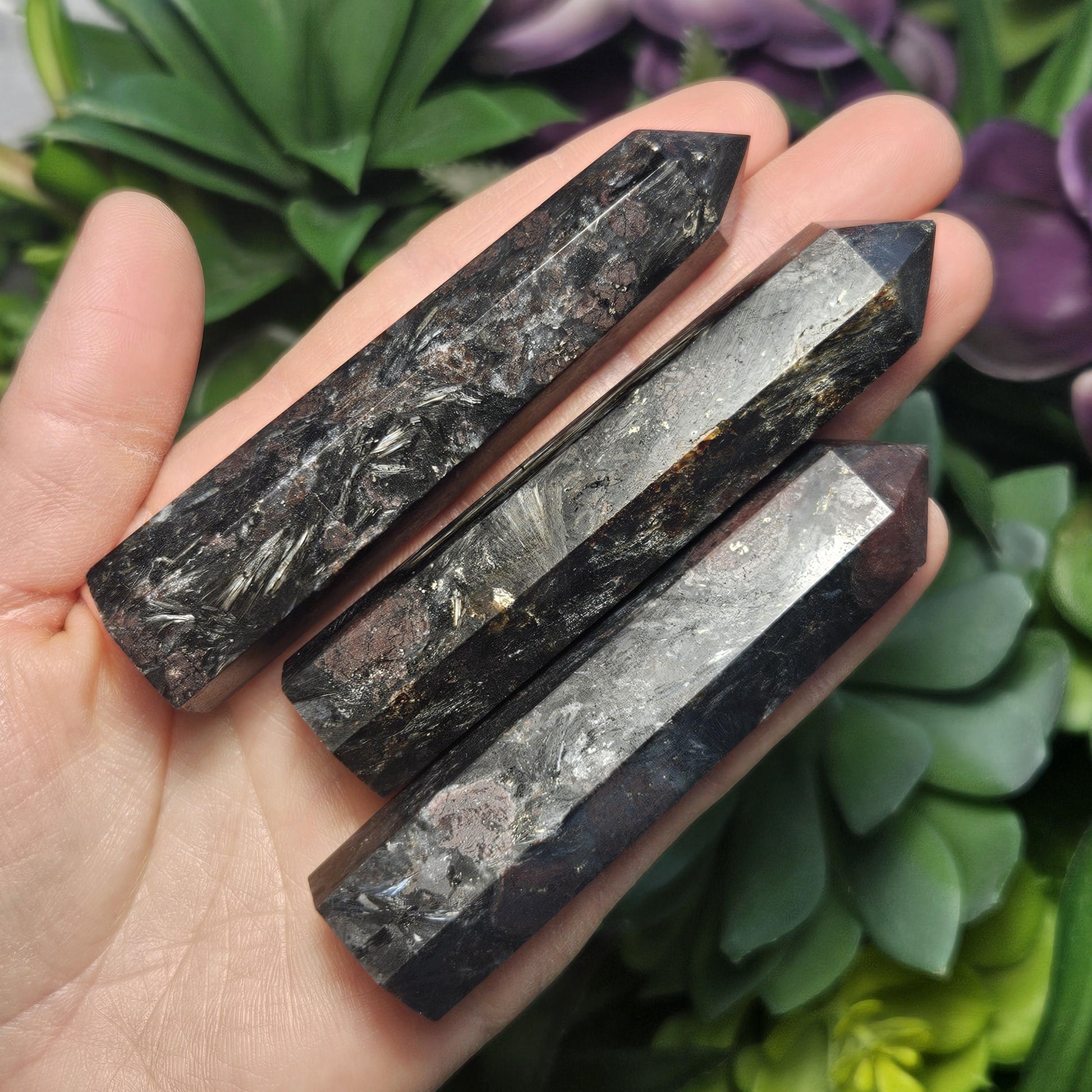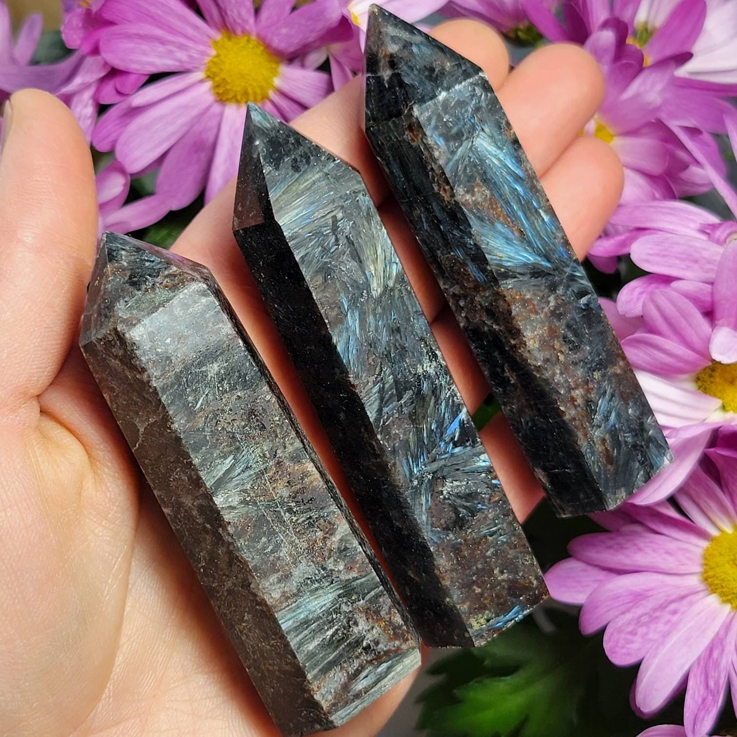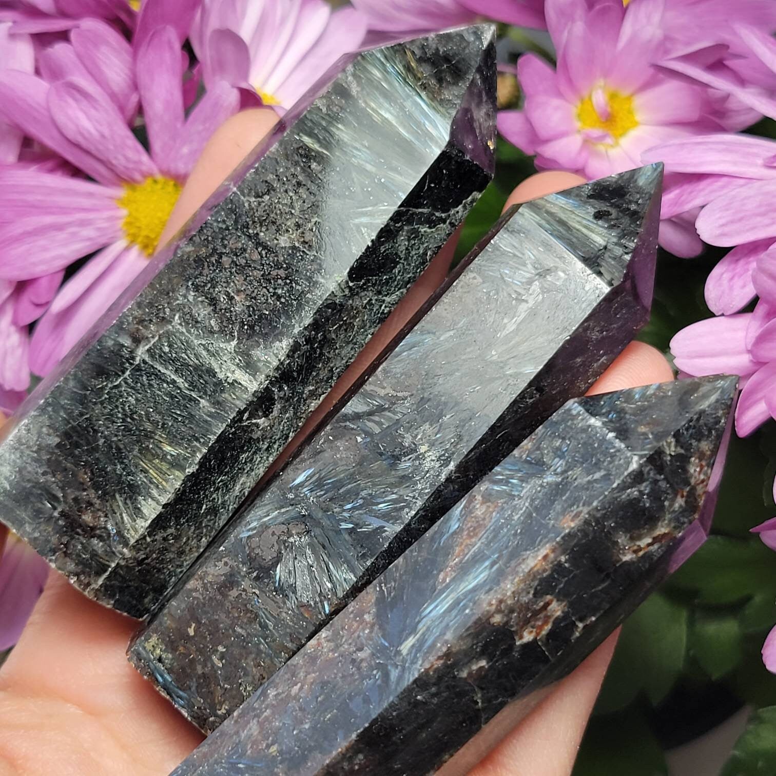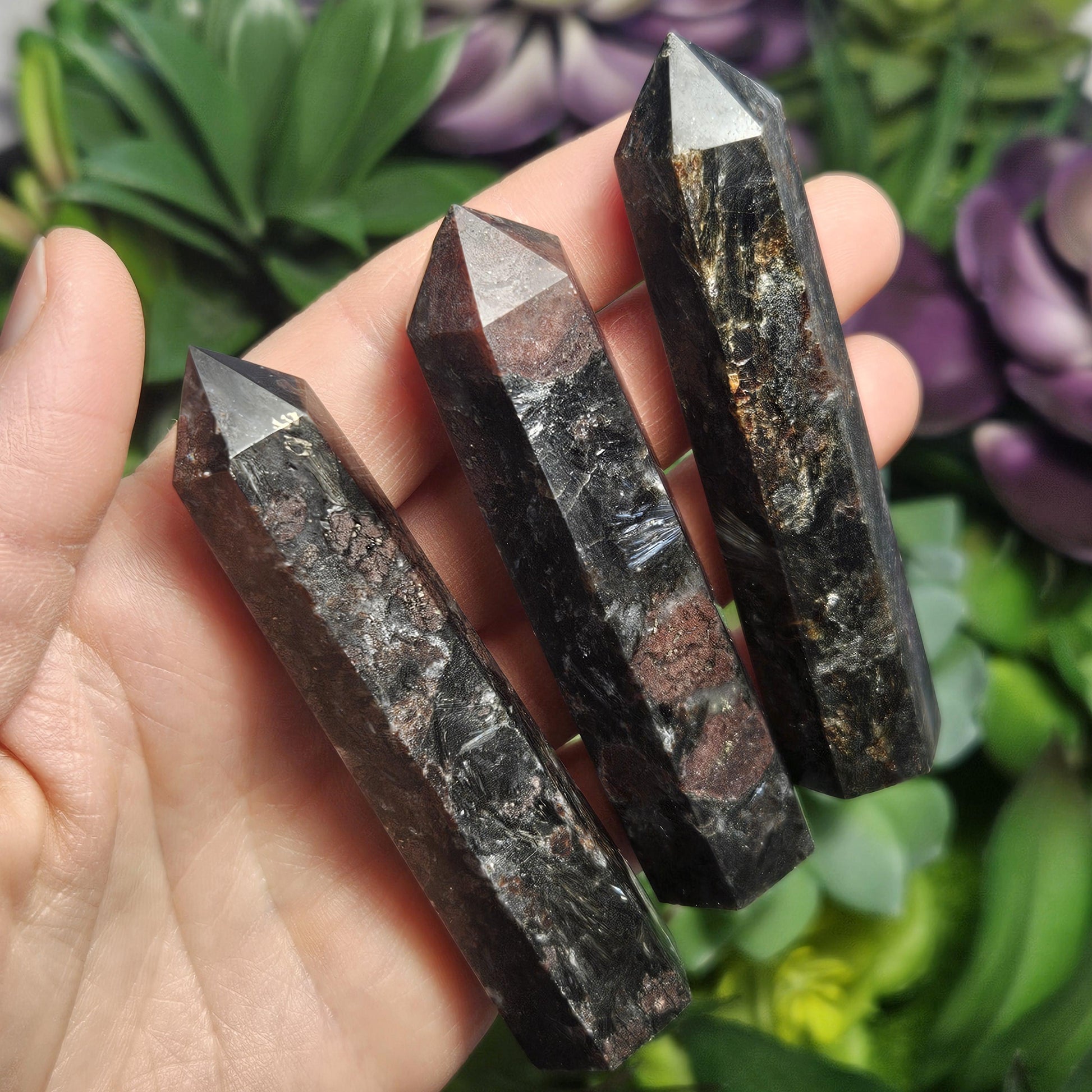 These unique towers are made from a material that is a combination of blue-grey streaks of Arfvedsonite, mixed with rusty hued notes of Astrophyllite and red Garnet inclusions. These three energies combined form a powerful tool that aids in awareness and acceptance of self. This listing is for one generator tower we will intuitively choose for you. Each specimen measures between 2.5 and 3 inches.