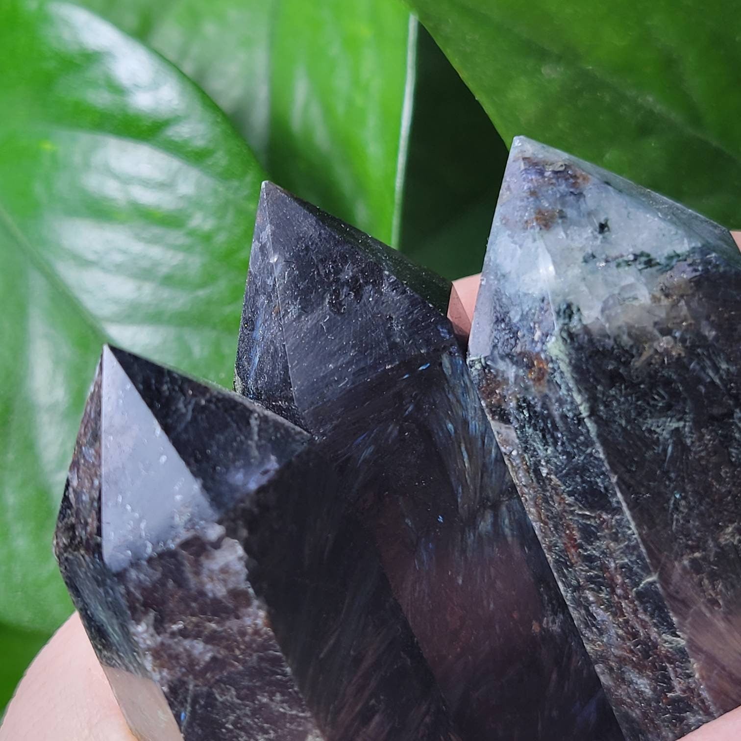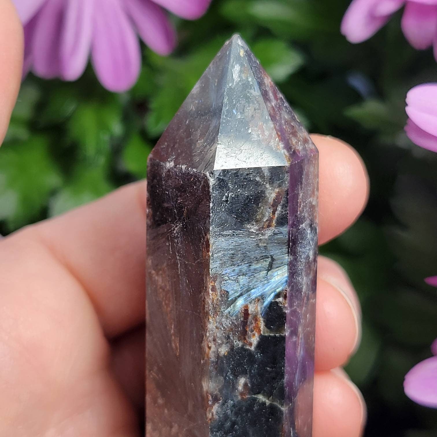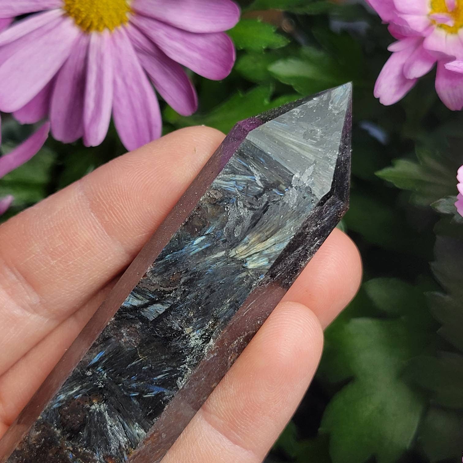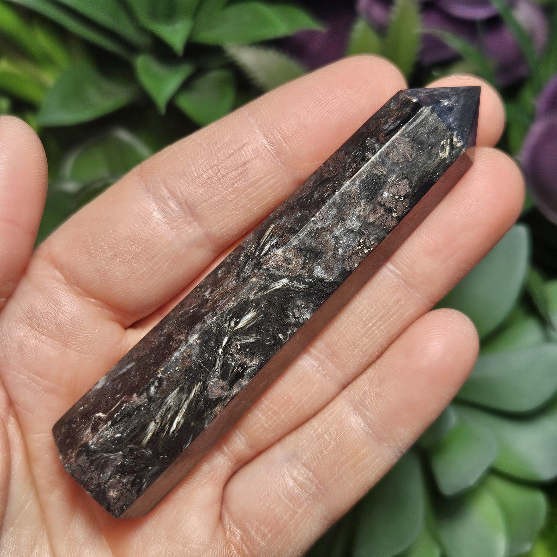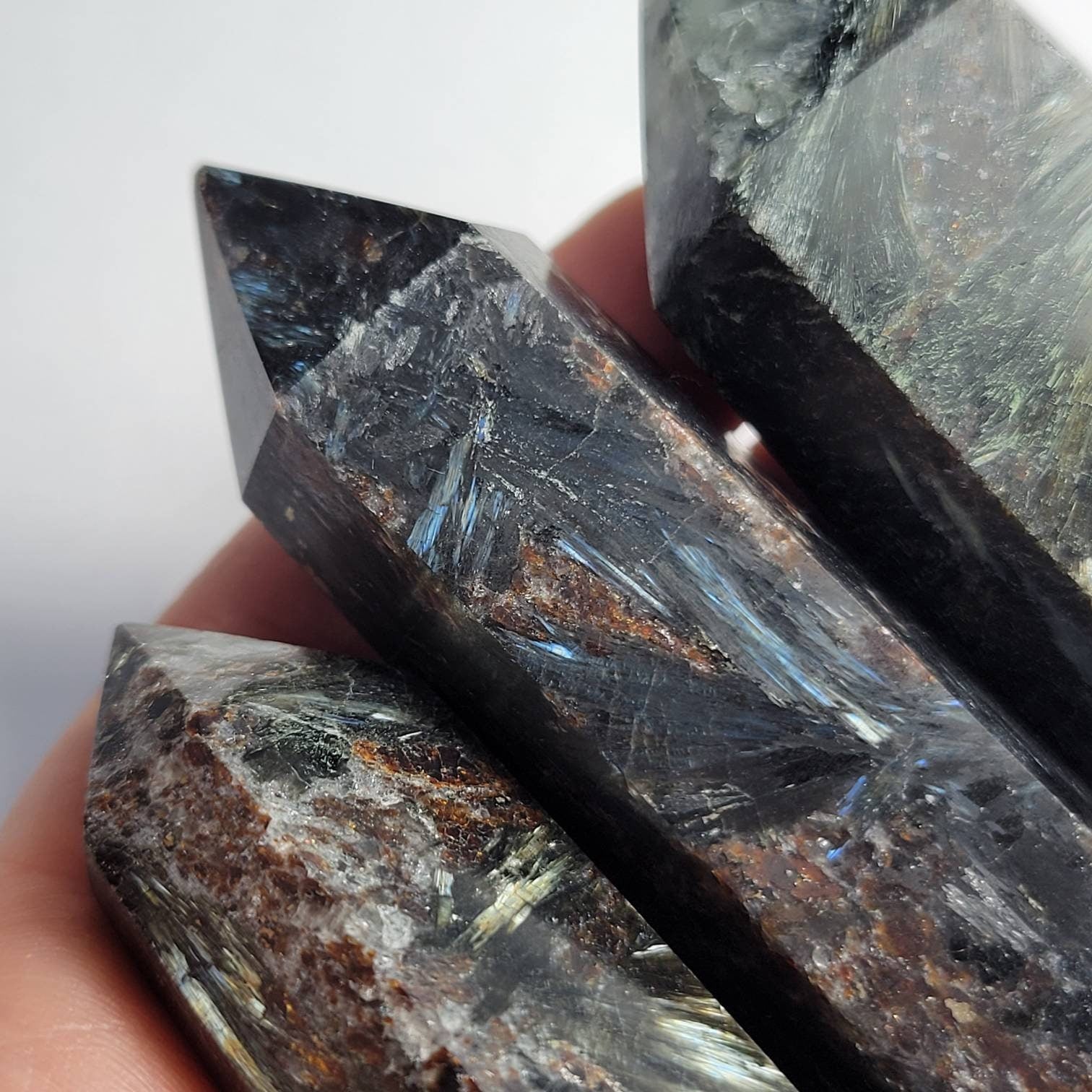 These unique towers are made from a material that is a combination of blue-grey streaks of Arfvedsonite, mixed with rusty hued notes of Astrophyllite and red Garnet inclusions. These three energies combined form a powerful tool that aids in awareness and acceptance of self. This listing is for one generator tower we will intuitively choose for you. Each specimen measures between 2.5 and 3 inches.
