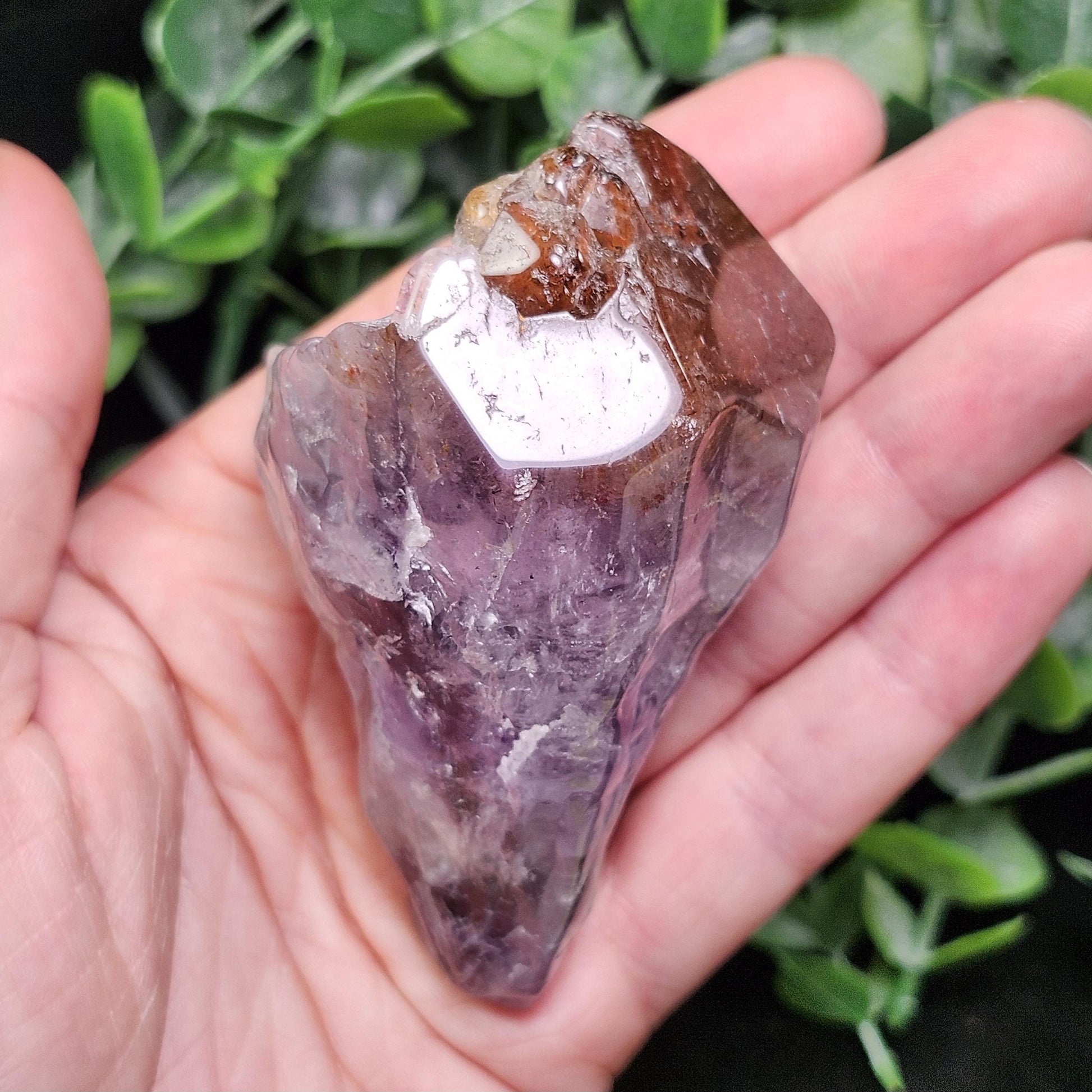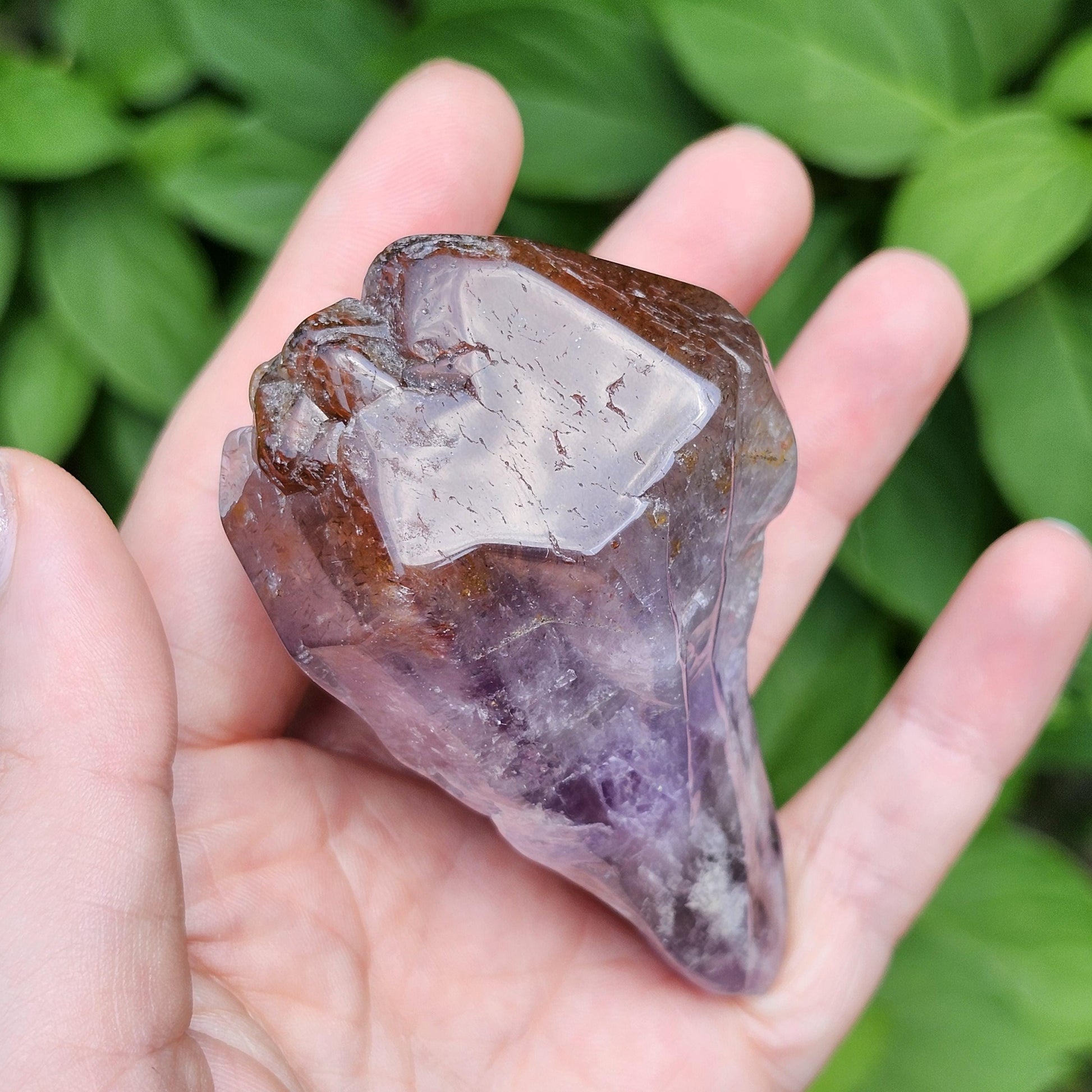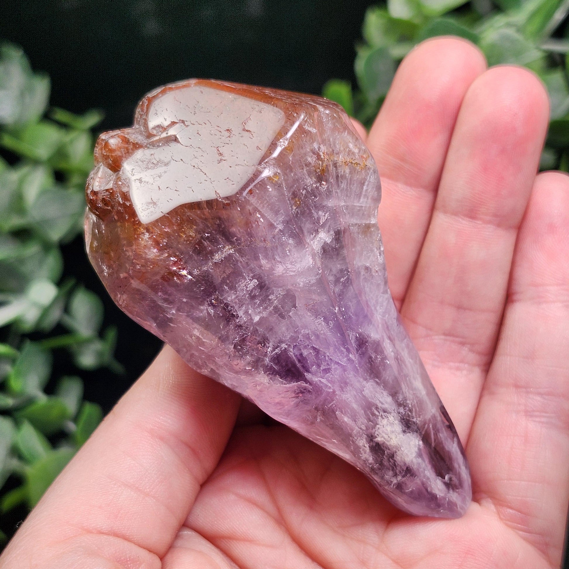 This polished Auralite 23 crystal from Thunder Bay, Ontario exhibits bands of distinct minerals, pairing smoky purple with a crimson red cap. This specimen measures 76mm by 40mm and weighs 135 grams.
