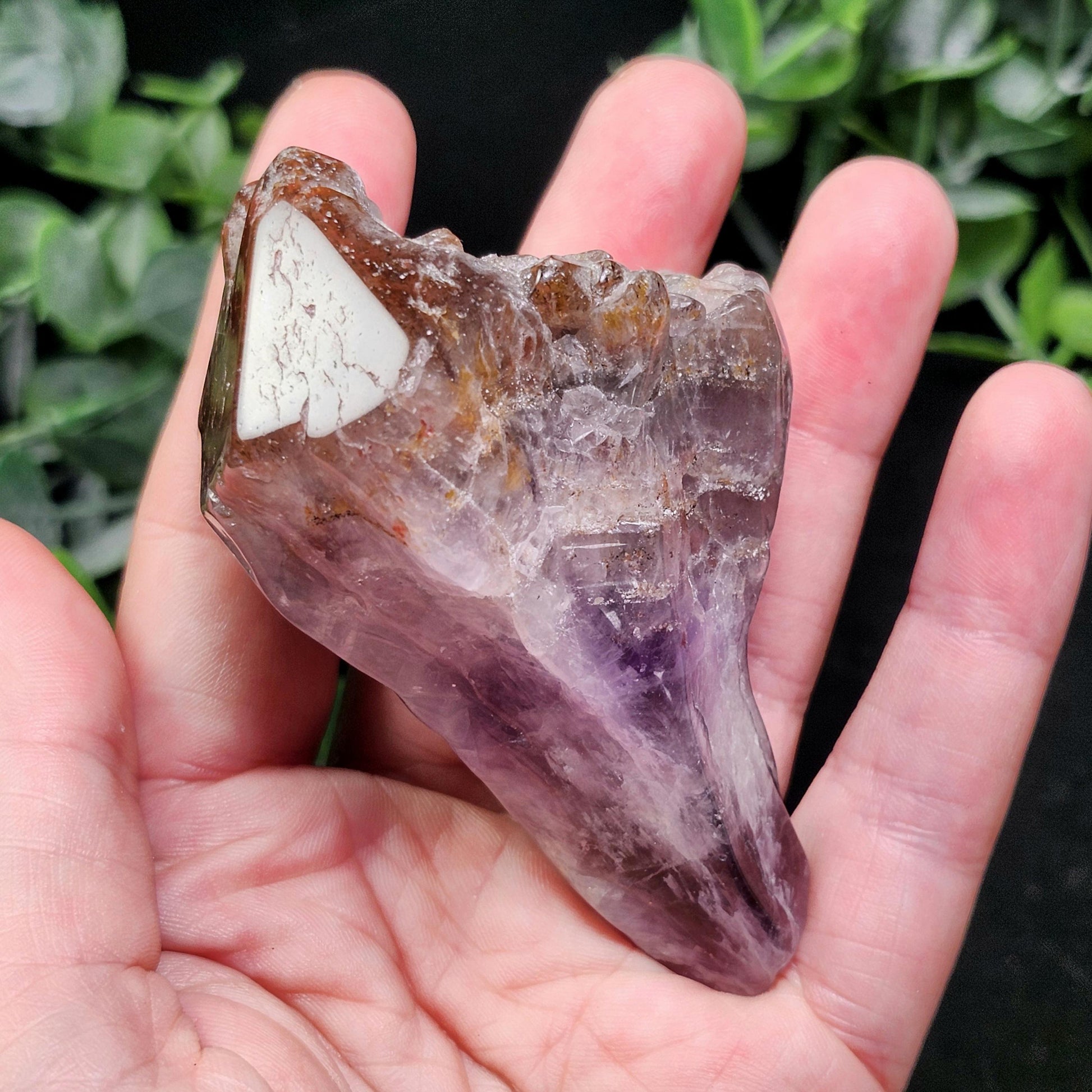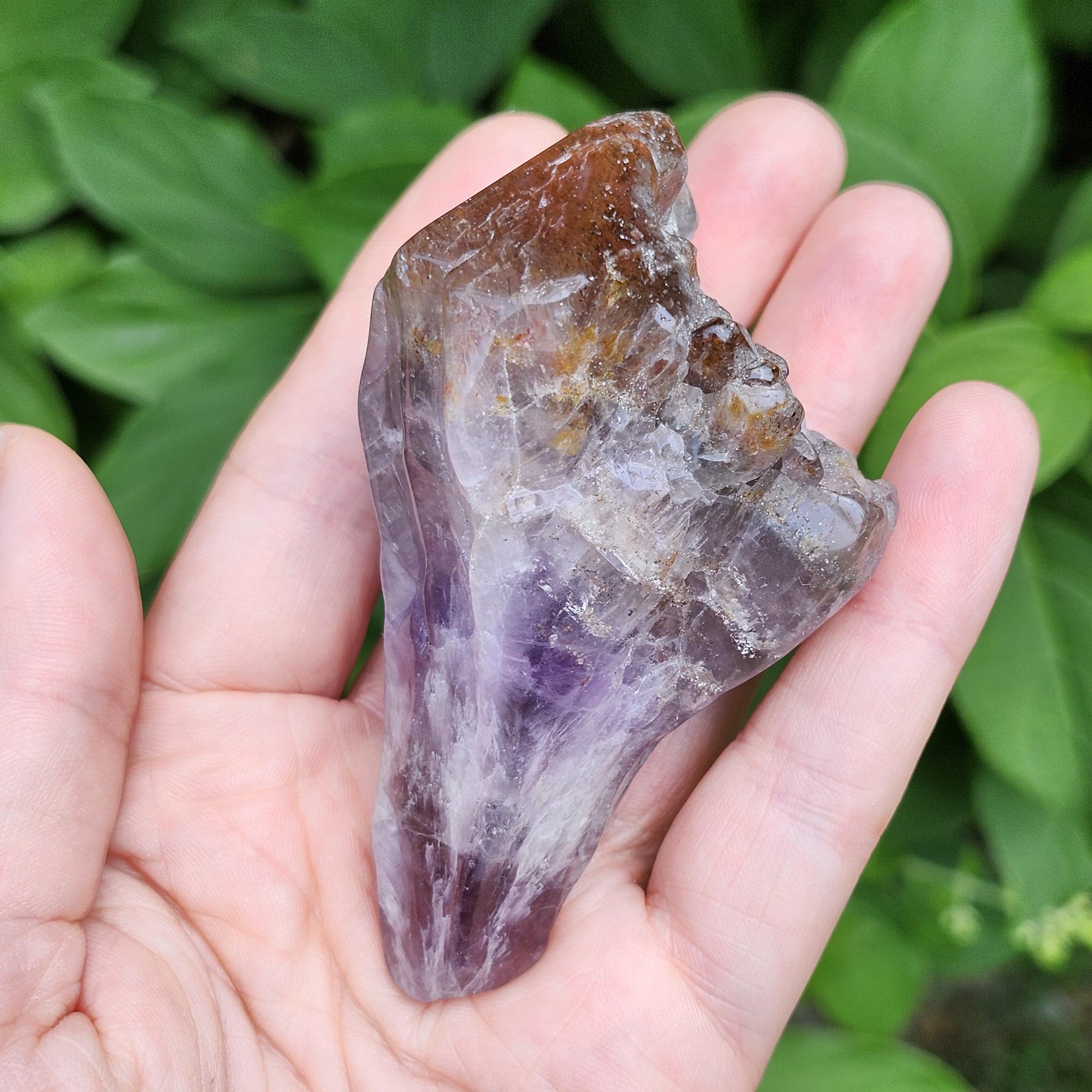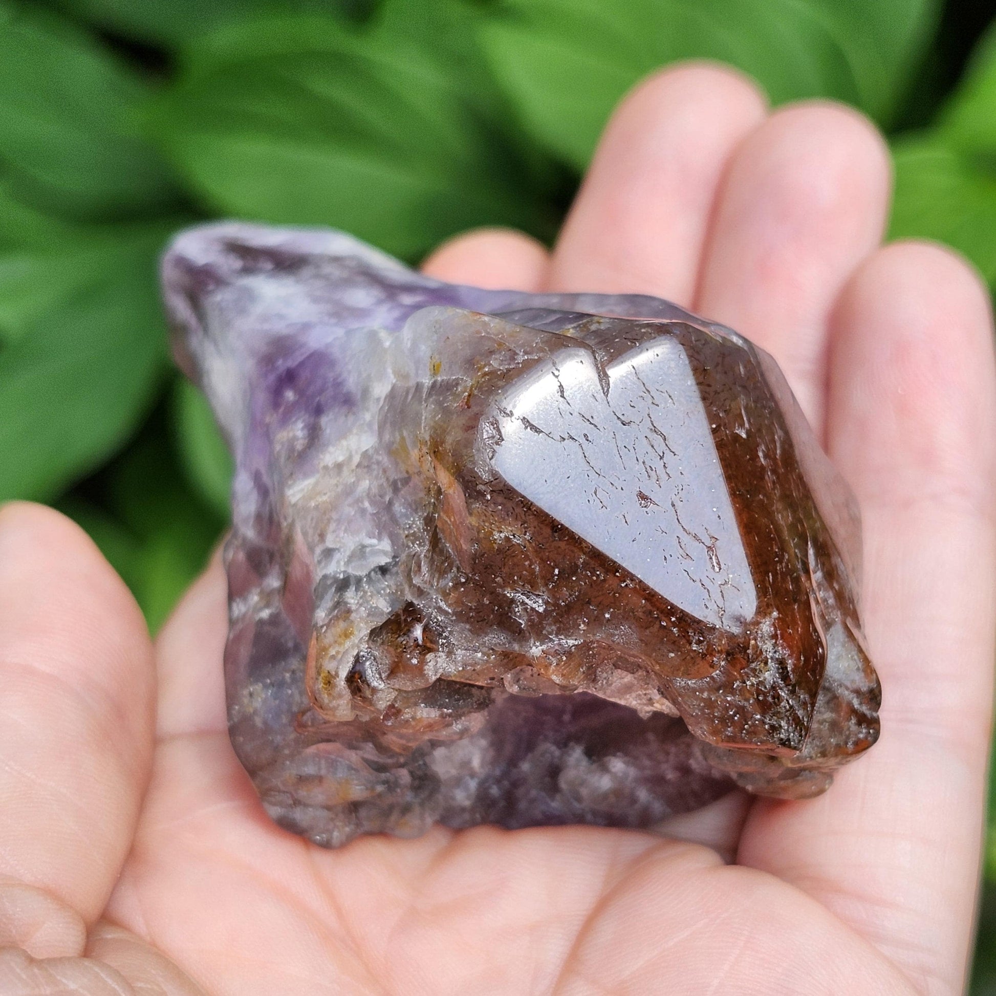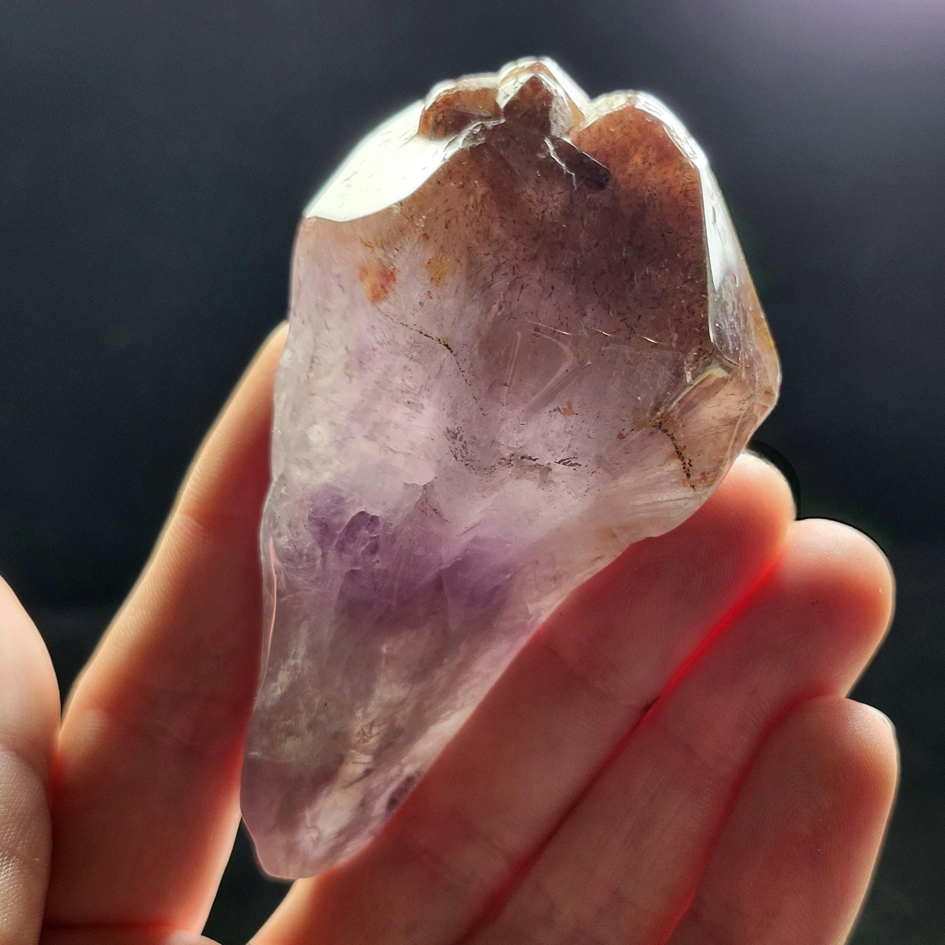 This polished Auralite 23 crystal from Thunder Bay, Ontario exhibits bands of distinct minerals, pairing smoky purple with a crimson red cap. This specimen measures 76mm by 40mm and weighs 135 grams.