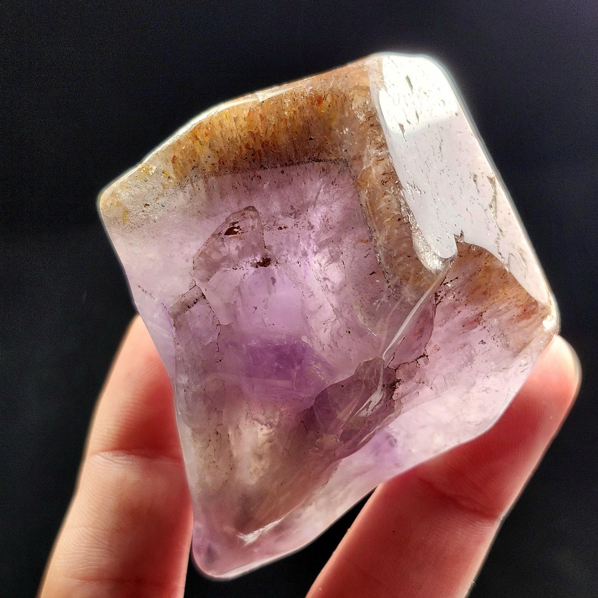 This polished Auralite 23 crystal from Thunder Bay, Ontario exhibits bands of distinct minerals, pairing smoky purple with a crimson red cap. This specimen measures 73mm by 51mm and weighs 136 grams.