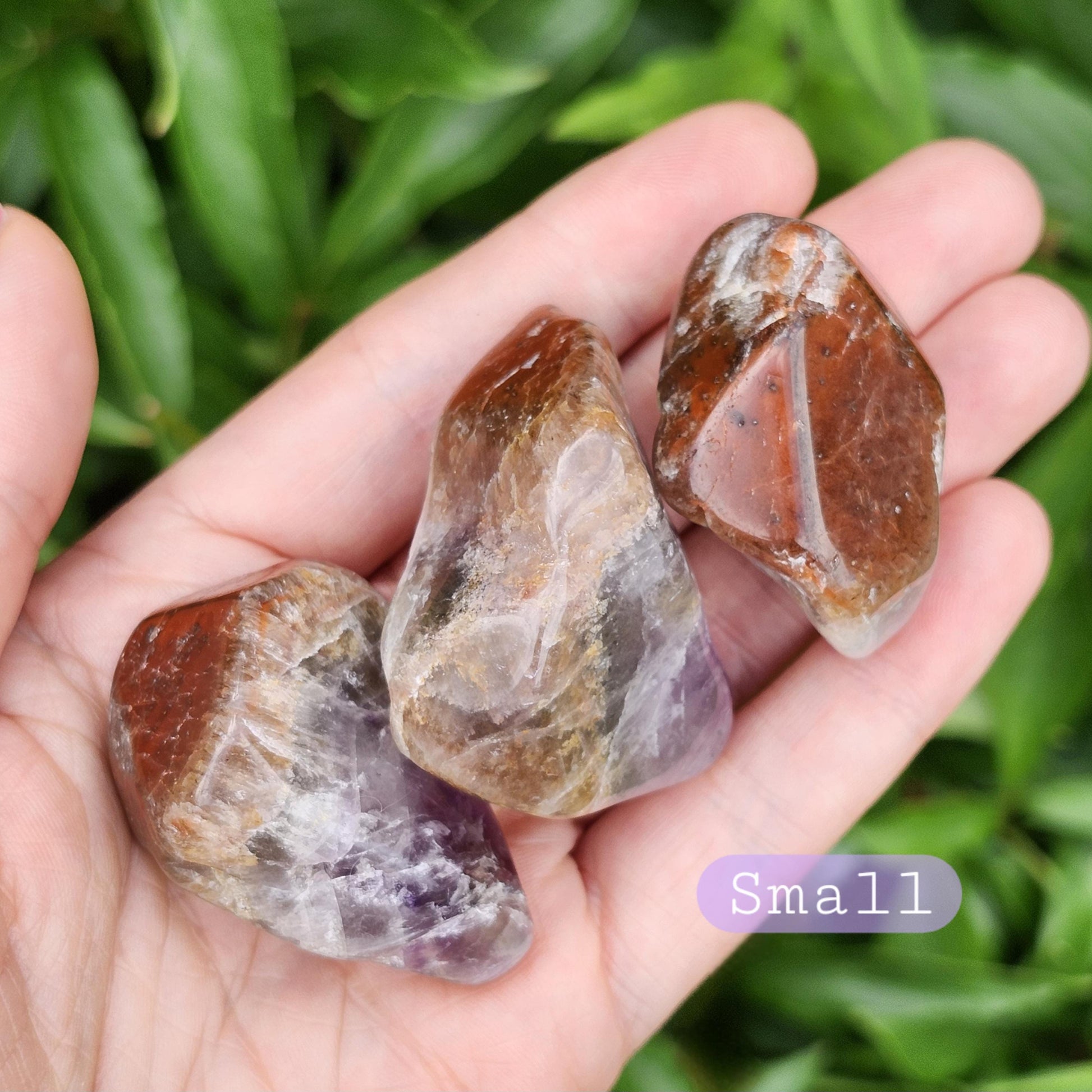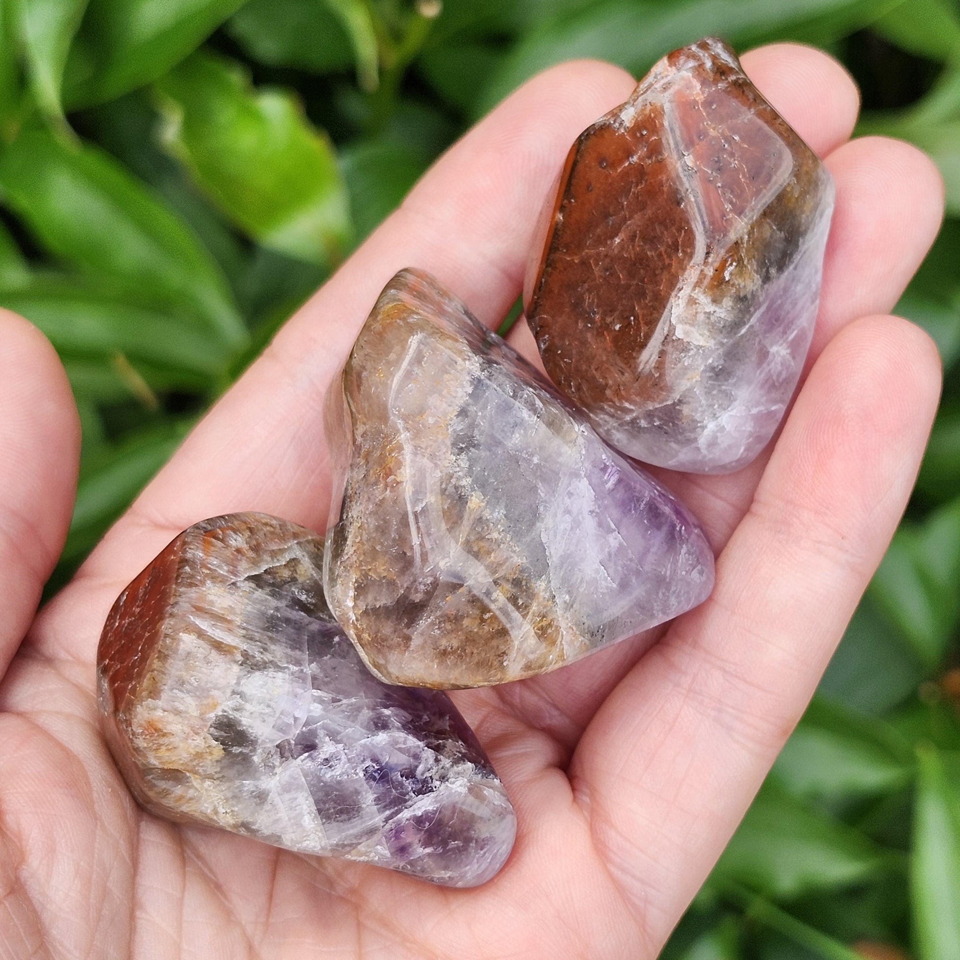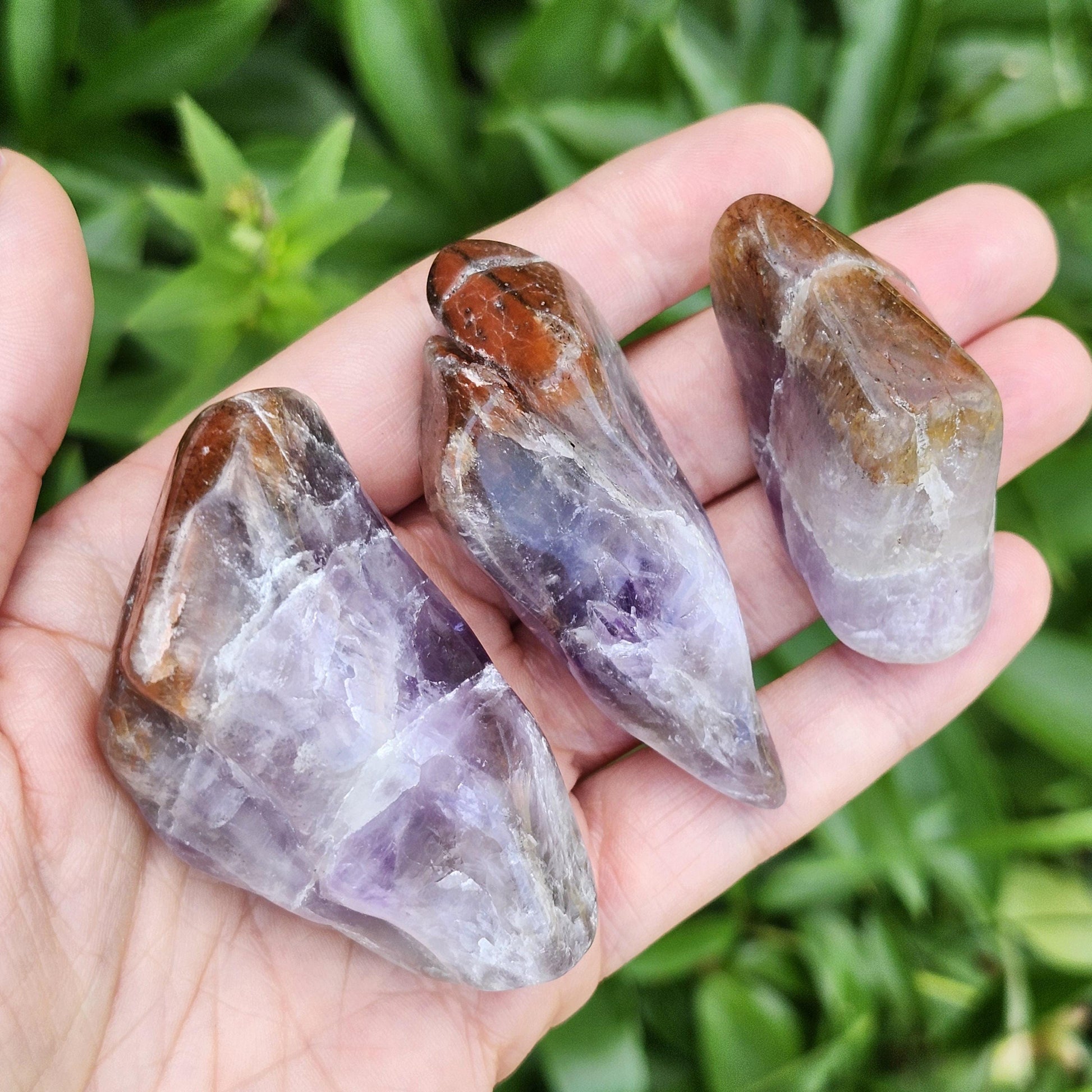 These polished Auralite 23 crystals display purple coloring and visible banding with dark, light, and smoky tones. They have brick-red caps that range from faint to deep, saturated spots.
