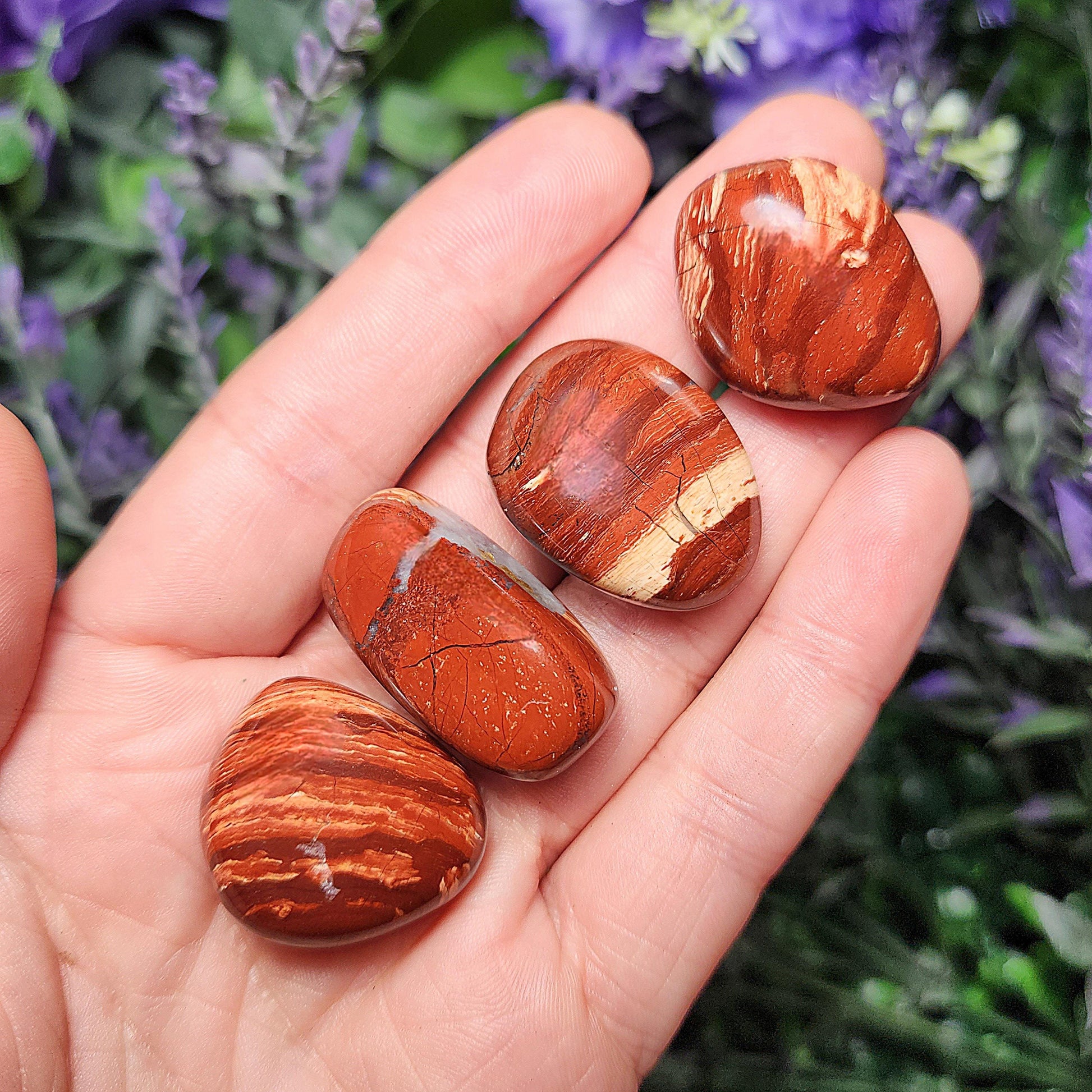 These Red Jasper crystals have been tumbled to a high sheen. They exhibit a brilliant brick red coloring with banded and swirled patterns, each one completely unique. Each specimen measures between .75 inches and 1 inch.
