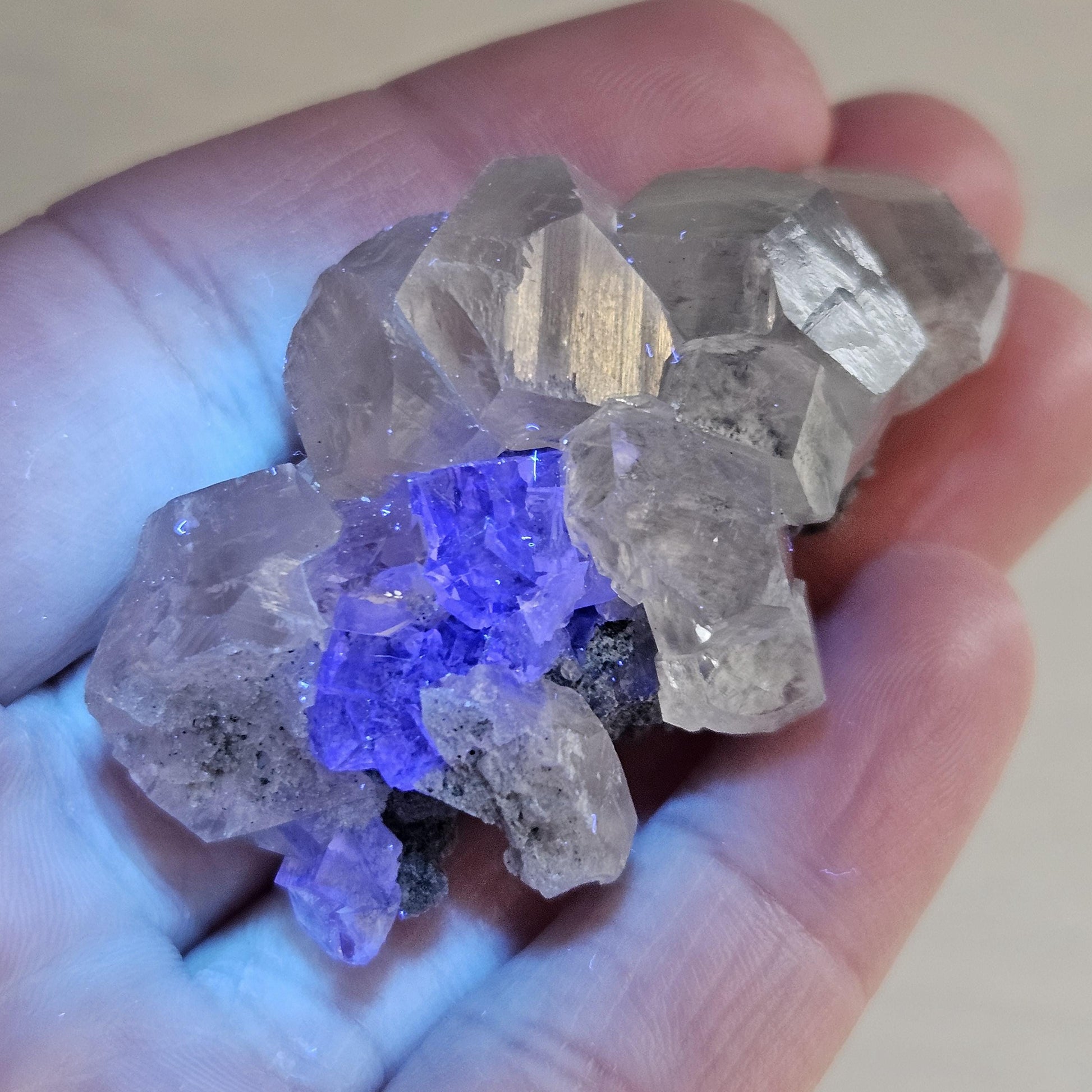 This unique crystal cluster has "Benz" shaped Calcite formations, exhibiting trigonal scalenohedral terminations. Hidden within the clear Calcite are small crystals of UV reactive clear Fluorite - a characteristic of the specimen that becomes apparent when it is exposed to longwave UV rays. This specimen measures 55mm by 30mm by 26mm and weighs 33.9 grams.