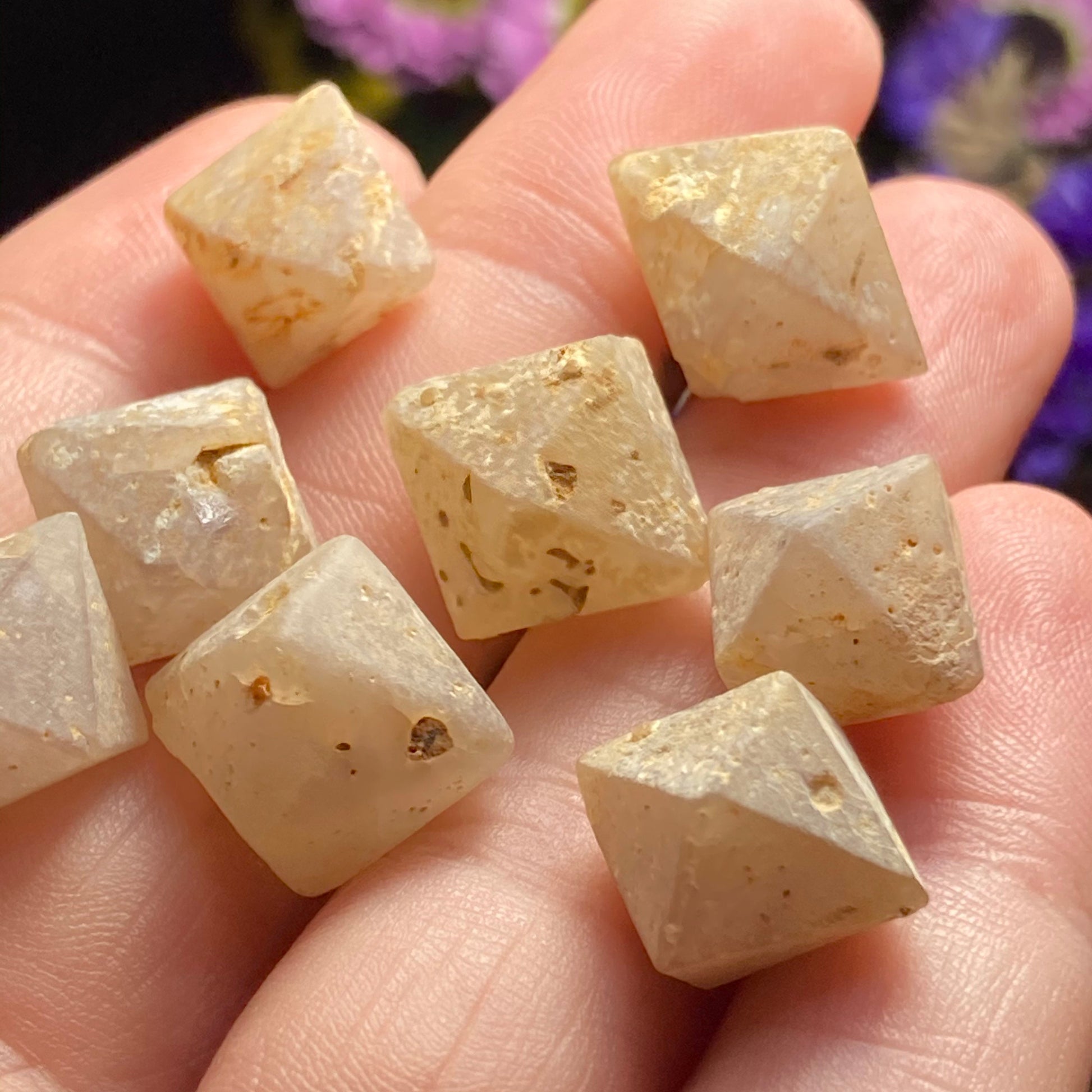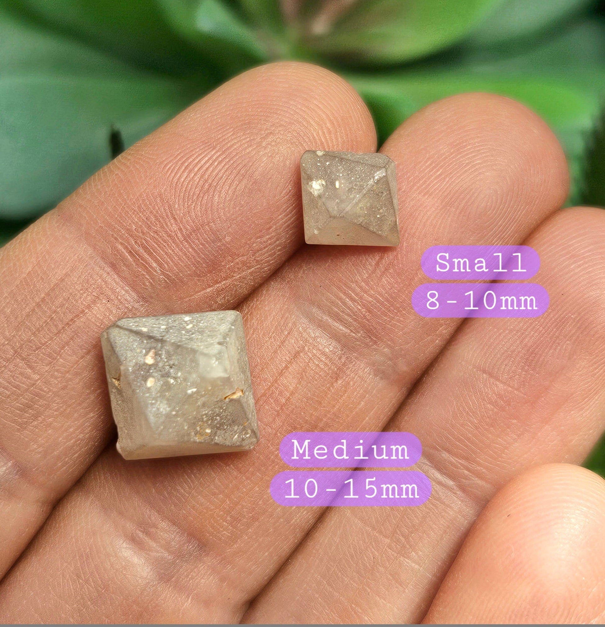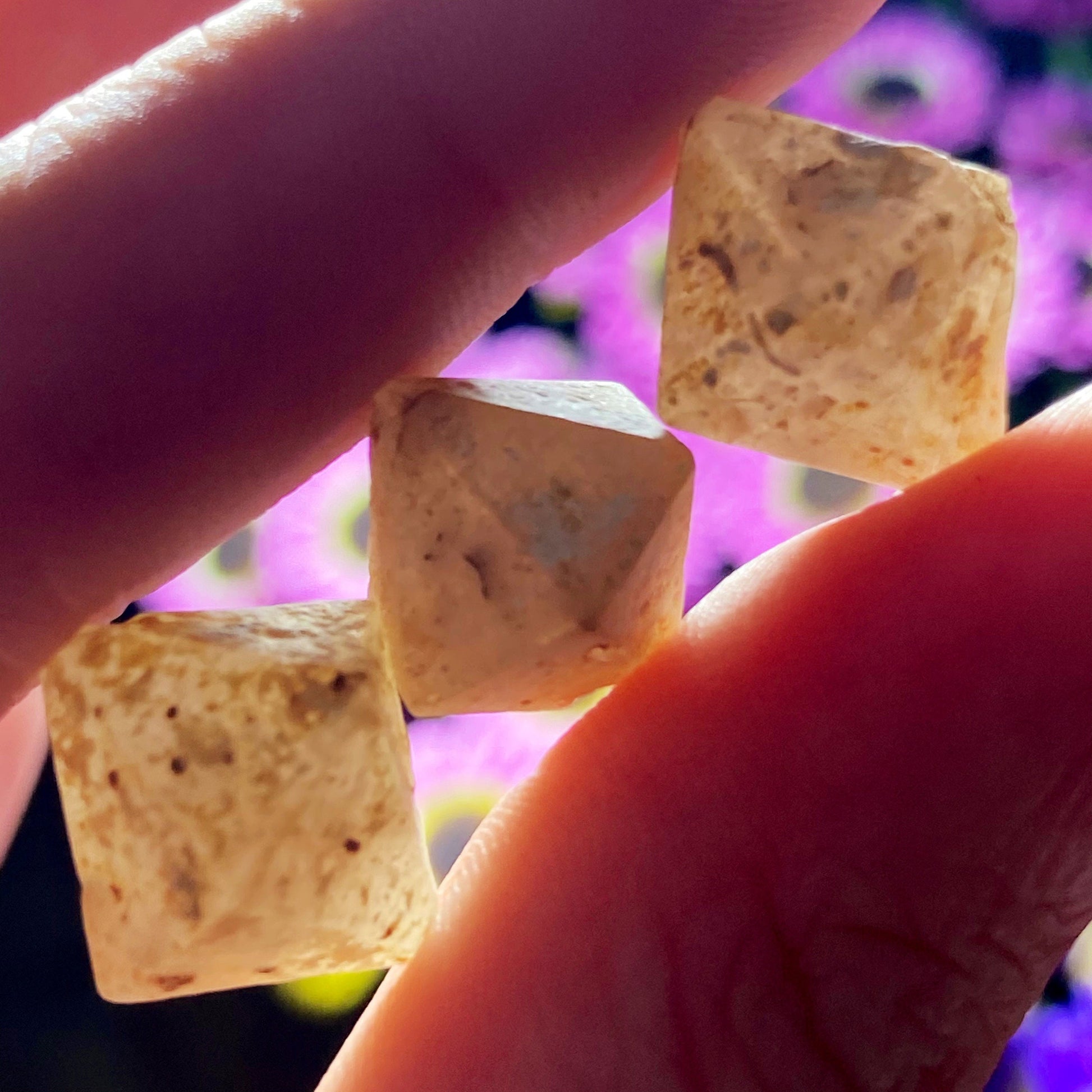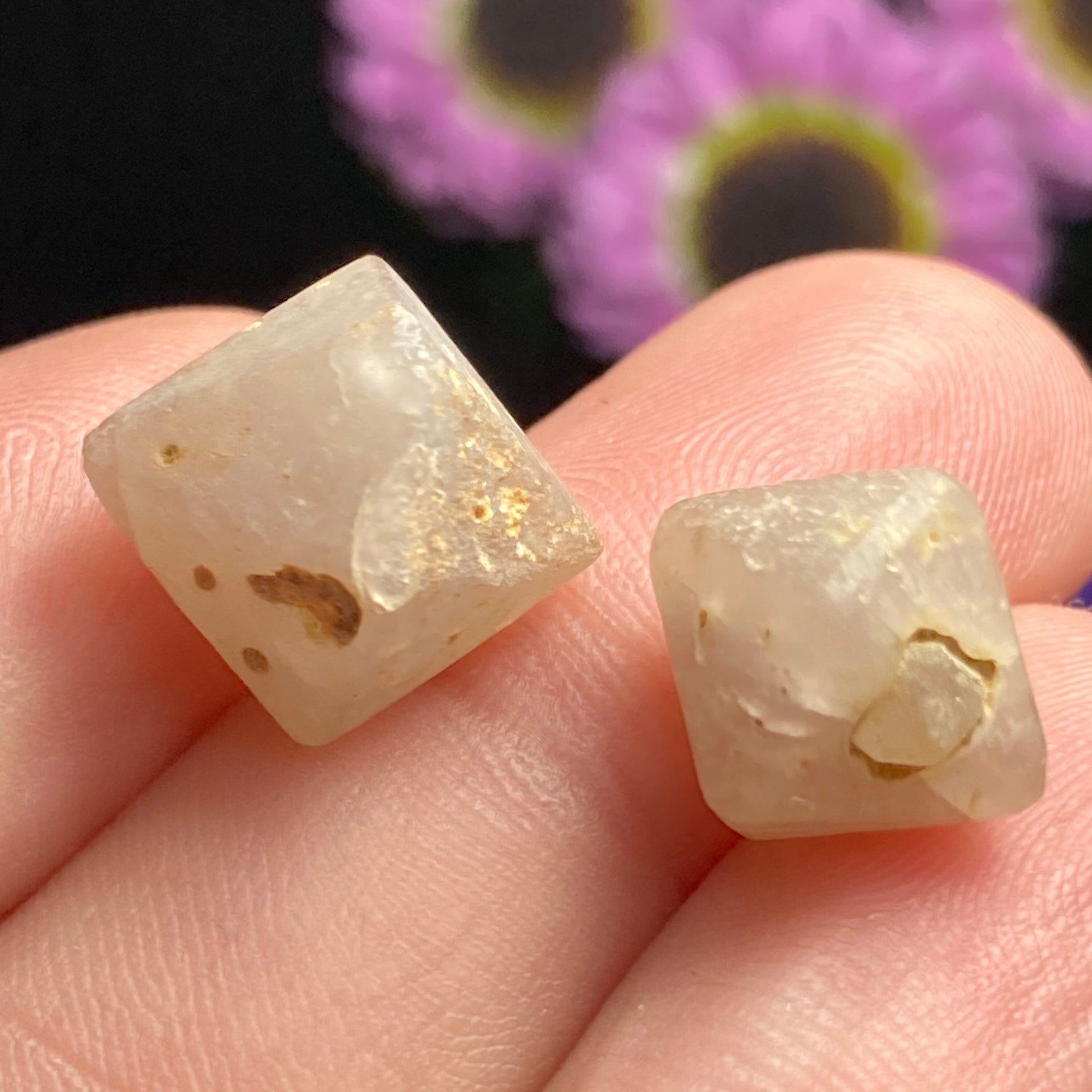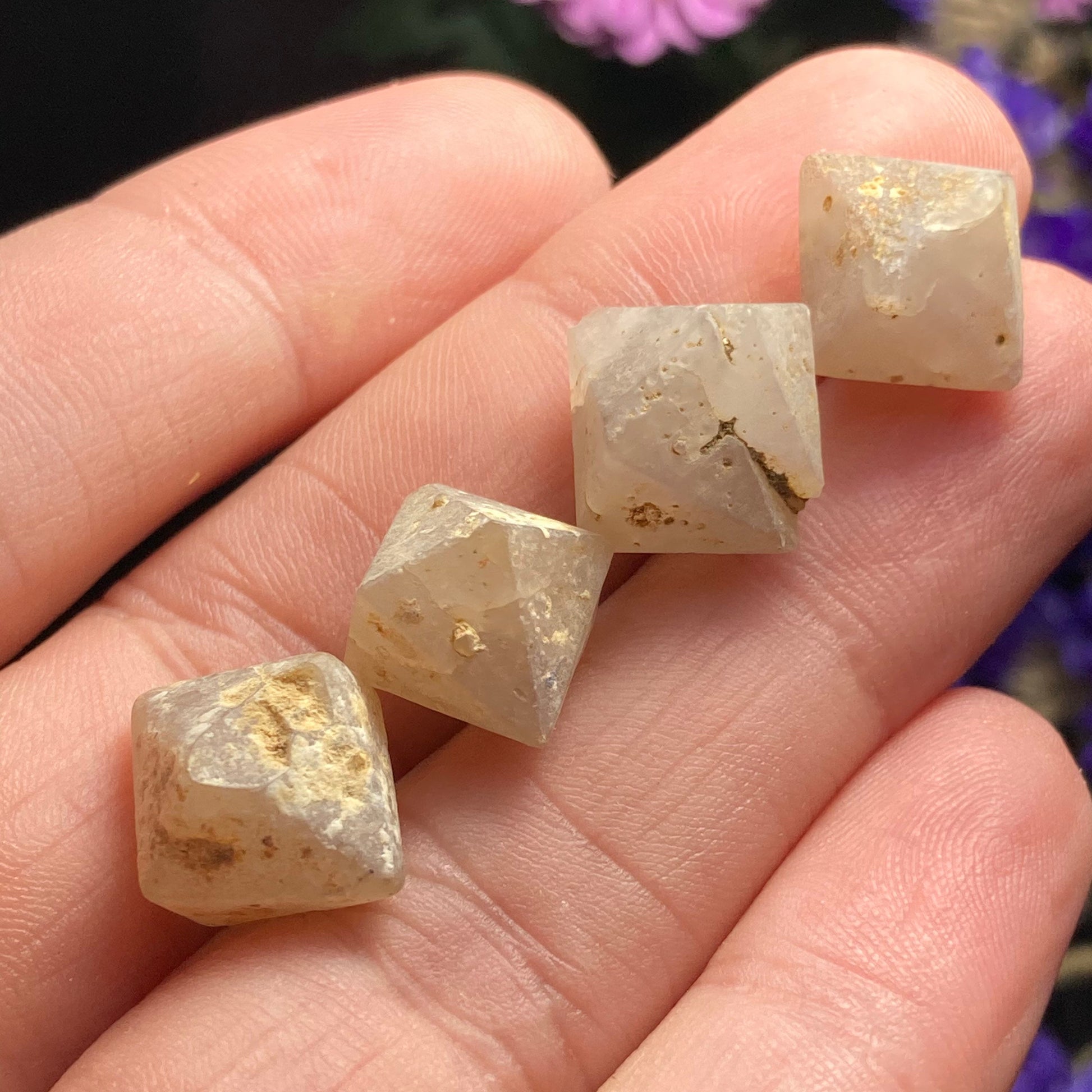 These Beta Quartz crystals are raw and exhibit distinct natural terminations. You can expect sandy colored inclusions and possible small abrasions in these unique specimens.