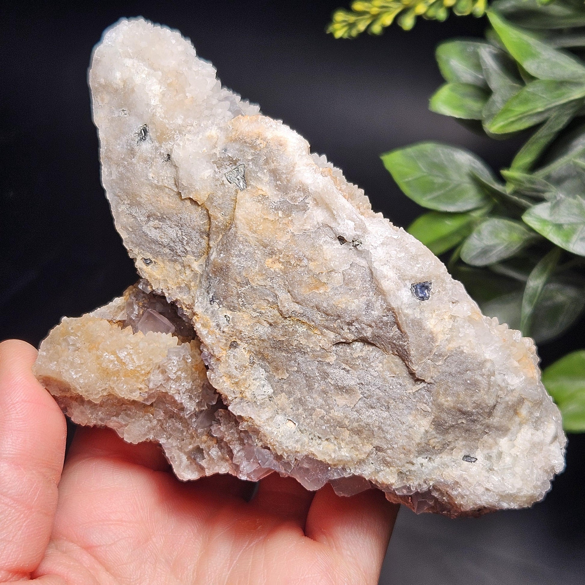 Sourced directly from the historic Blanchard Mine in the Hansonburg District of New Mexico, this captivating Fluorite boasts a vibrant "Bingham blue" hue under UV lighting, a testament to the unique mineral-rich hydrothermal fluids that flowed through these ancient sedimentary rocks. This light clear-lavender colored Fluorite sits on a bed of drusy Quartz crystal and has a sliced base for a stable display. It measures approximately 120 by 70 by 60 millimeters and weighs 352g.