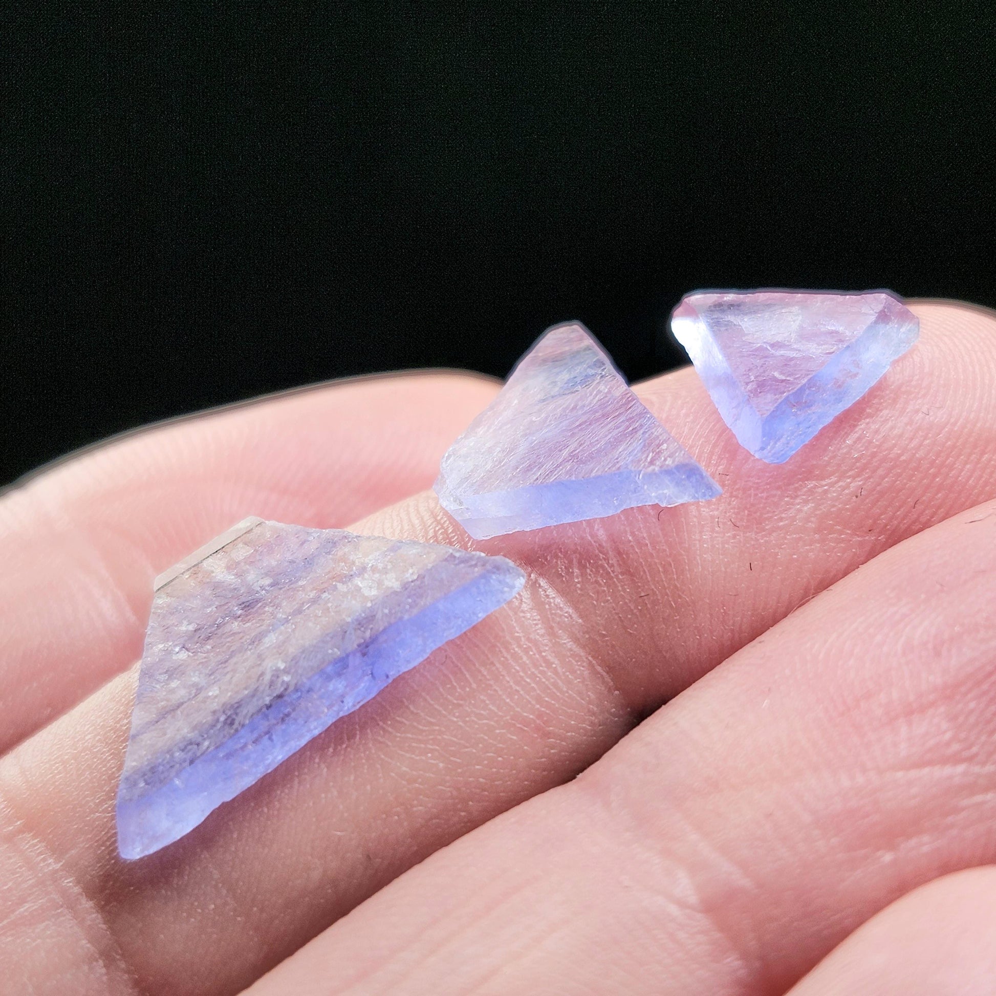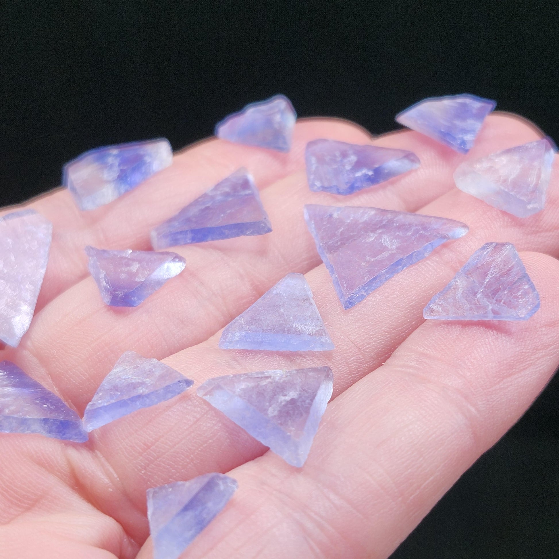 These raw Fluorite crystals are from the Blanchard Mine in Sorocco County, New Mexico. These cleaved fragments exhibit naturally angular, or even triangular, shapes. They have a frosty translucence with blue hues and possible color zoning. These crystals glow with a colorful, saturated brilliance when under a black light - a rare quality in the mineral kingdom. Their fluorescence is strong, with a blue-purple coloring that really pops!