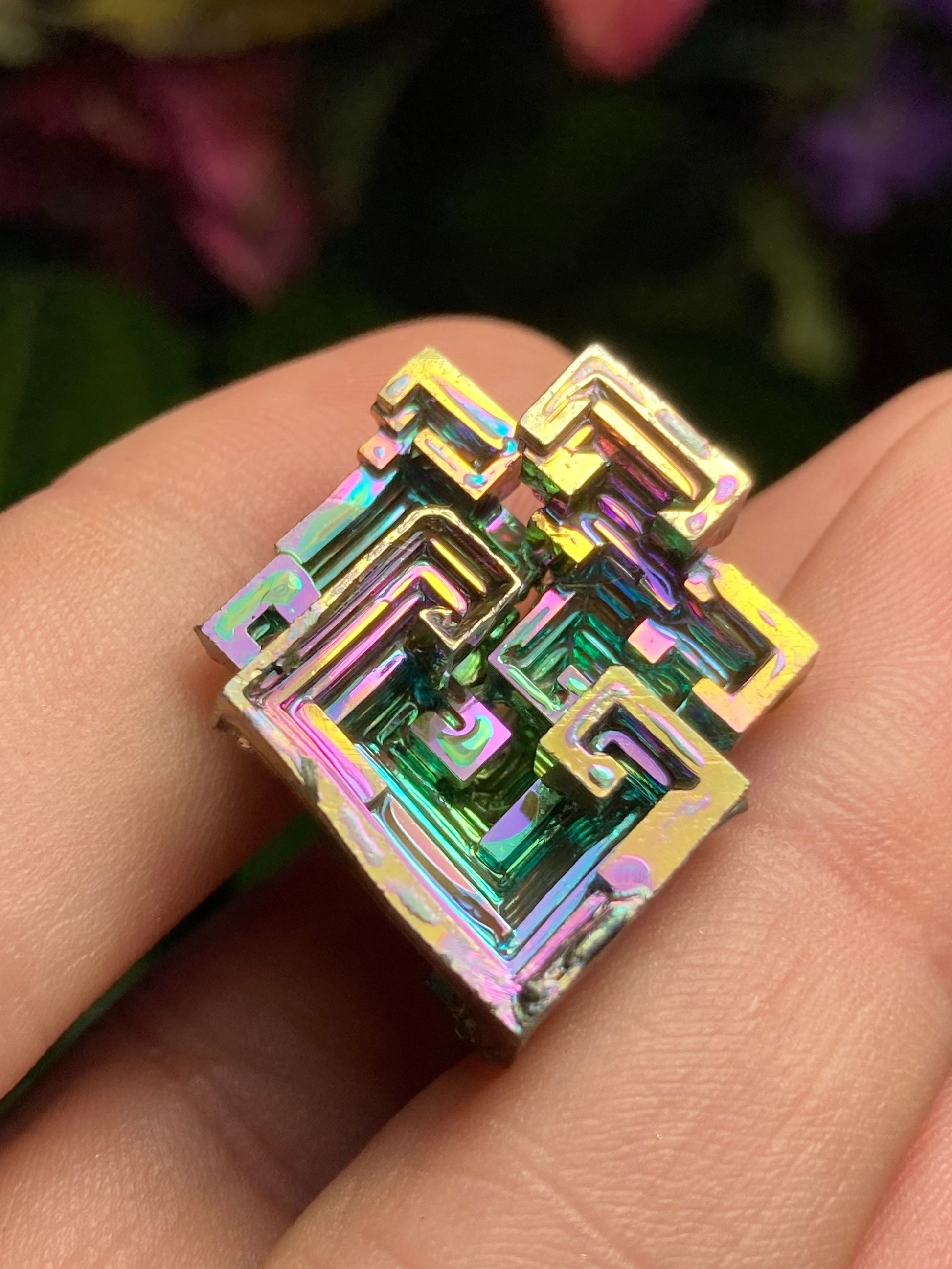 These Bismuth crystals display eccentric rainbow colors and have unique geometric terminations. Each includes an area of silver where the piece separated from its host, a natural inclusion for these unique crystals.