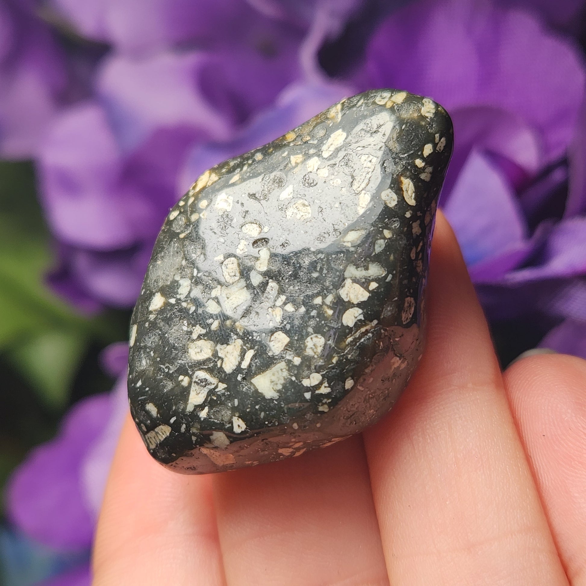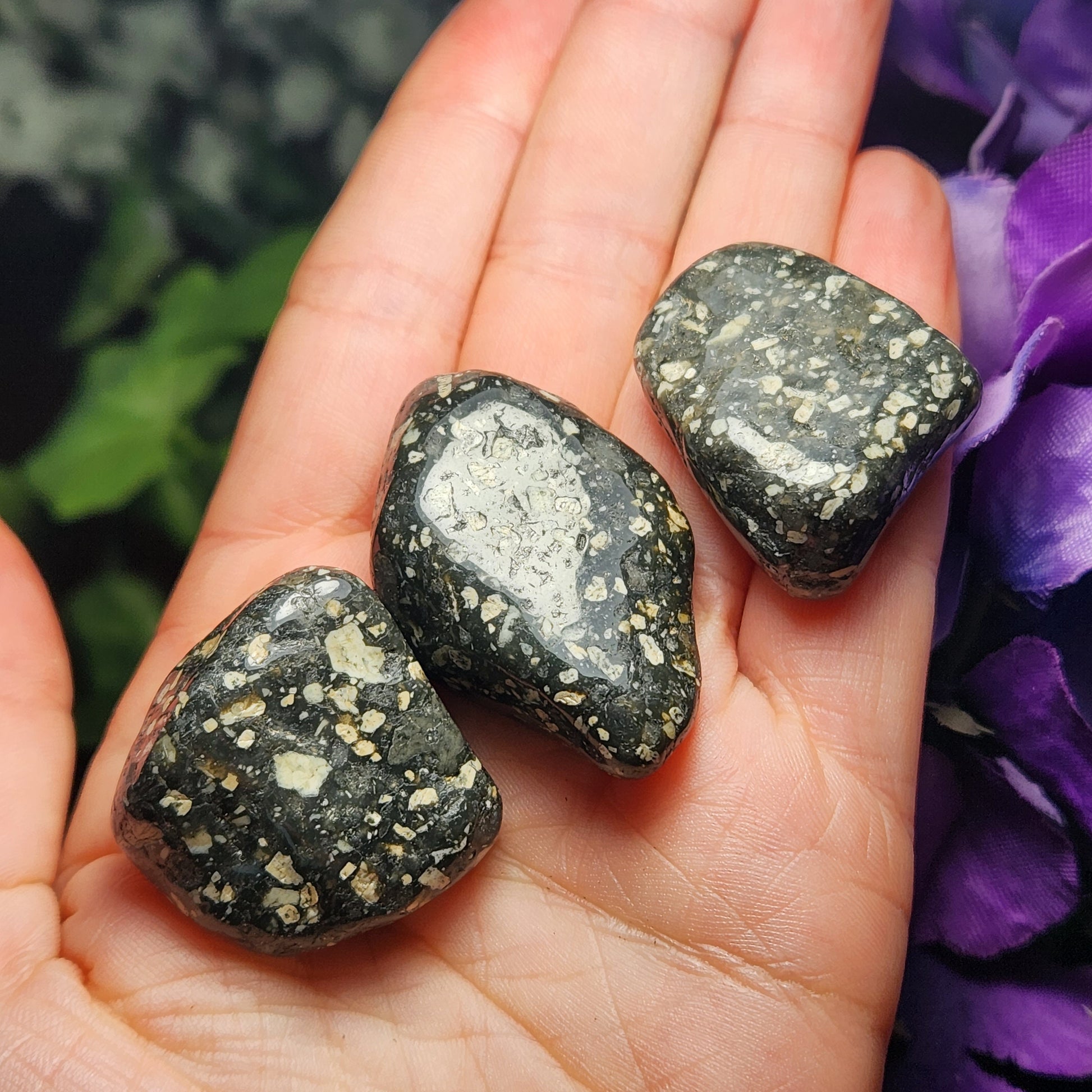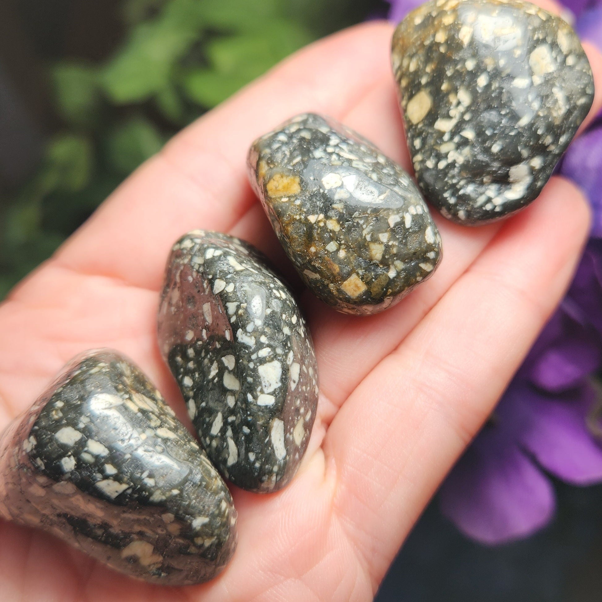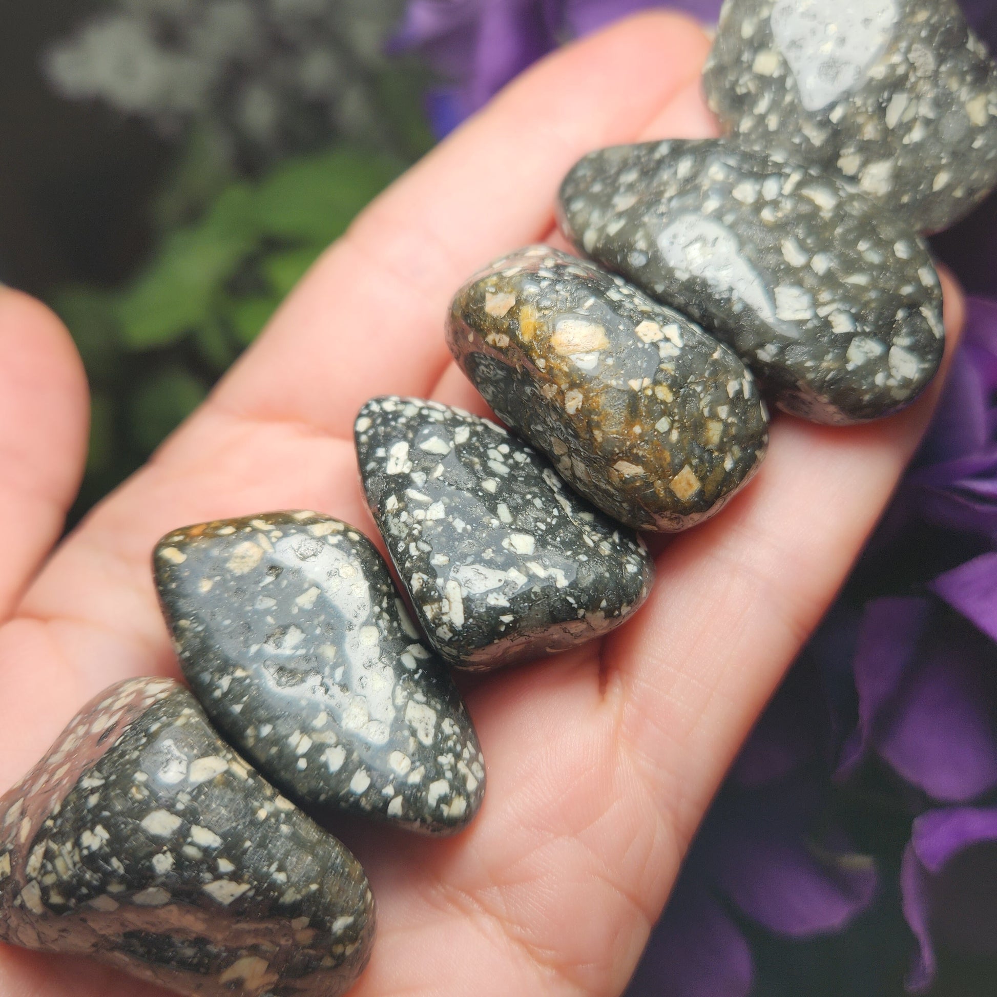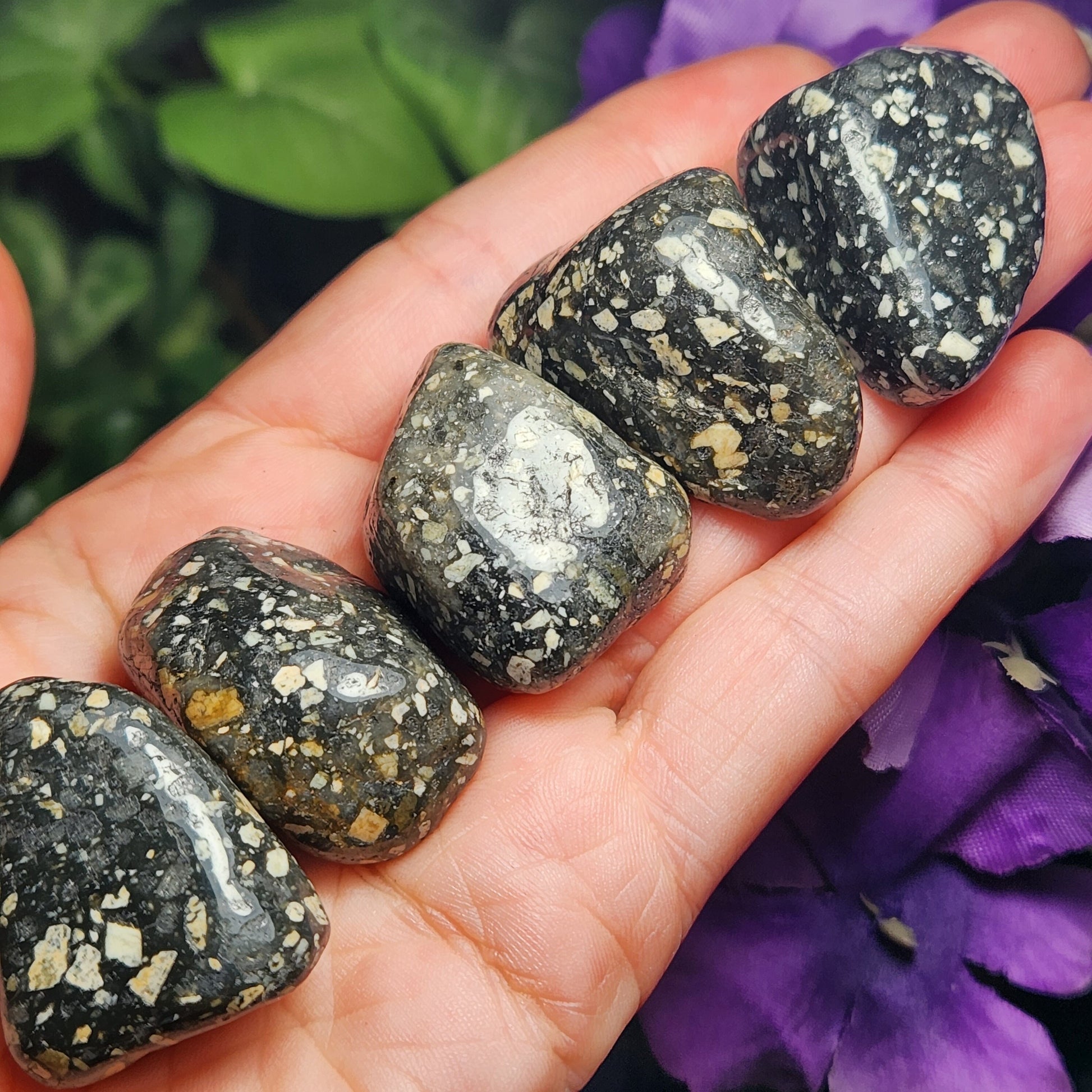 These Black Leopard Jasper crystals from the Congo have been tumbled to a smooth polish. They exhibit the black and white speckled pattern that this material is known for. Each specimen measures approximately 1 inch in size.