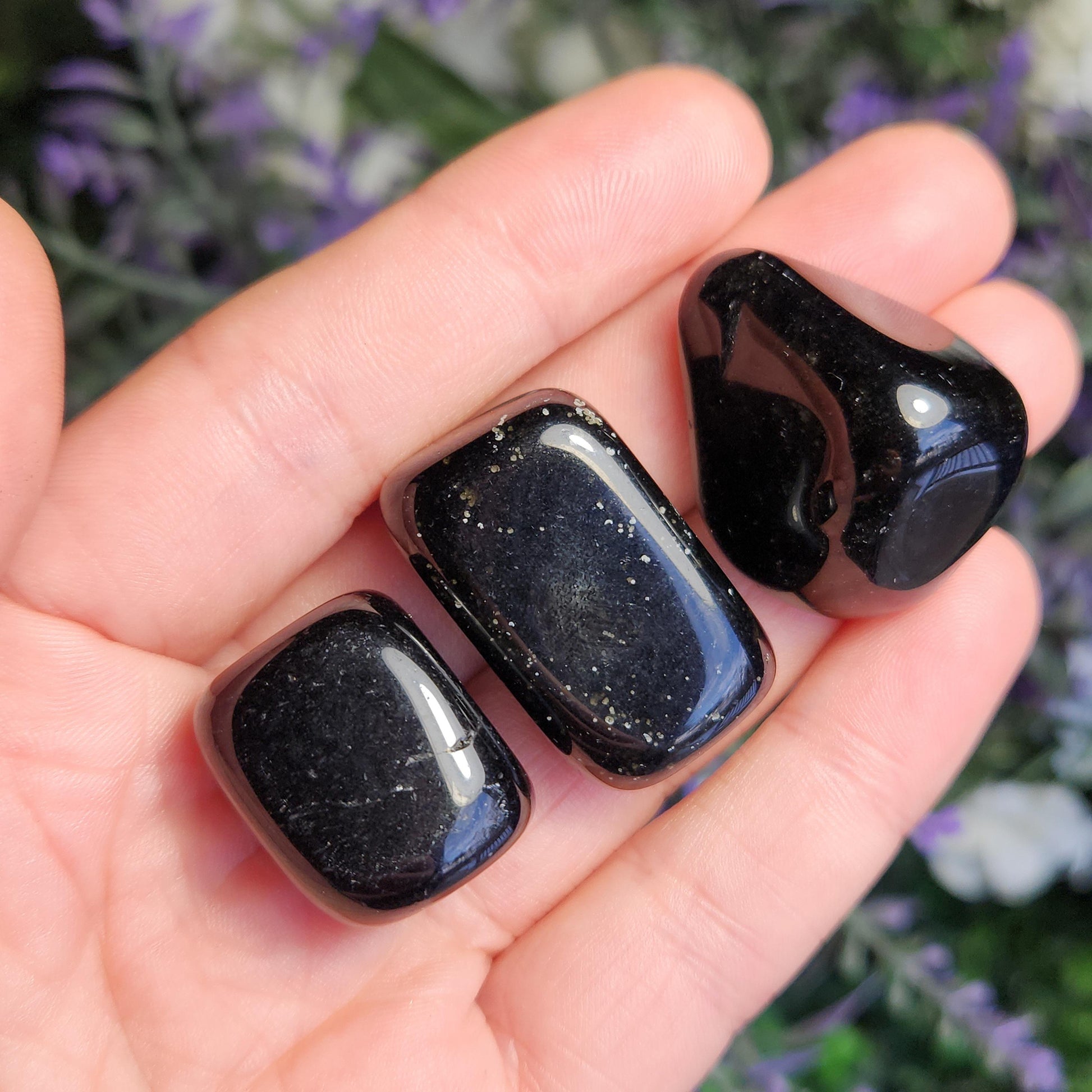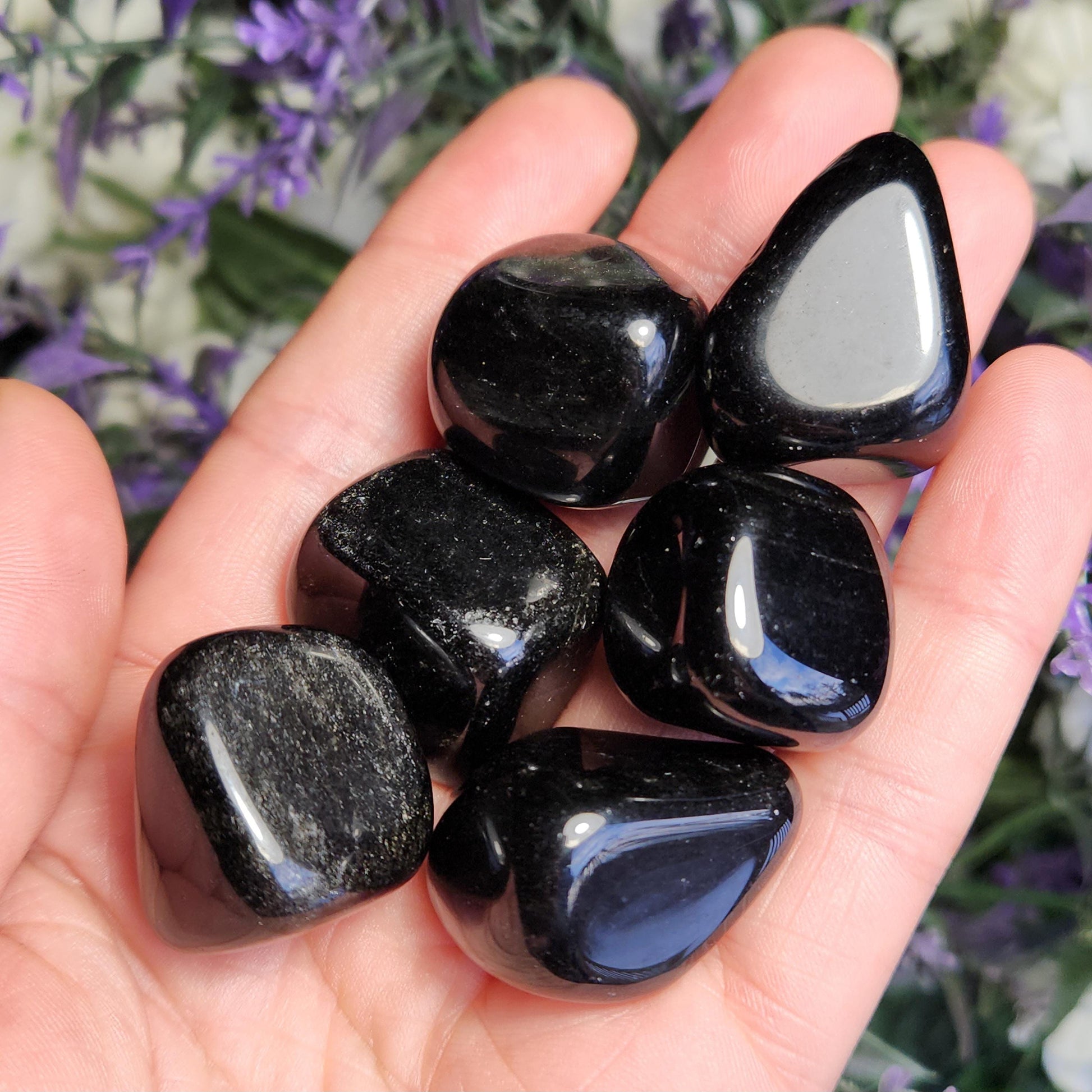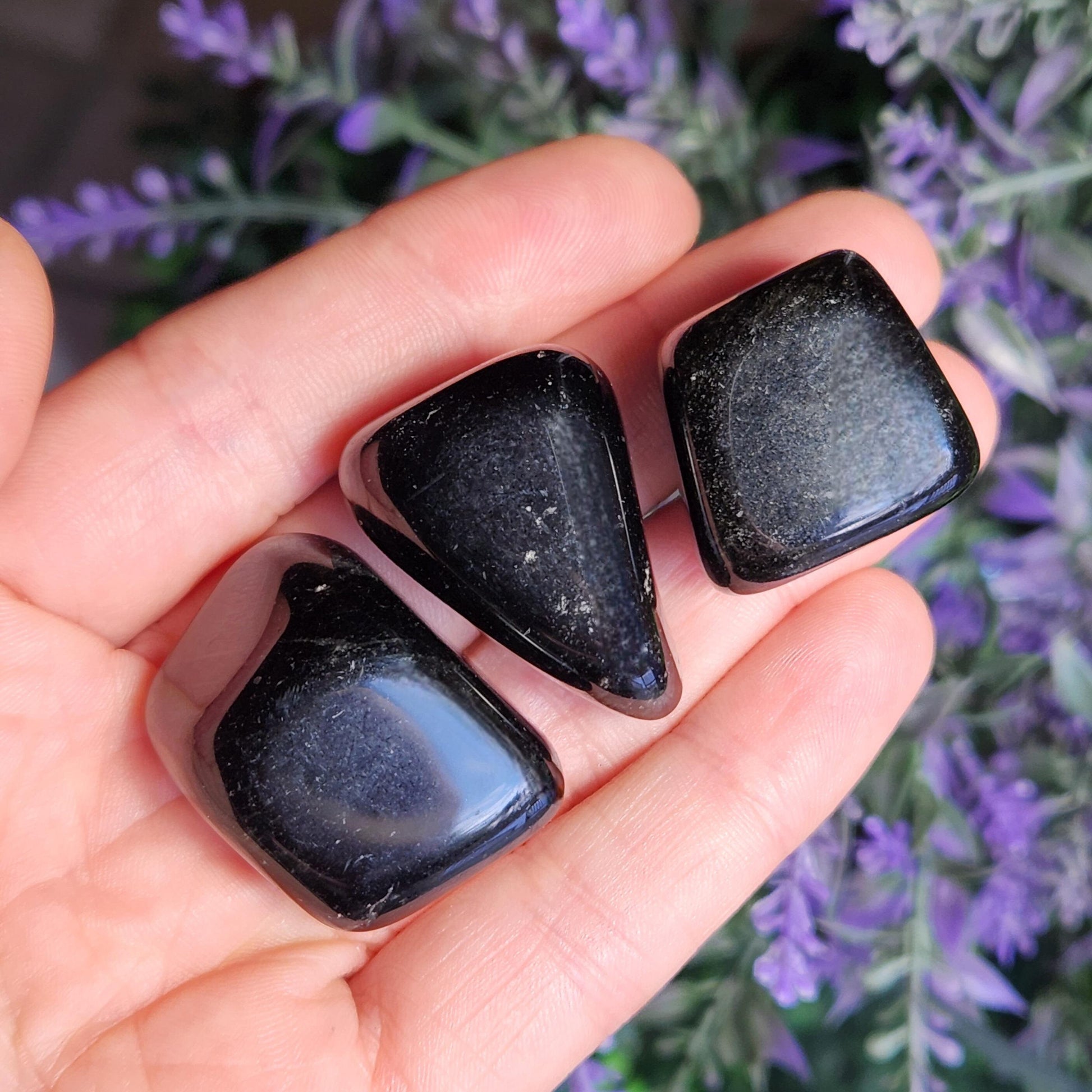 These Black Obsidian stones have been tumbled to a high polish and may exhibit small wispy inclusions or natural sheens. Each specimen measures between .75 inches and 1 inch.
