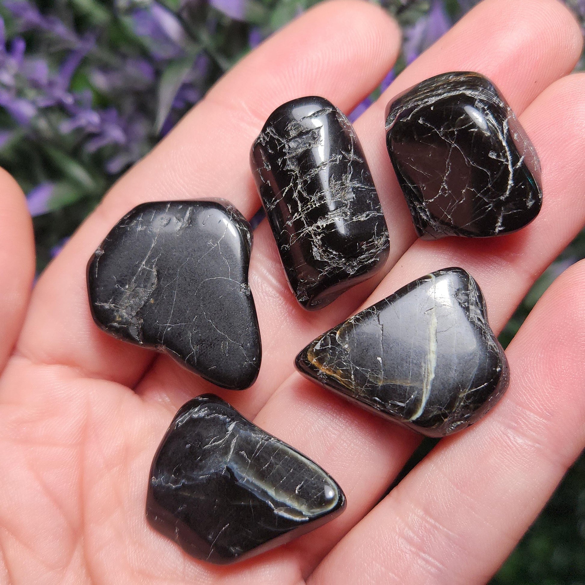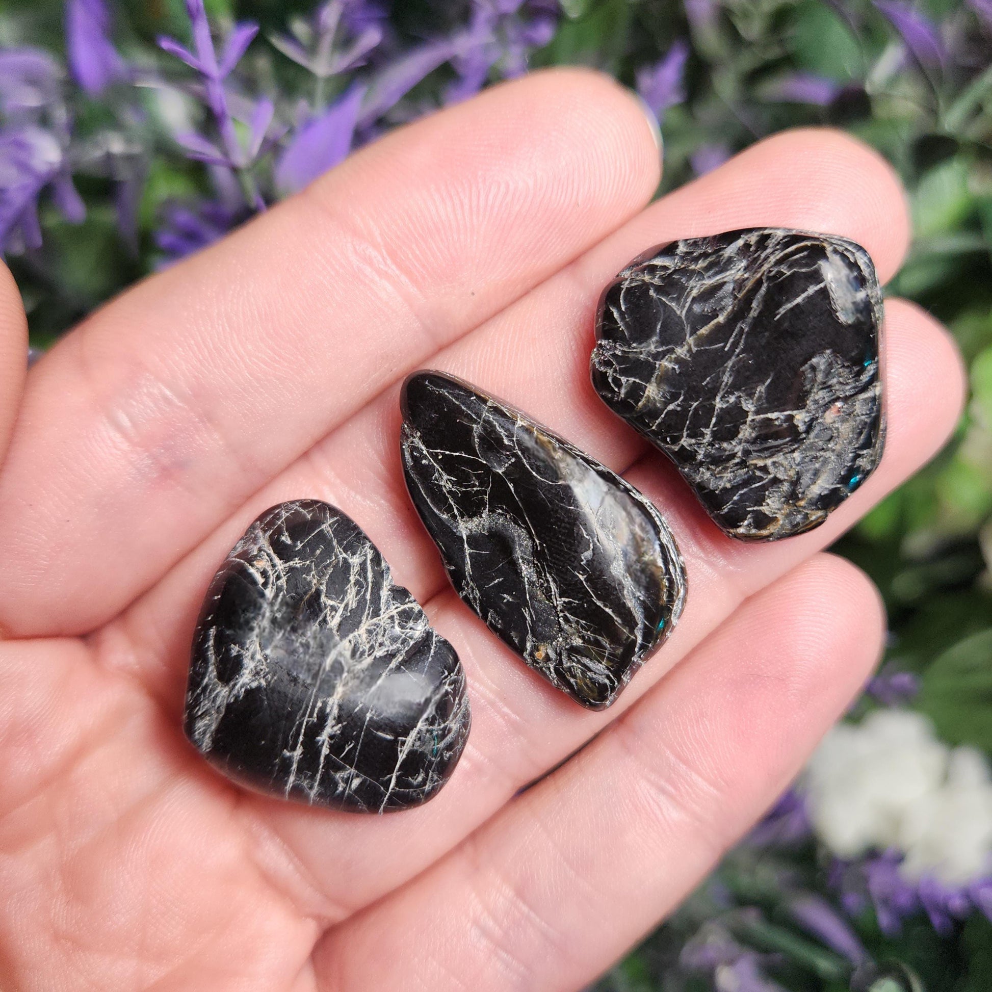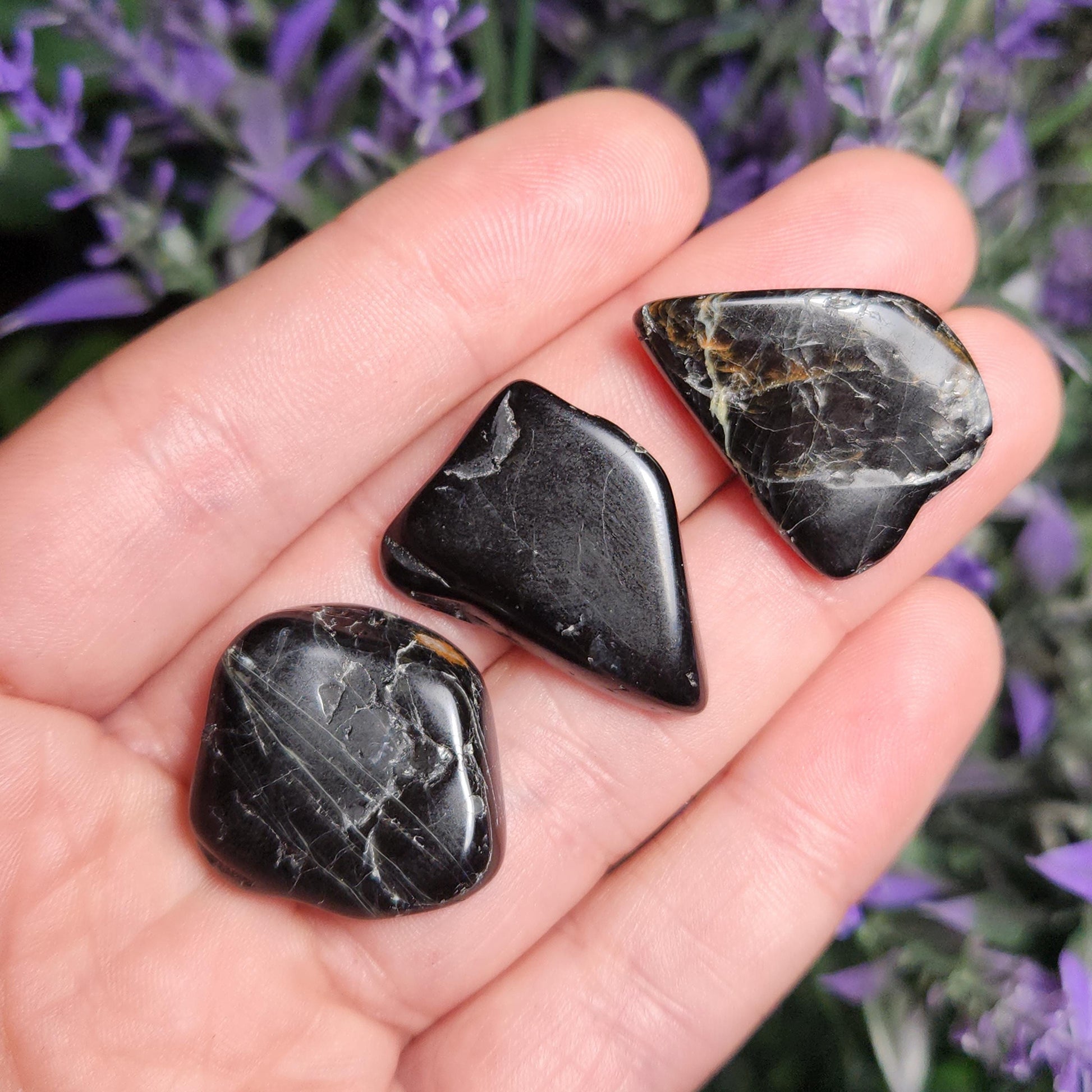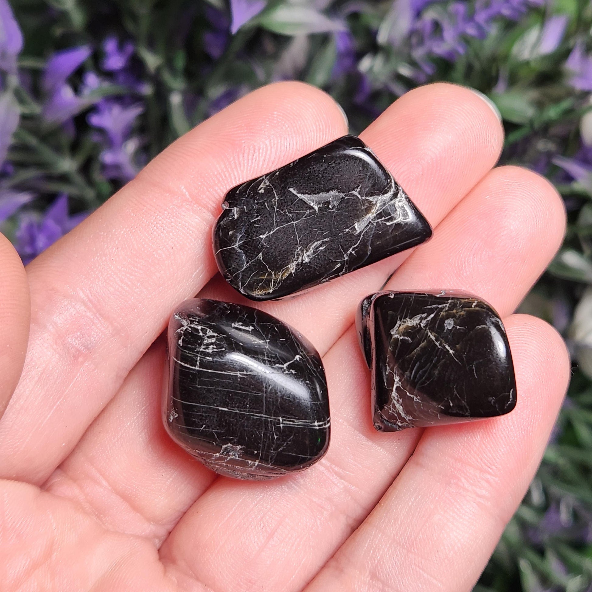 These Black Tourmaline stones from Brazil have freeform shapes and have been tumbled to a polish with possible abrasions or divots on their otherwise smooth surface. These stones exhibit a deep black coloring with visible growth lines. Each specimen measures .75 inches and up.