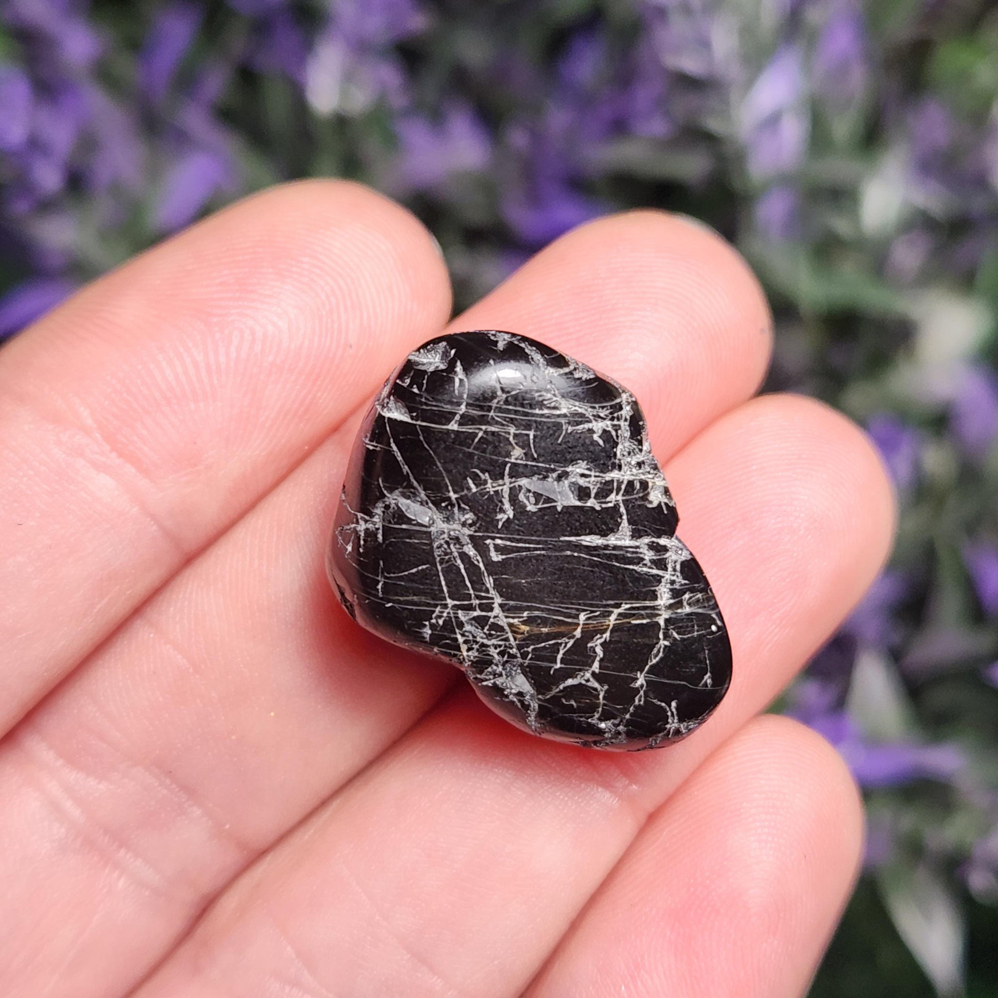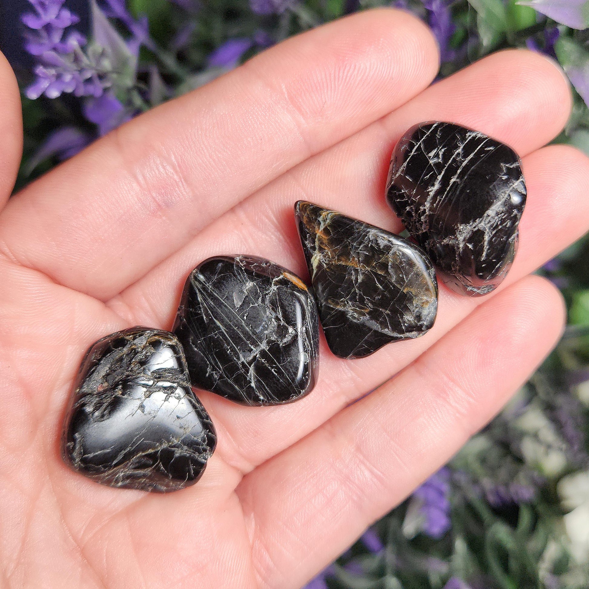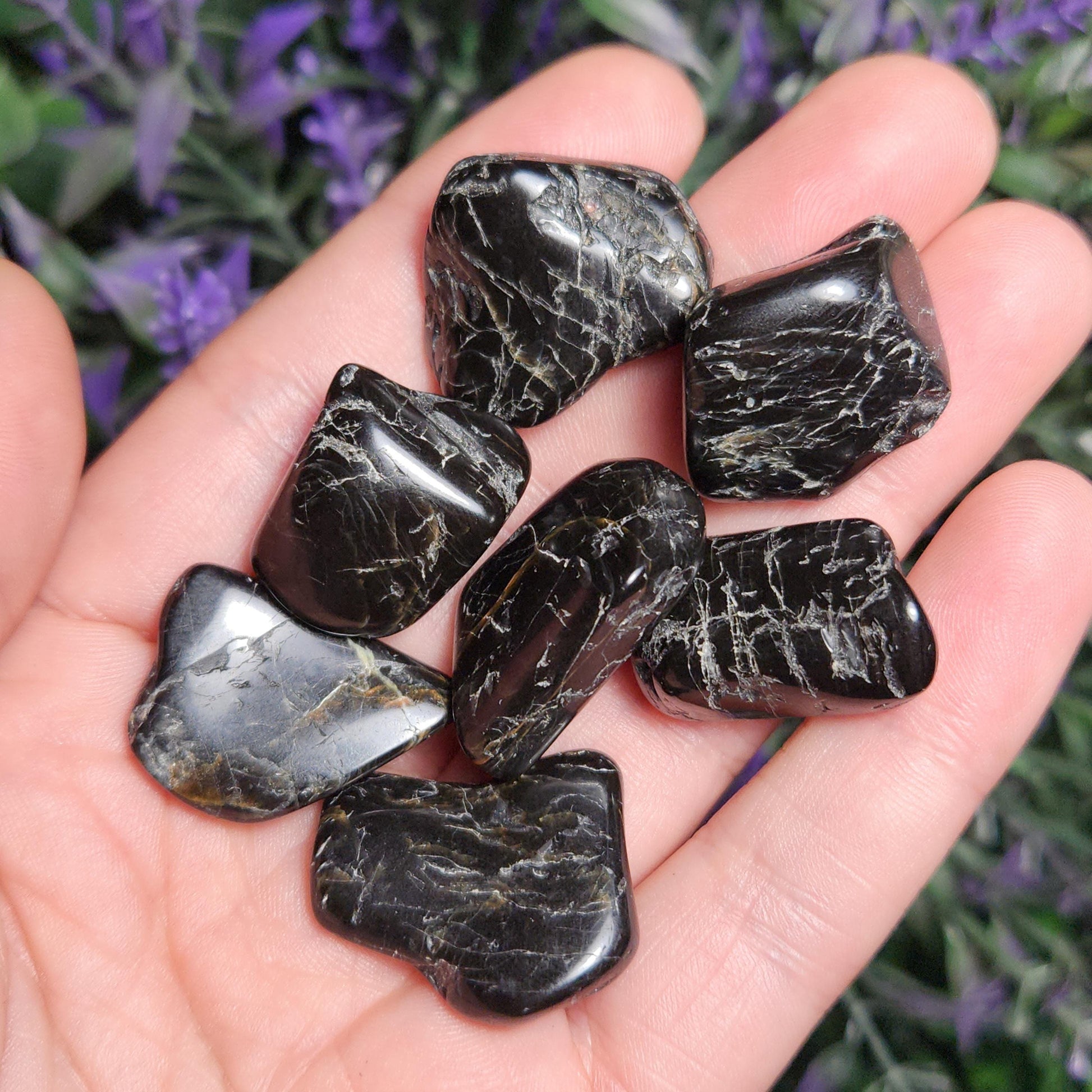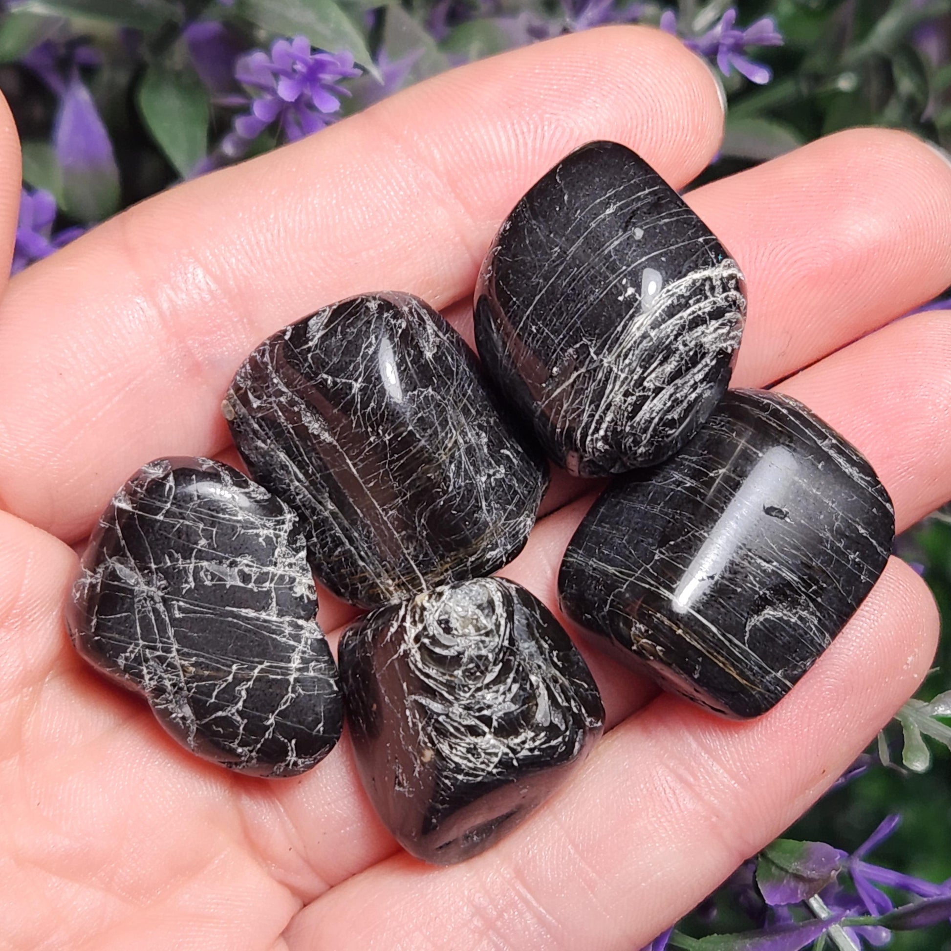 These Black Tourmaline stones from Brazil have freeform shapes and have been tumbled to a polish with possible abrasions or divots on their otherwise smooth surface. These stones exhibit a deep black coloring with visible growth lines. Each specimen measures .75 inches and up.