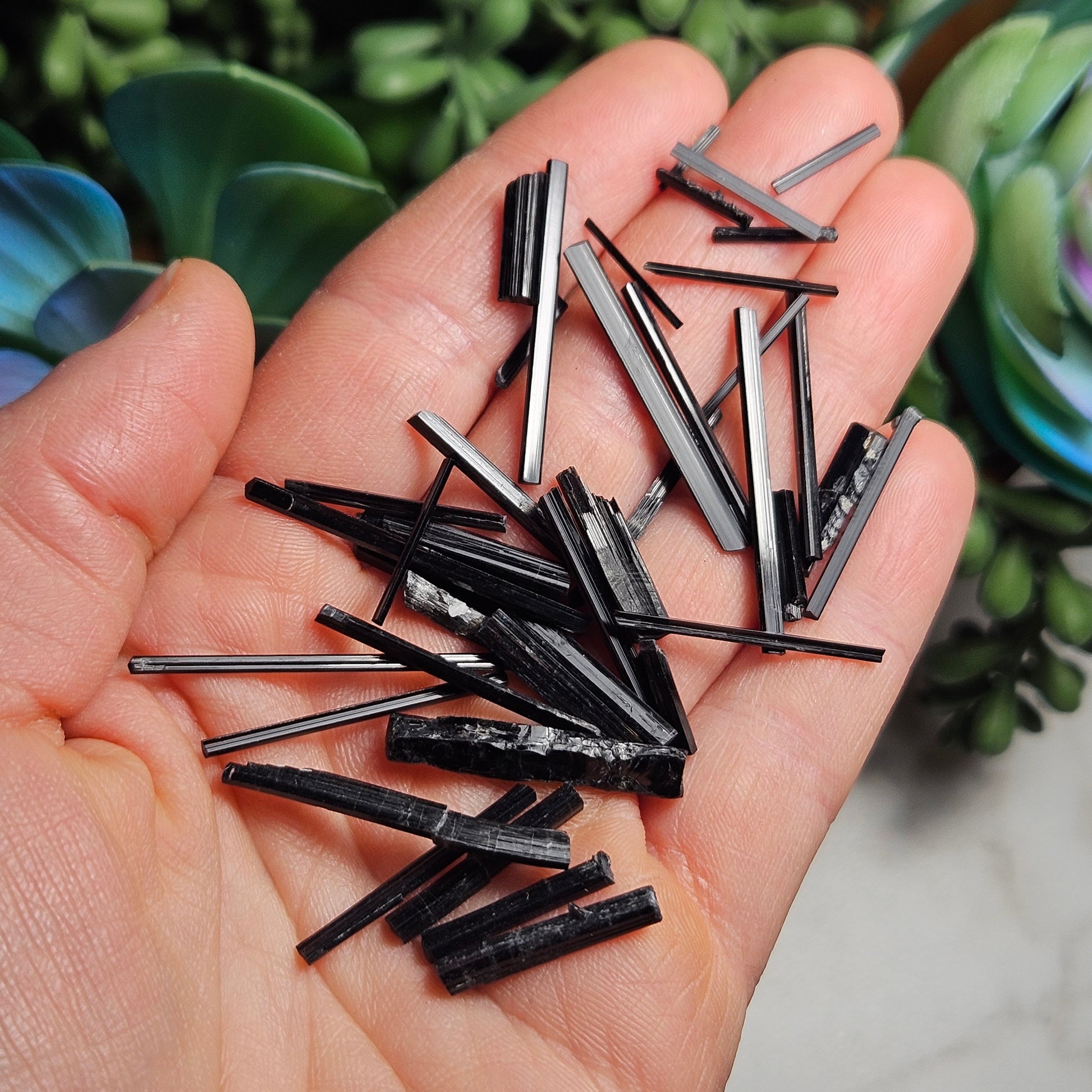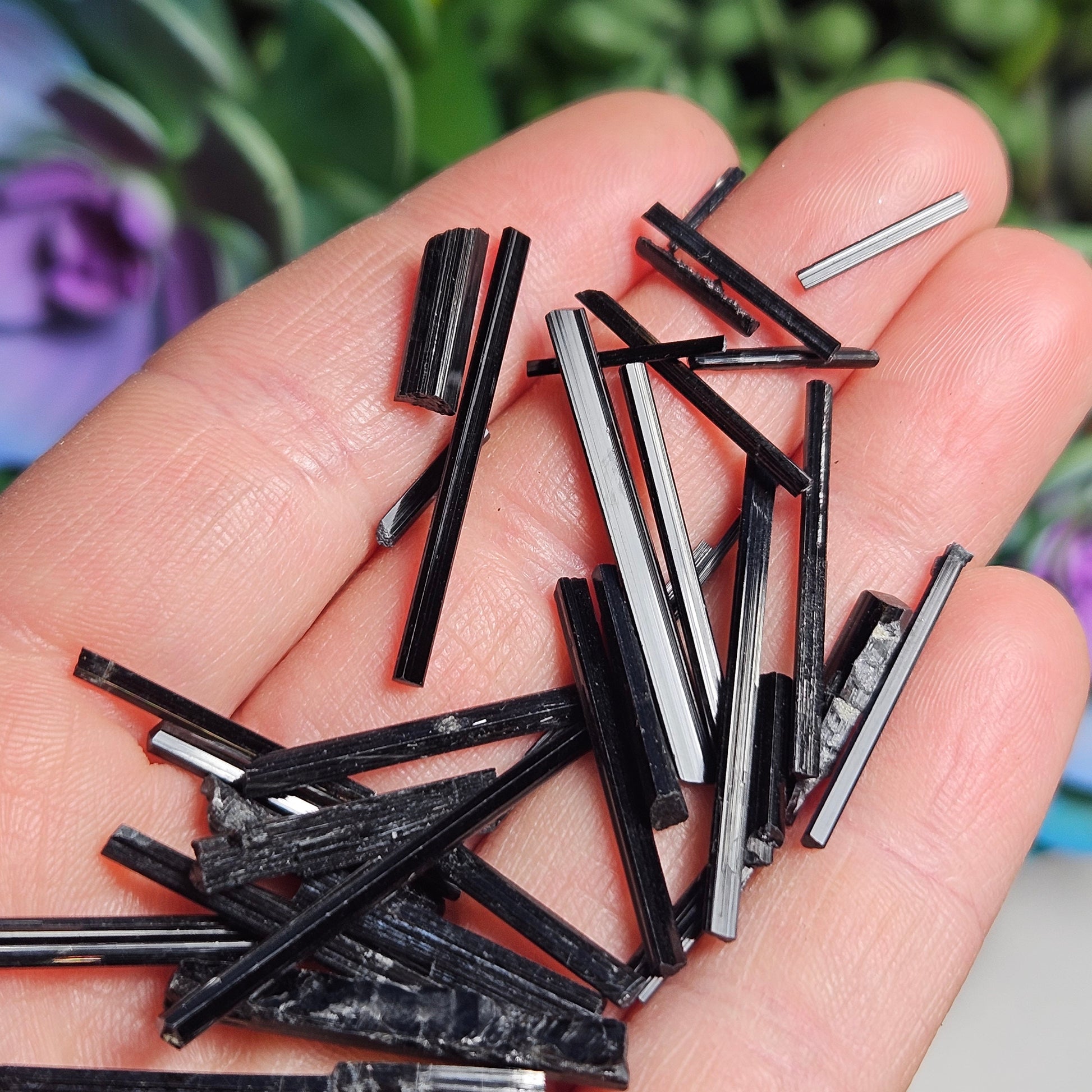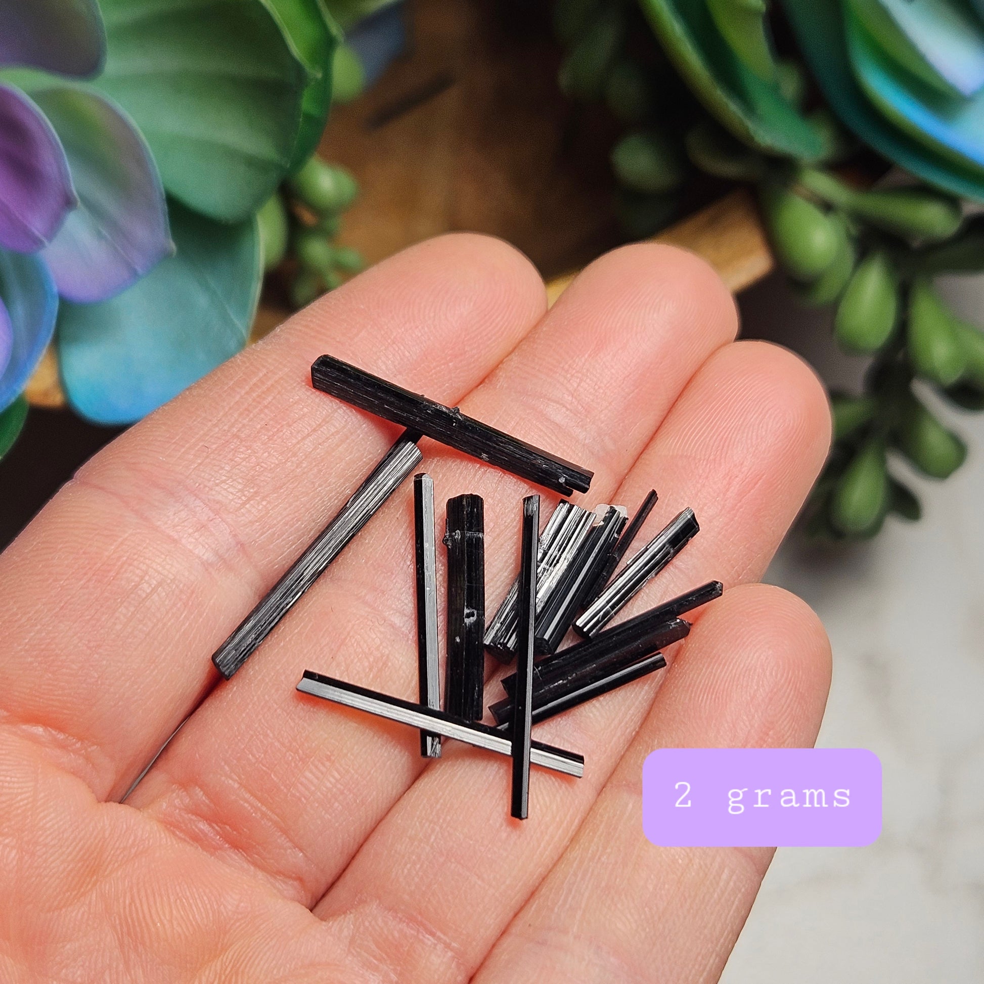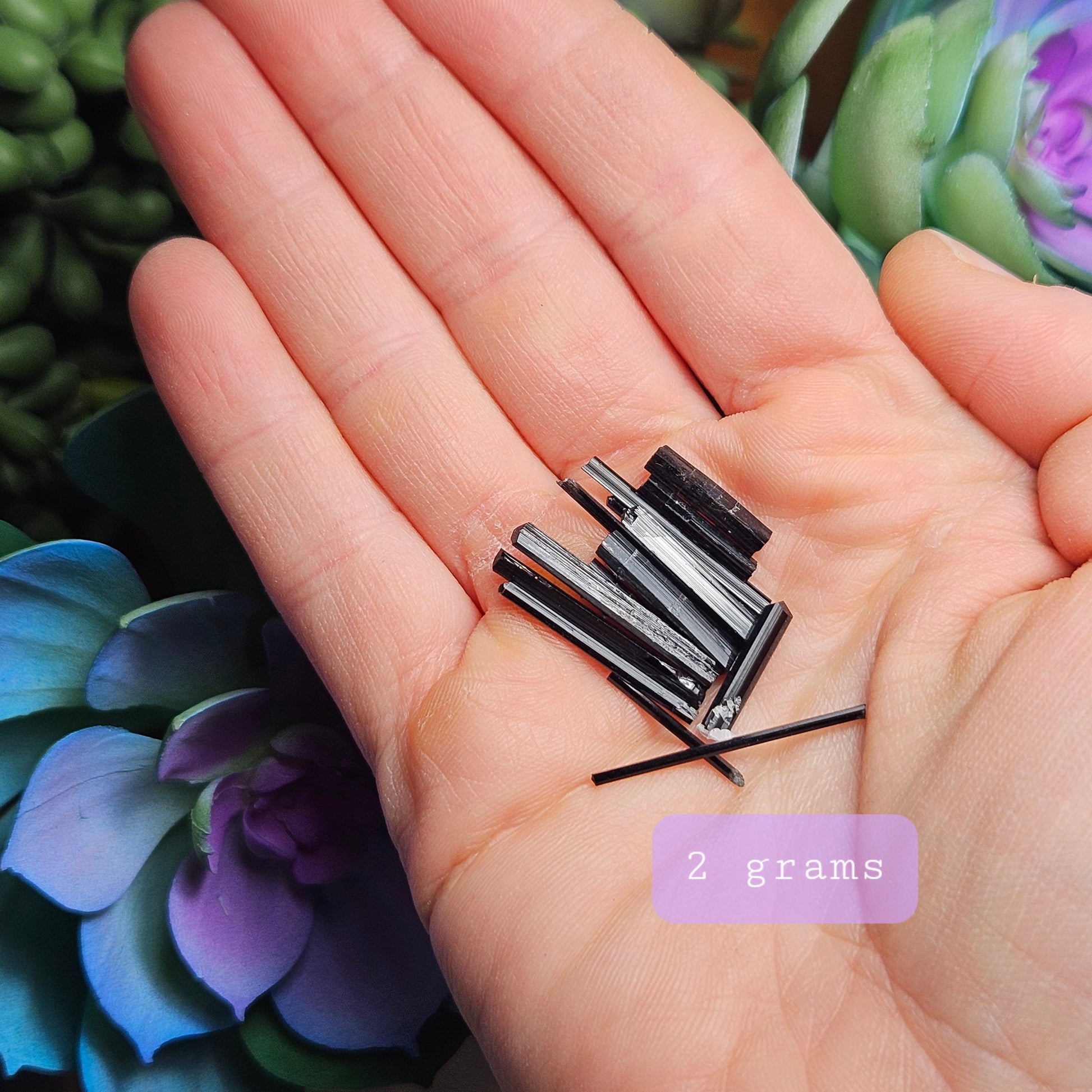 These Black Tourmaline "needle" crystals are from Brazil. They range in size from just a few millimeters to over an inch in size. We offer these in 2 gram bundles, with each bag having a unique variety of sizes and shapes.