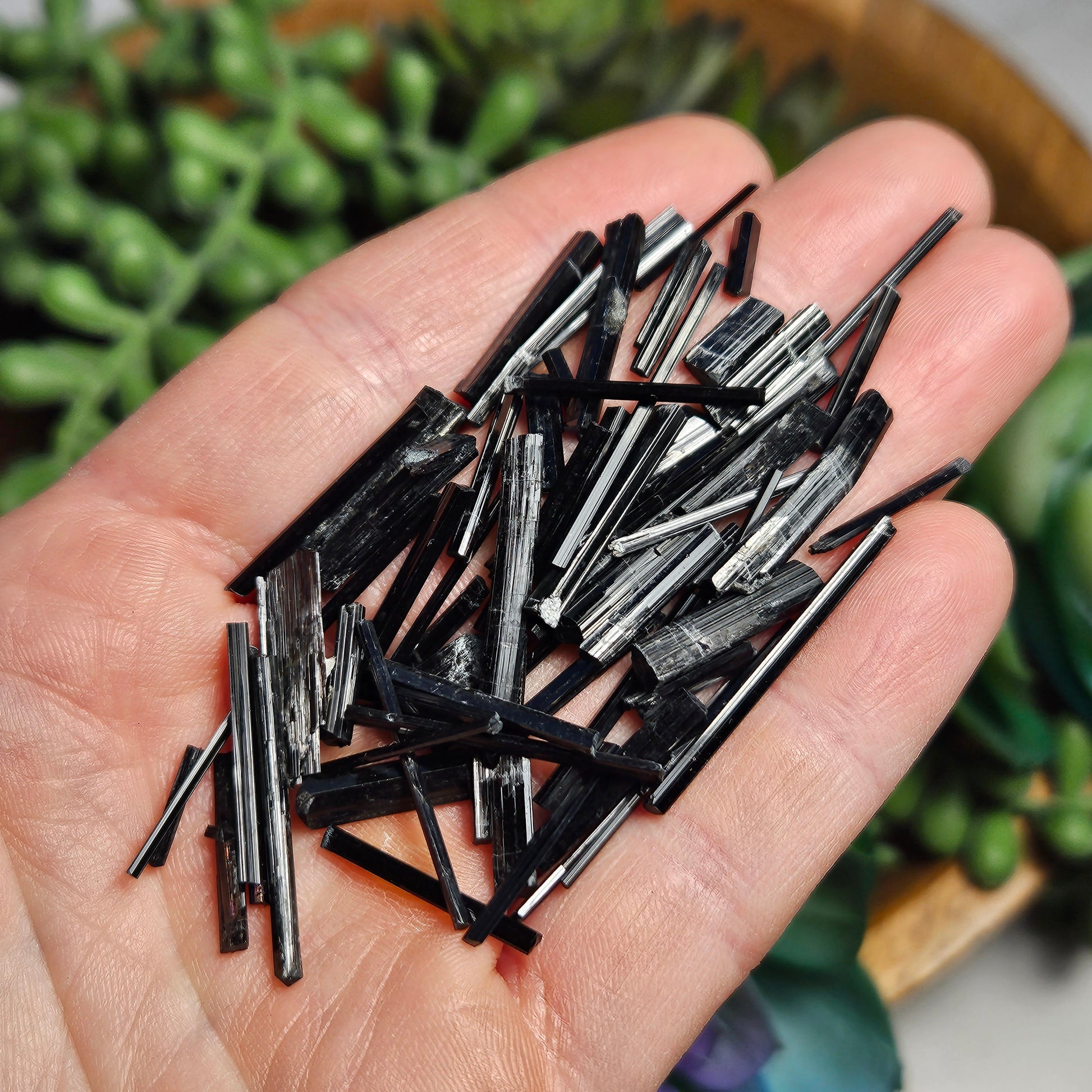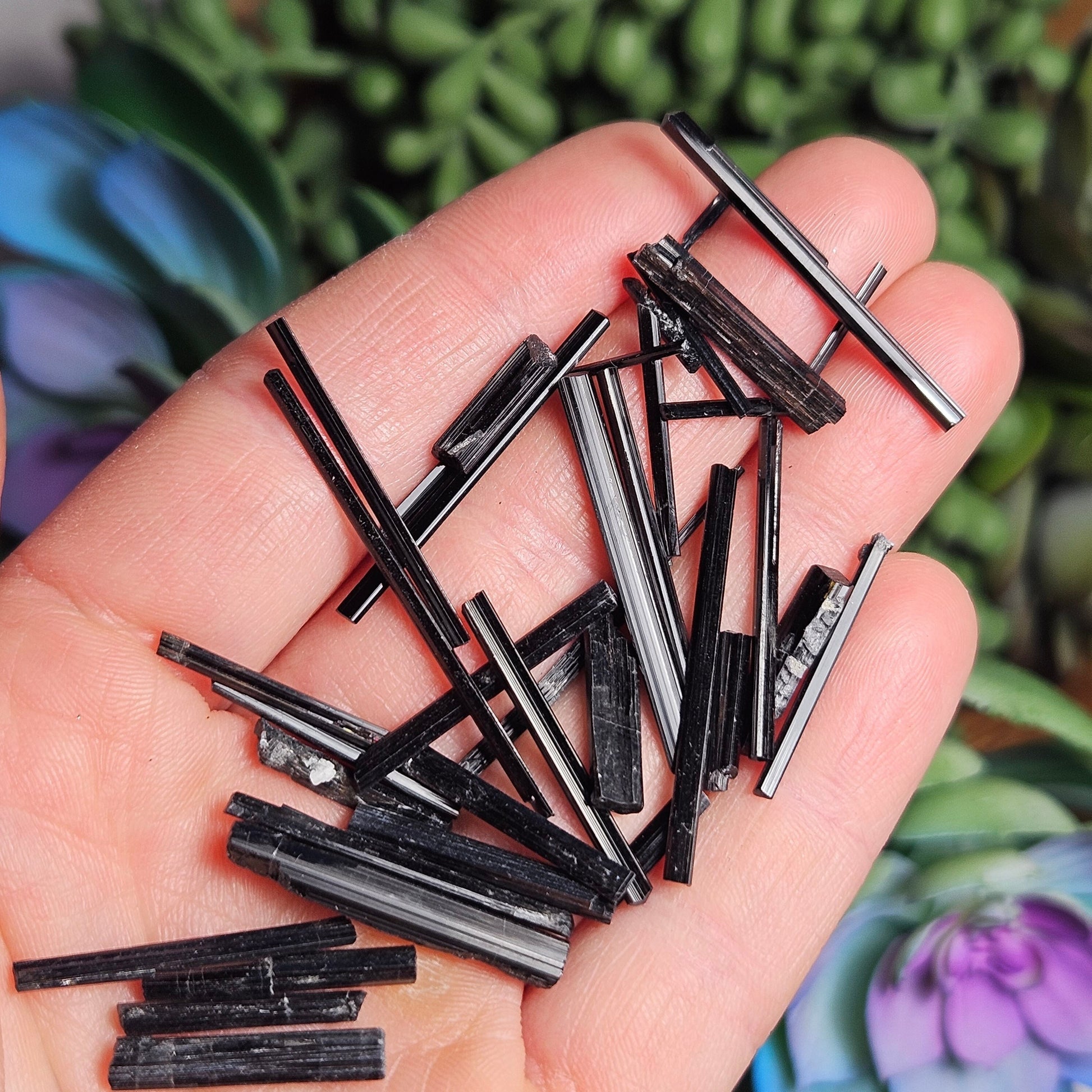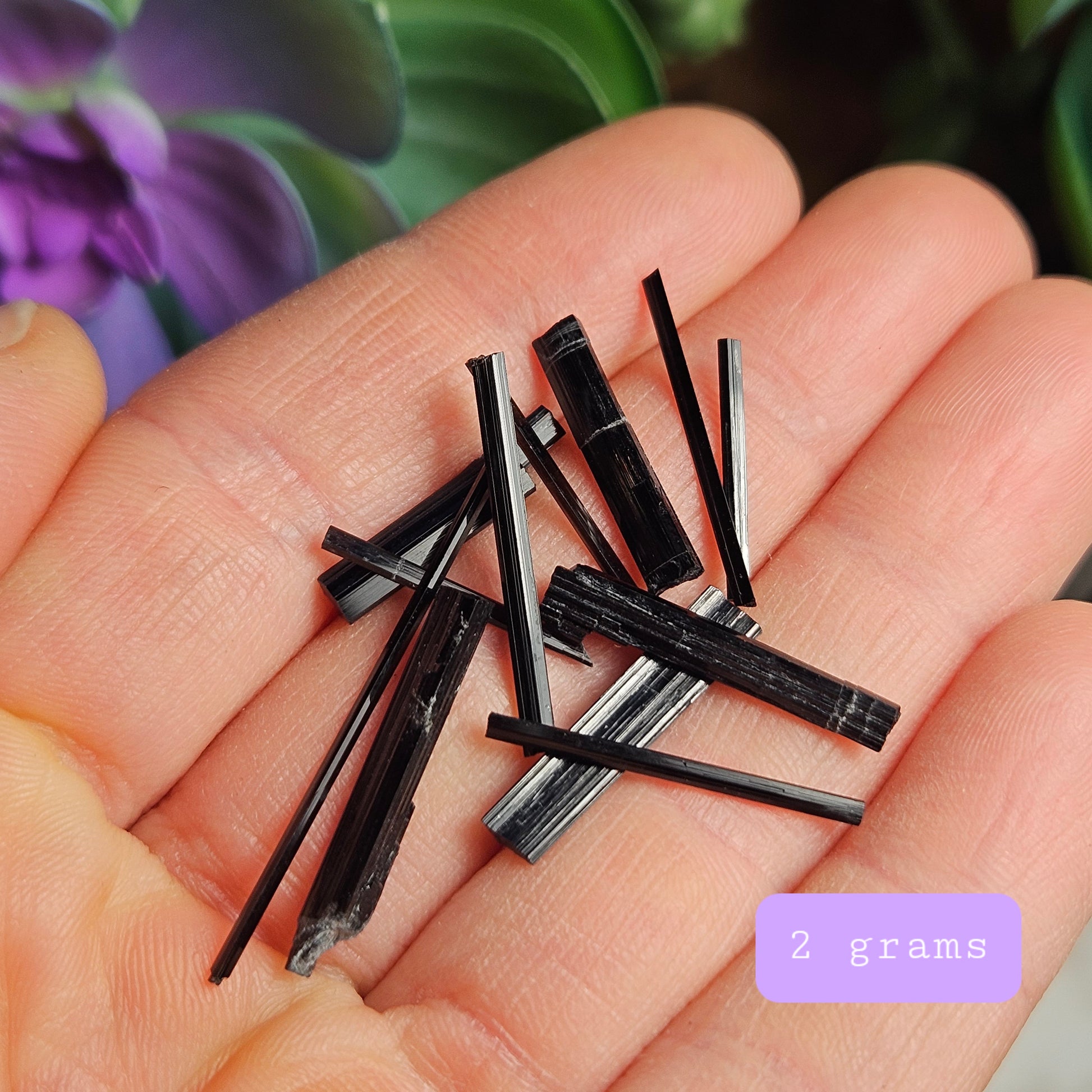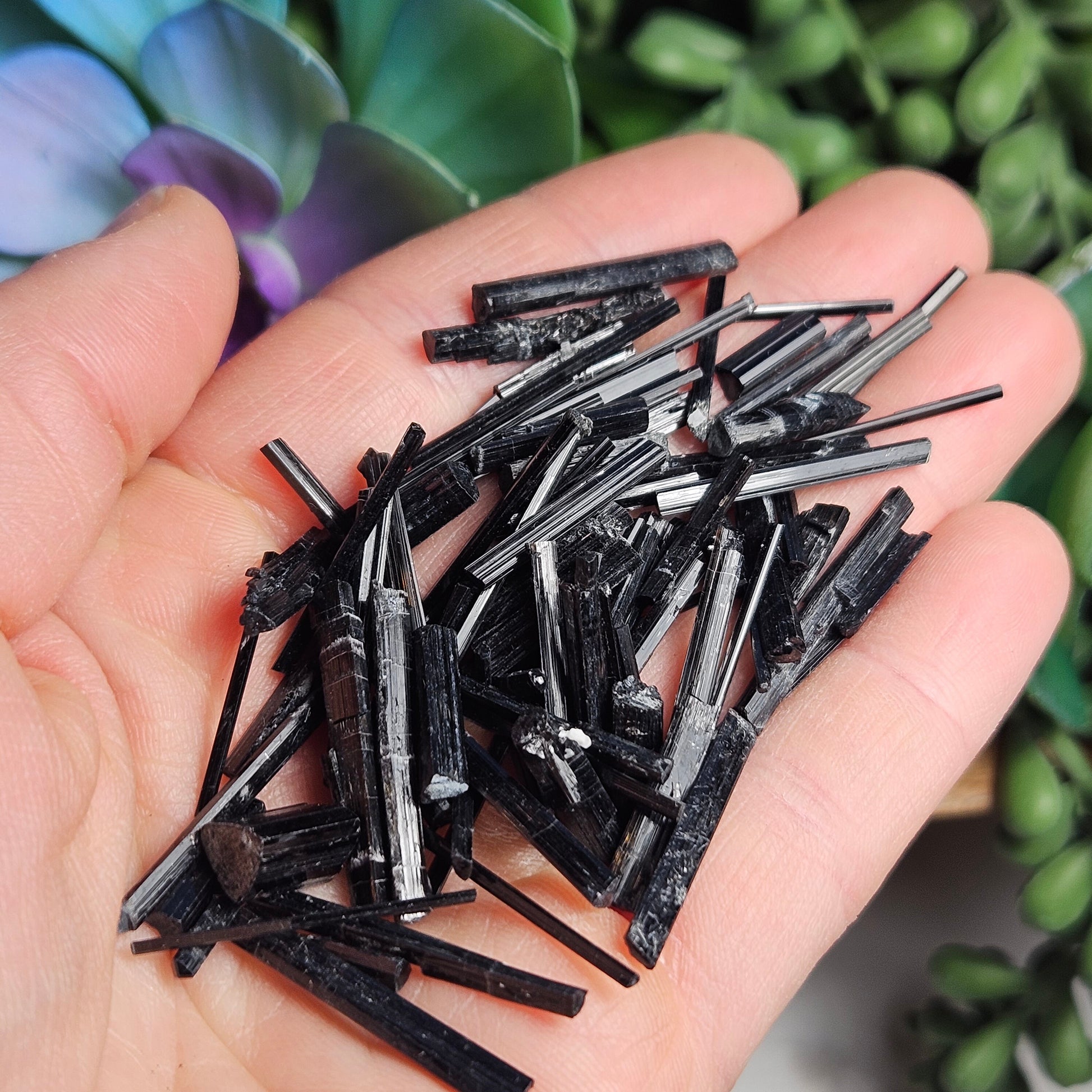 These Black Tourmaline "needle" crystals are from Brazil. They range in size from just a few millimeters to over an inch in size. We offer these in 2 gram bundles, with each bag having a unique variety of sizes and shapes.