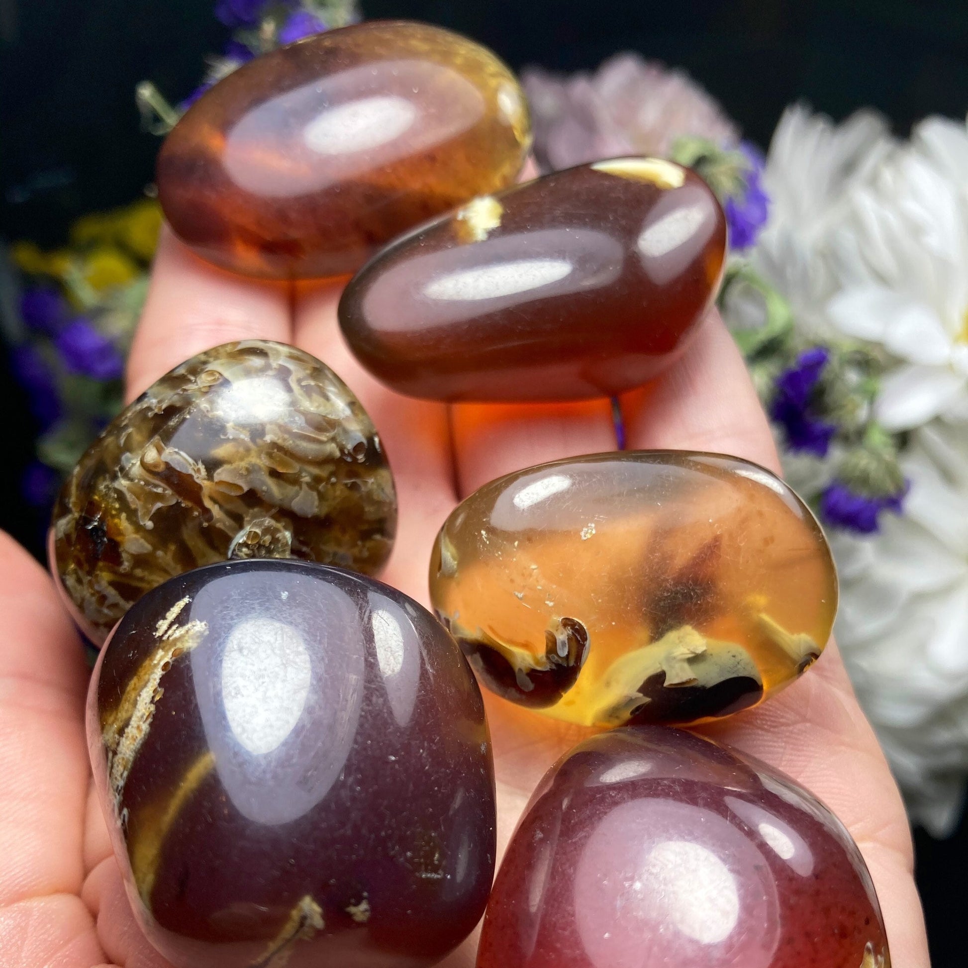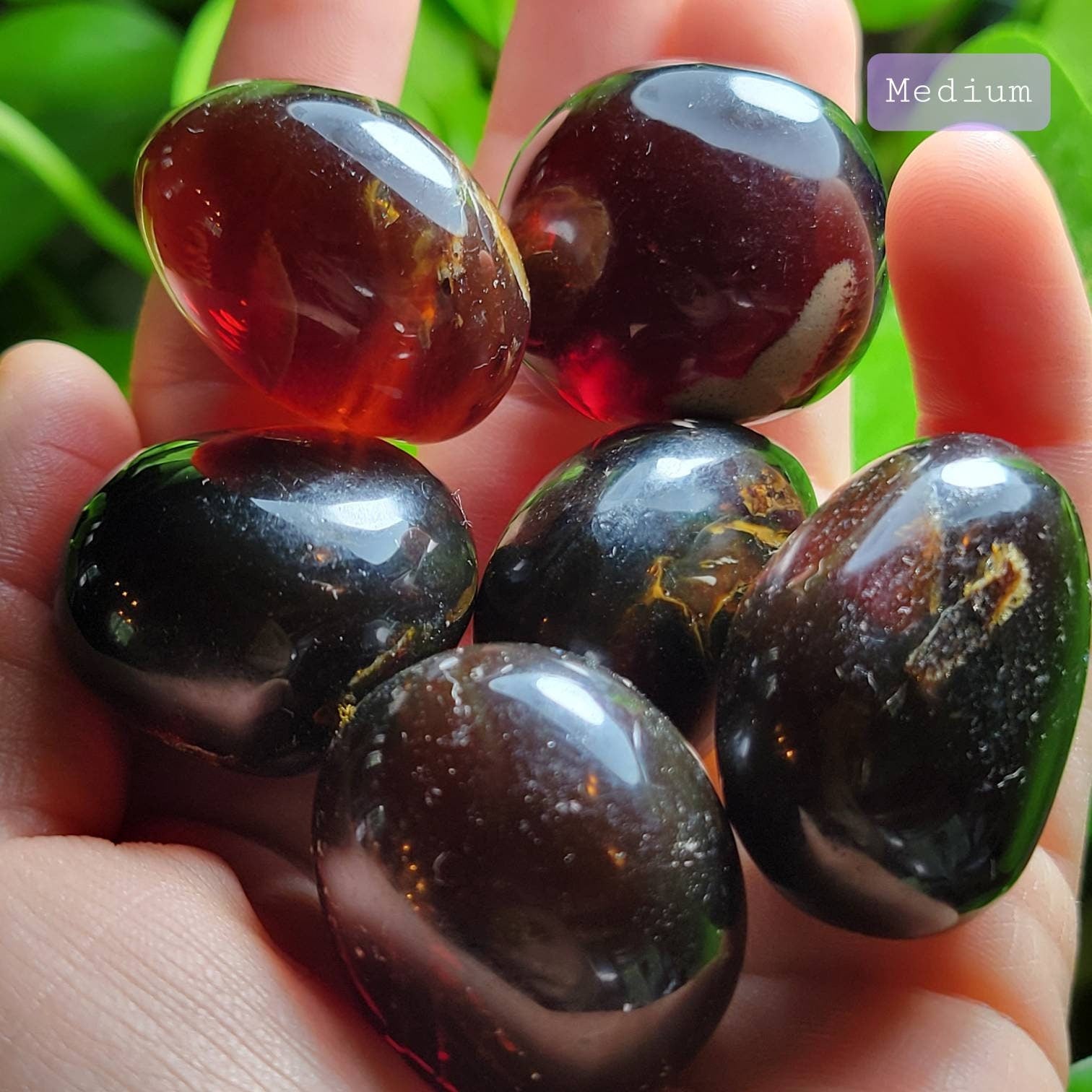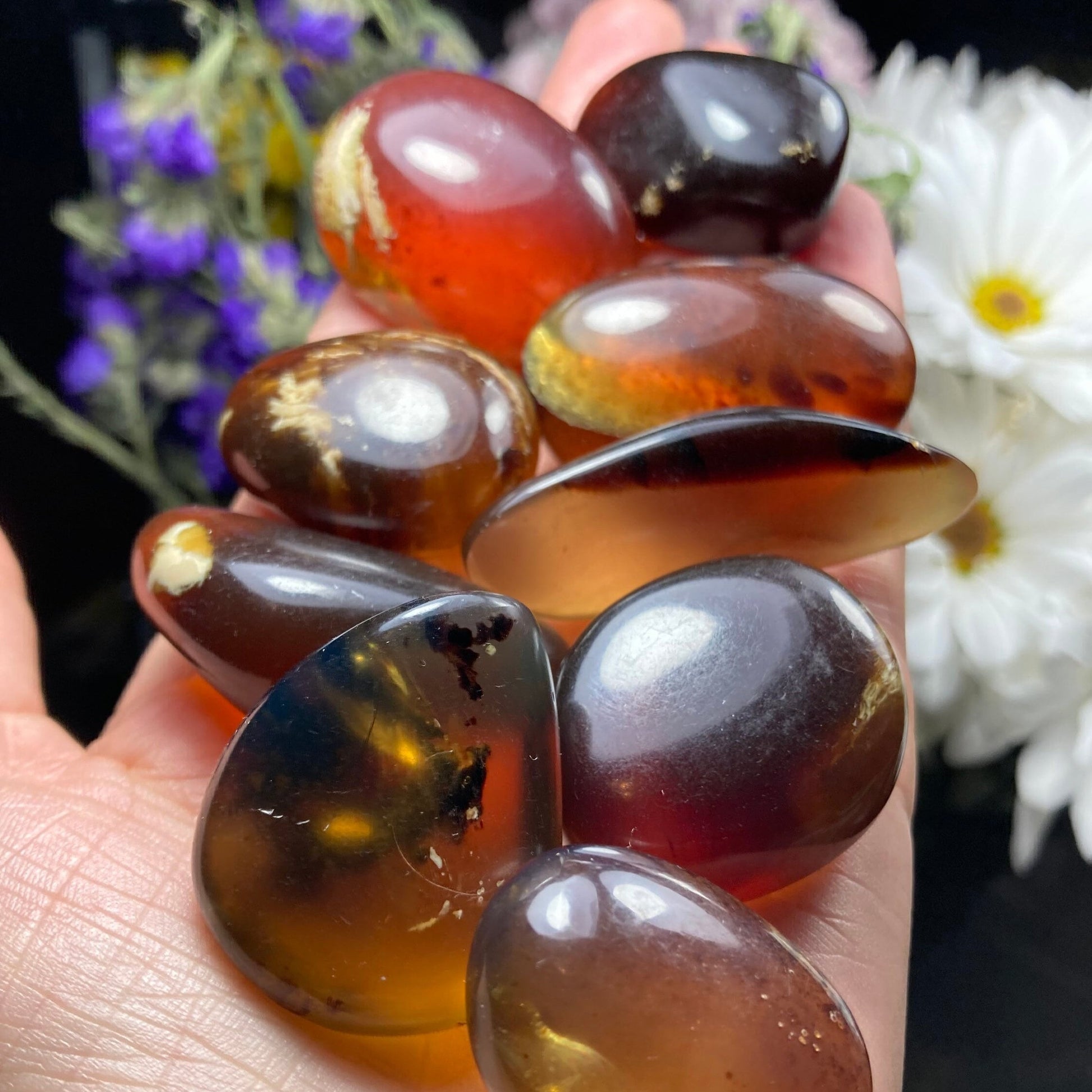 These amazing Blue Amber specimens come from Indonesia and get their name from the blue glow they give off when exposed to UV light. Each piece is hand curated and examined for quality. These come in a variety of shapes and colors, ranging from golden yellow to dark orange. Many of these specimens have translucence and some have a darker, more dense appearance. Each polished piece has its own unique look and contains inclusions of natural organic matter.