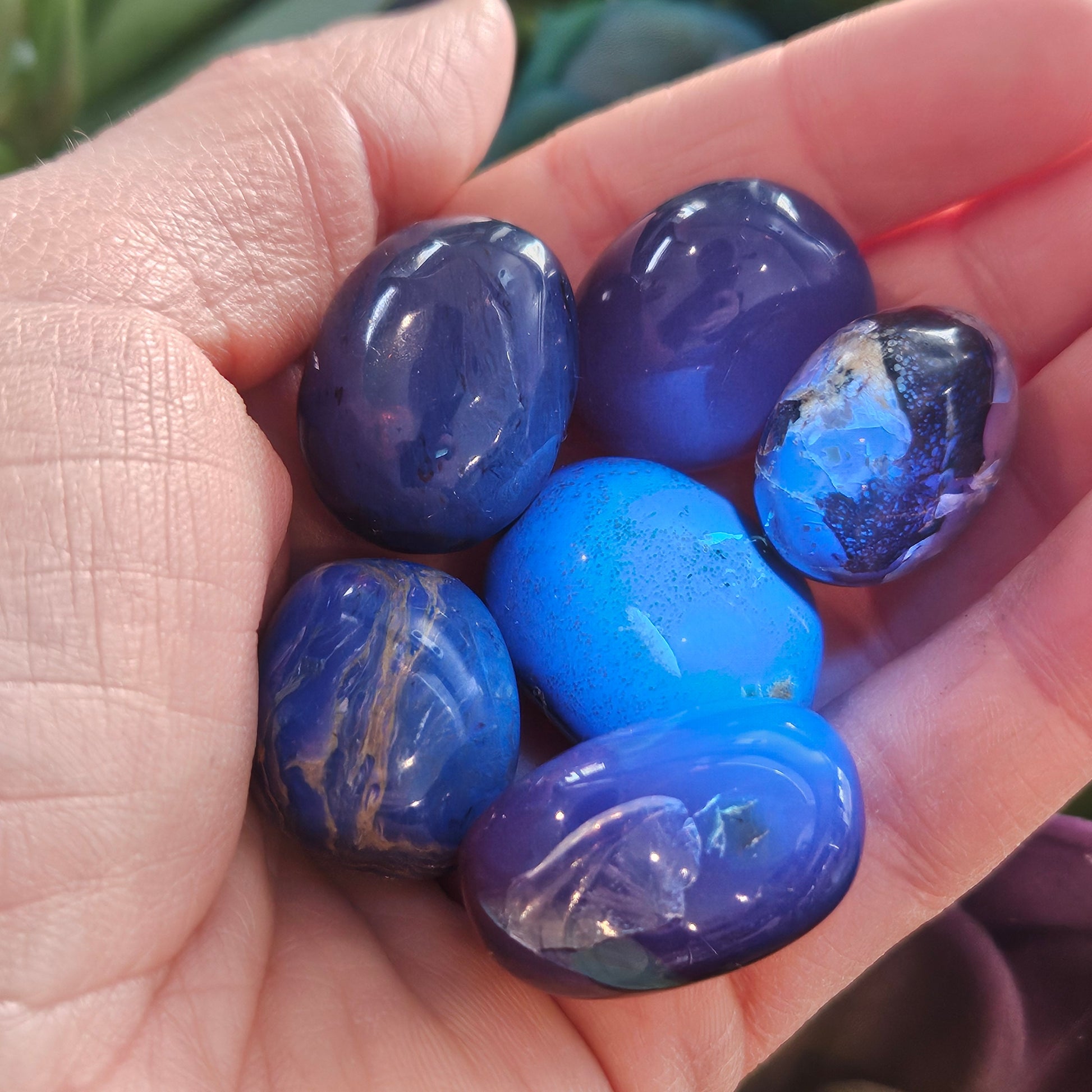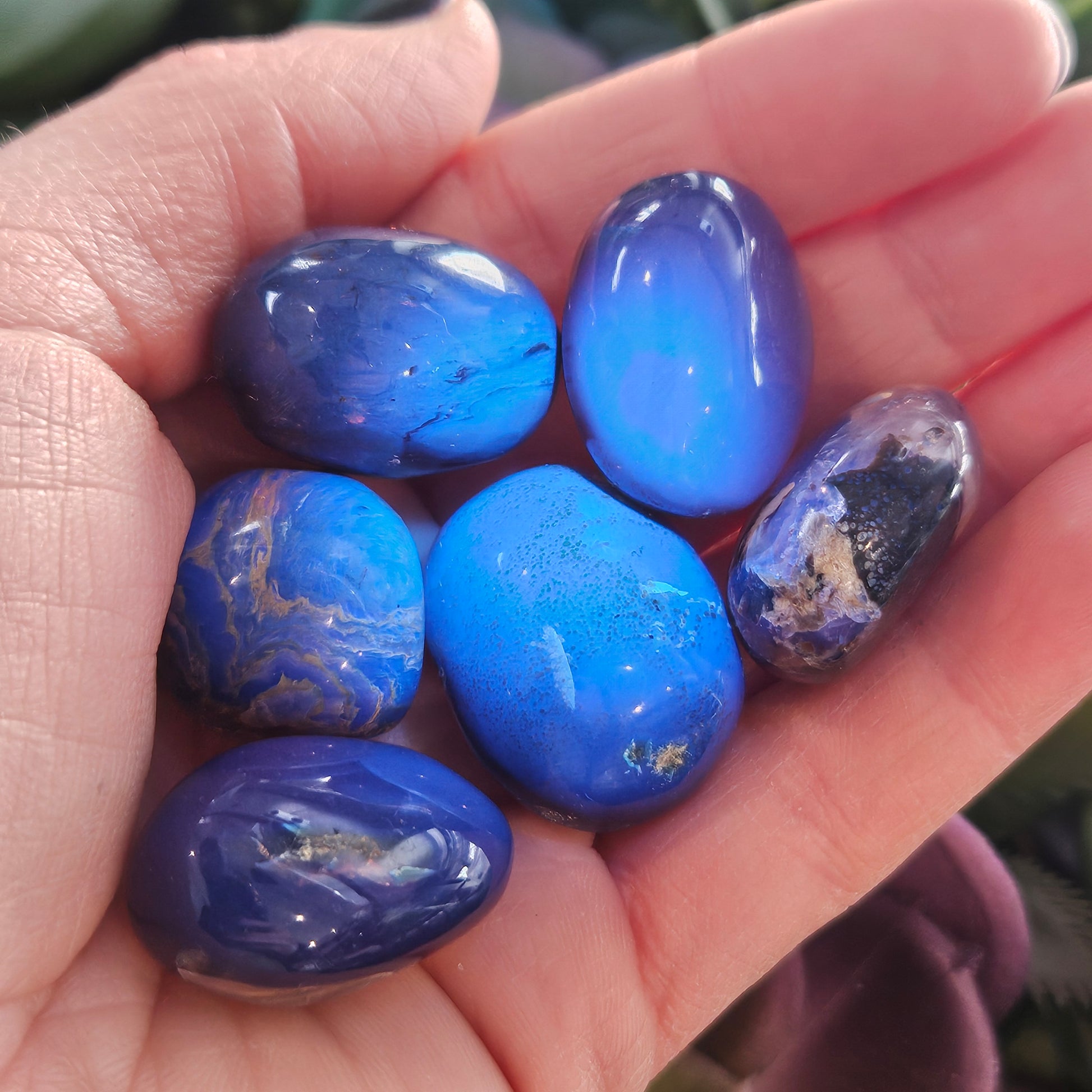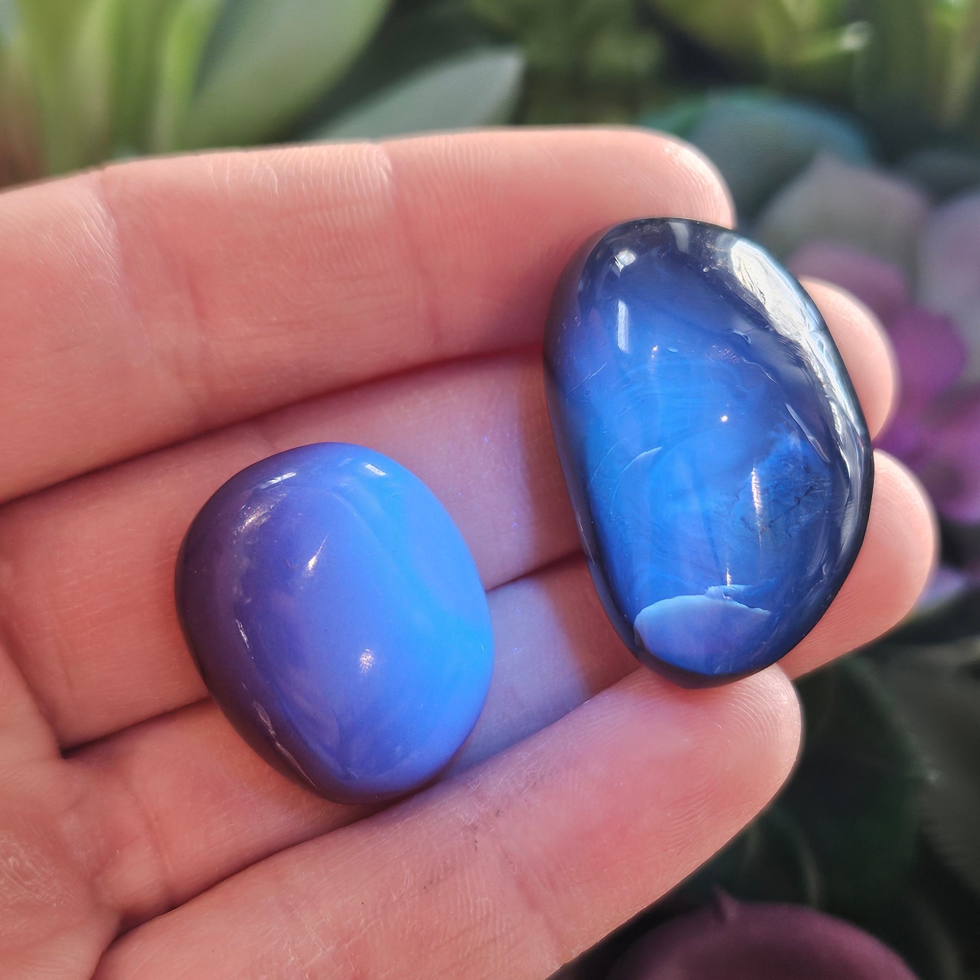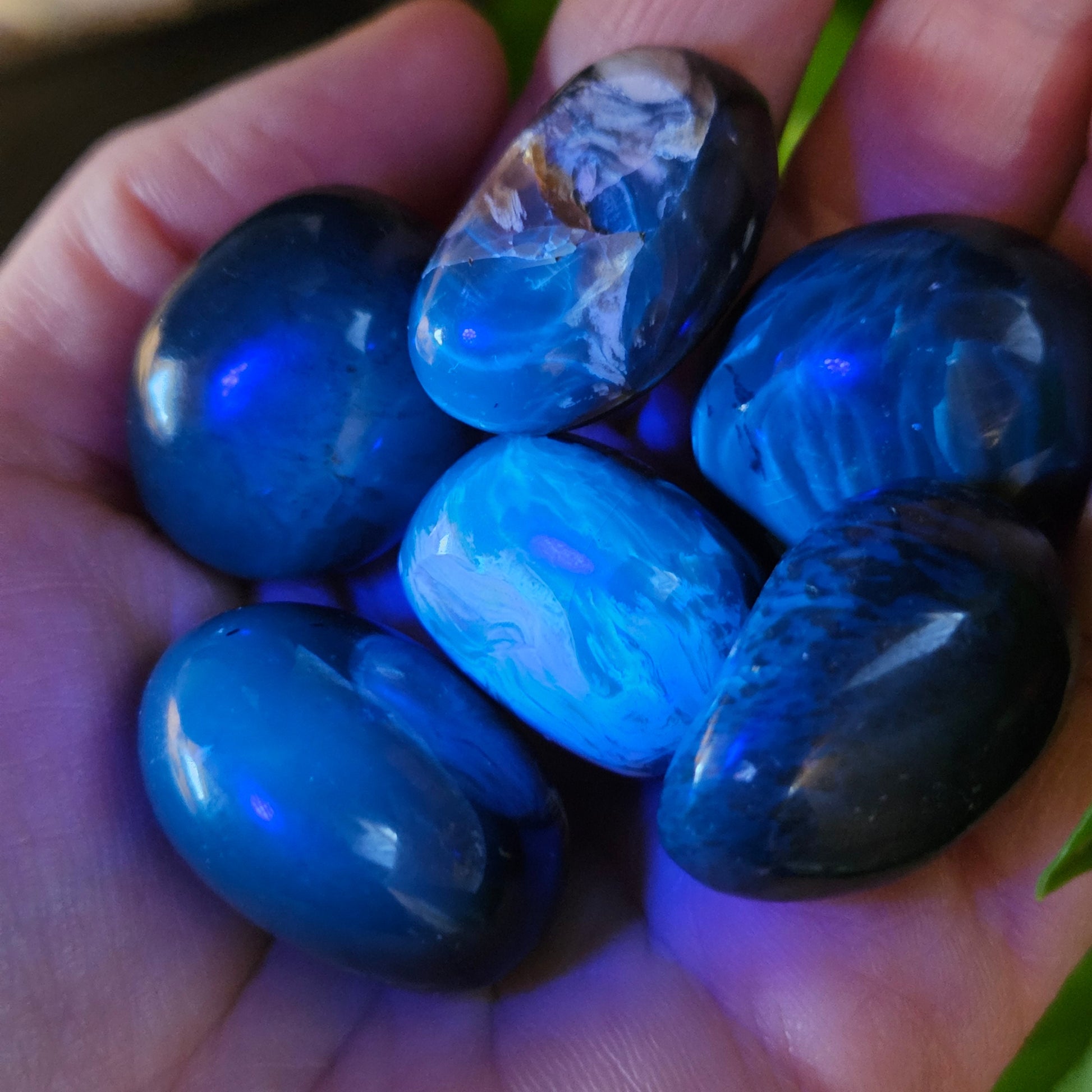 These amazing Blue Amber specimens come from Indonesia and get their name from the blue glow they give off when exposed to UV light. Each piece is hand curated and examined for quality. These come in a variety of shapes and colors, ranging from golden yellow to dark orange. Many of these specimens have translucence and some have a darker, more dense appearance. Each polished piece has its own unique look and contains inclusions of natural organic matter.