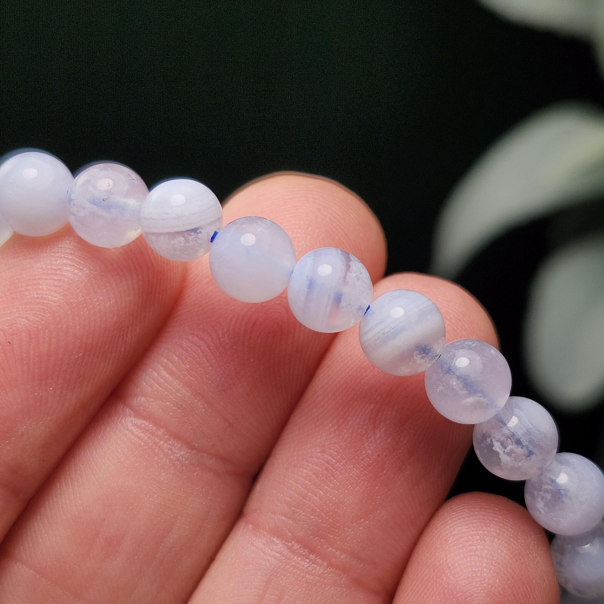These Blue Lace Agate stretch bracelets are created with 6mm beads that have been polished to a high sheen. Each bracelet measures approximately 7 inches.