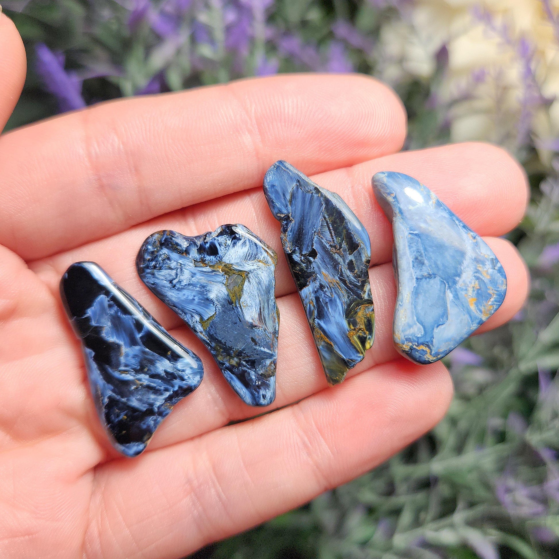 These Pietersite crystals have been tumbled to a high sheen. They exhibit a deep, slate blue coloring with shining chatoyancy and possible golden flecks. Each specimen measures approximately .75 inches and between 2 and 4 grams.