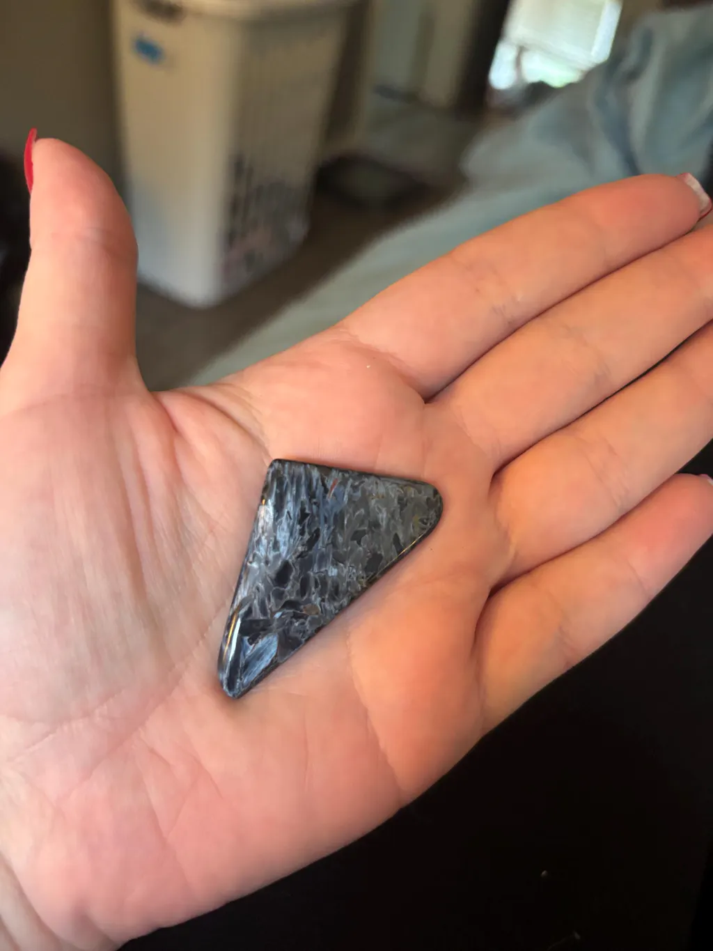 High quality polished Blue Pietersite crystal - #7. Very nice. Matches seller image. Happy with purchase. And was very nice to have a numbered sticker to identify stone on baggie. Thanks also for the gift of the tiny quartz points too. That was very kind. My photo doesn't do it justice, as the photo really needed more light.