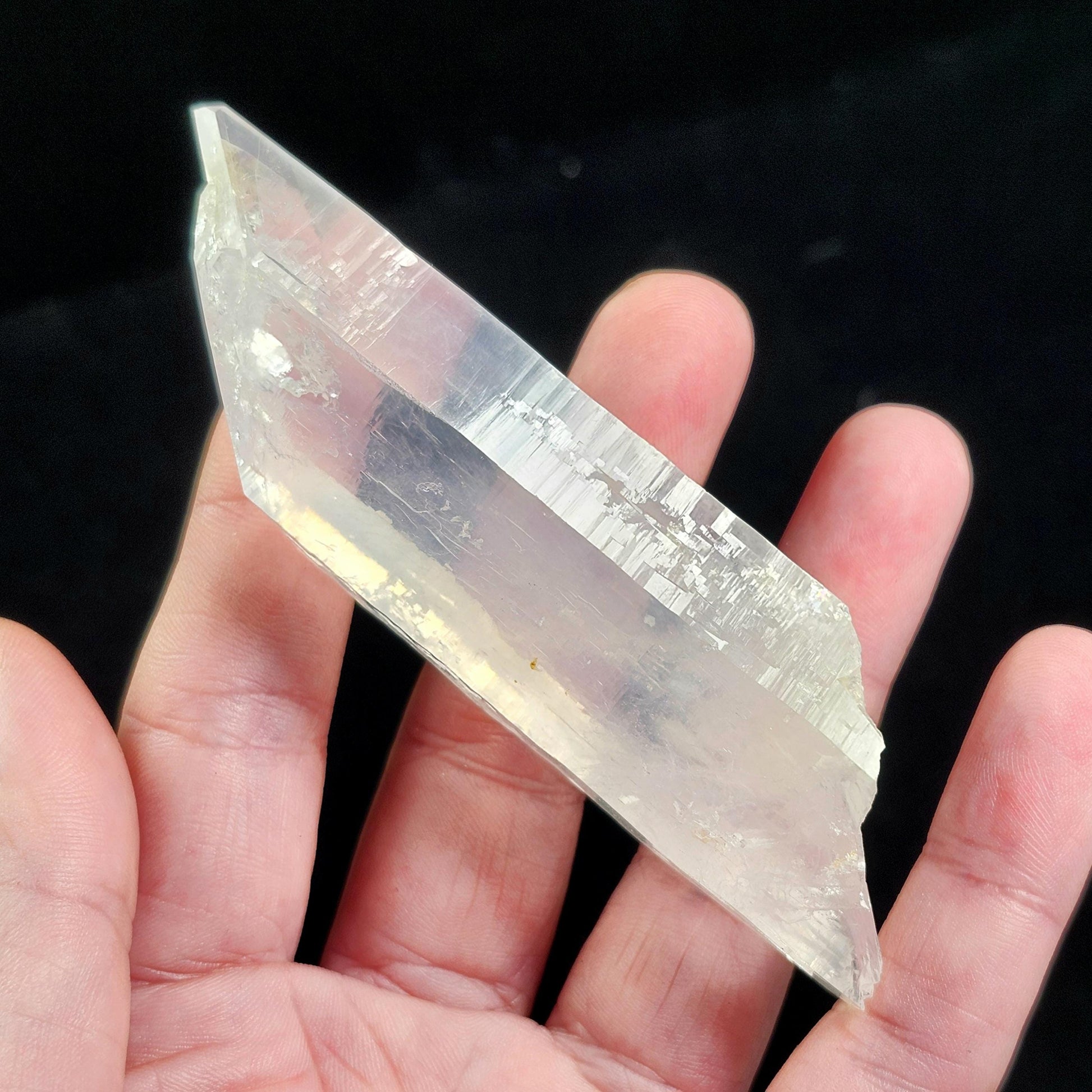 This Colombian Quartz crystal exhibits faint wisps of Amphibole mineral inclusions that appear as a blue-tinged, smoky chatoyancy within. These inclusions can resemble wings or shoot through like needles, giving them their respective pseudonyms. This shimmering effect becomes vibrant at just the right angle. This Lemurian Seed stone displays classic etchings on its lustrous surface and has natural termination. This specimen measures approximately 90mm by 25mm and weighs 85 grams.