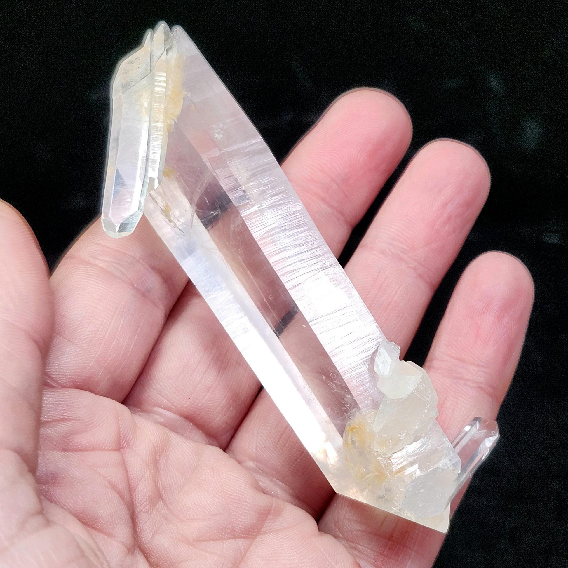 This Colombian Quartz crystal exhibits faint wisps of Amphibole mineral inclusions that appear as a blue-tinged, smoky chatoyancy within. This shimmering effect becomes vibrant at just the right angle. These wispy inclusions can resemble wings or shoot through like needles, giving them their respective pseudonyms This Lemurian Seed stone displays classic etchings on its lustrous surface and has a terminated point, with stark bridge crystals protruding from it - bridge/manifestation crystals are formations where a termination grows partially or fully within a larger host crystal. This unique structure highlights a natural process of inclusion and intergrowth, representing the complex beauty of mineral development. This specimen measures approximately 84mm by 54mm and weighs 62.5 grams